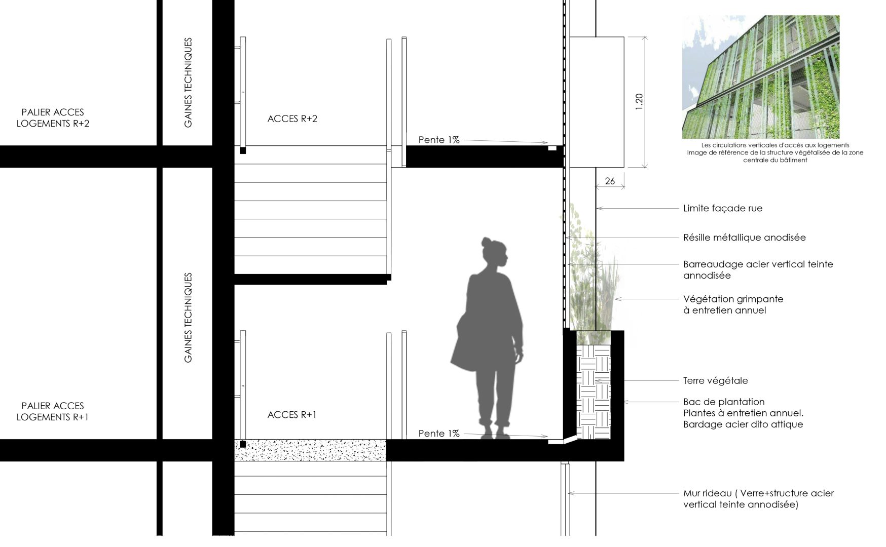 En façade principale, le rythme des ouvertures reprend celle des baies du bâtiment contigu. Des modénatures de briques en saillie prolongent le calepinage de briques du bâtiment voisin existant, afin de créer visuellement une lecture prolongée de la composition de rue. La volumétrie des quatre premiers niveaux est posée en alignement de la façade mitoyenne pour créer un front bâti traité en brique beige structurée ; en harmonie avec le reste des constructions. De plus, le niveau supérieur est construit en retrait avec un attique traité en bardage métallique de ton terre cuite, reprenant la teinte des toitures des constructions adjacentes. Il se détache du volume bas et se lit comme un élément léger n’alourdissant pas le reste du bâti (comme une maison sur le toit). La toiture de cet édifice sera une toiture plate de type terrasse, créant le moins d’impact visuel depuis la rue Neuve et le côté Est de la construction. La partie centrale du bâtiment ouverte sur la ville sera agrémentée par des bacs de plantation, apportant de la végétation en façade et soulignant l’ouverture du projet sur l’espace urbain. Cette porosité est une richesse créant une identité forte au bâtiment. La circulation y est fluide et généreuse facilitant les rencontres entre futurs occupants.