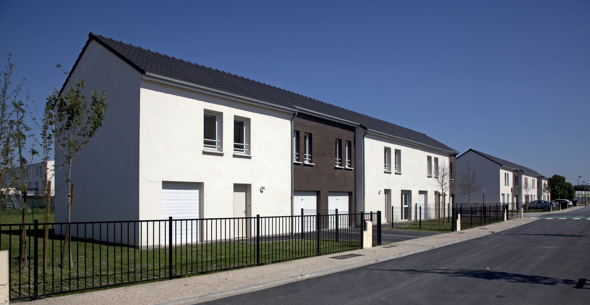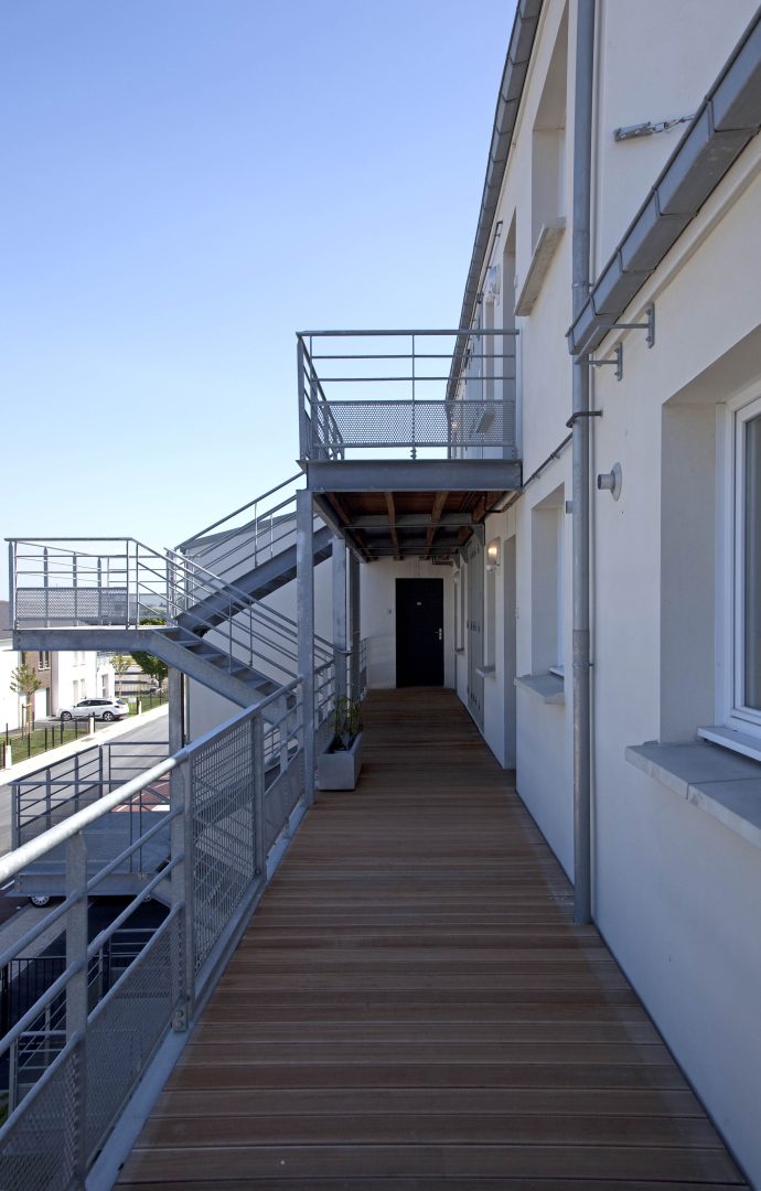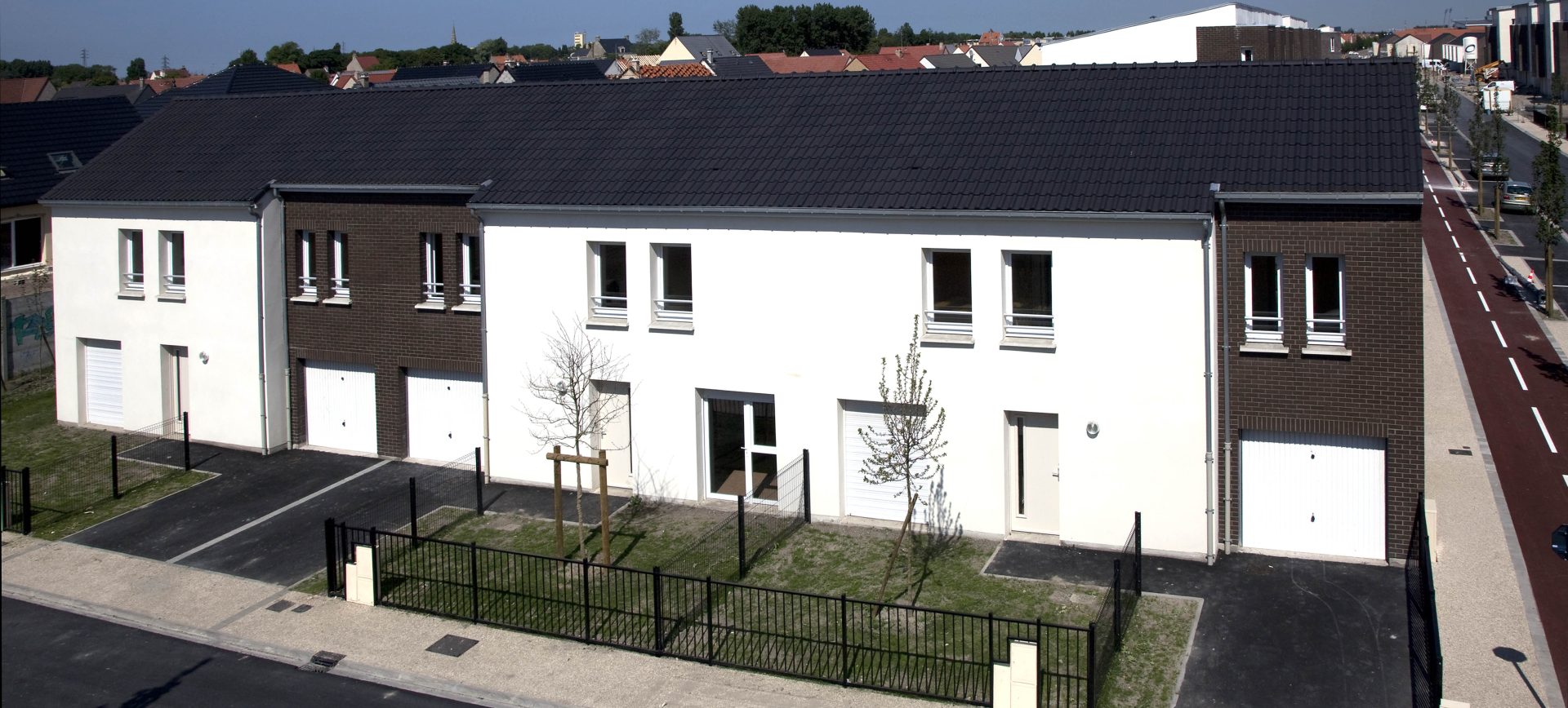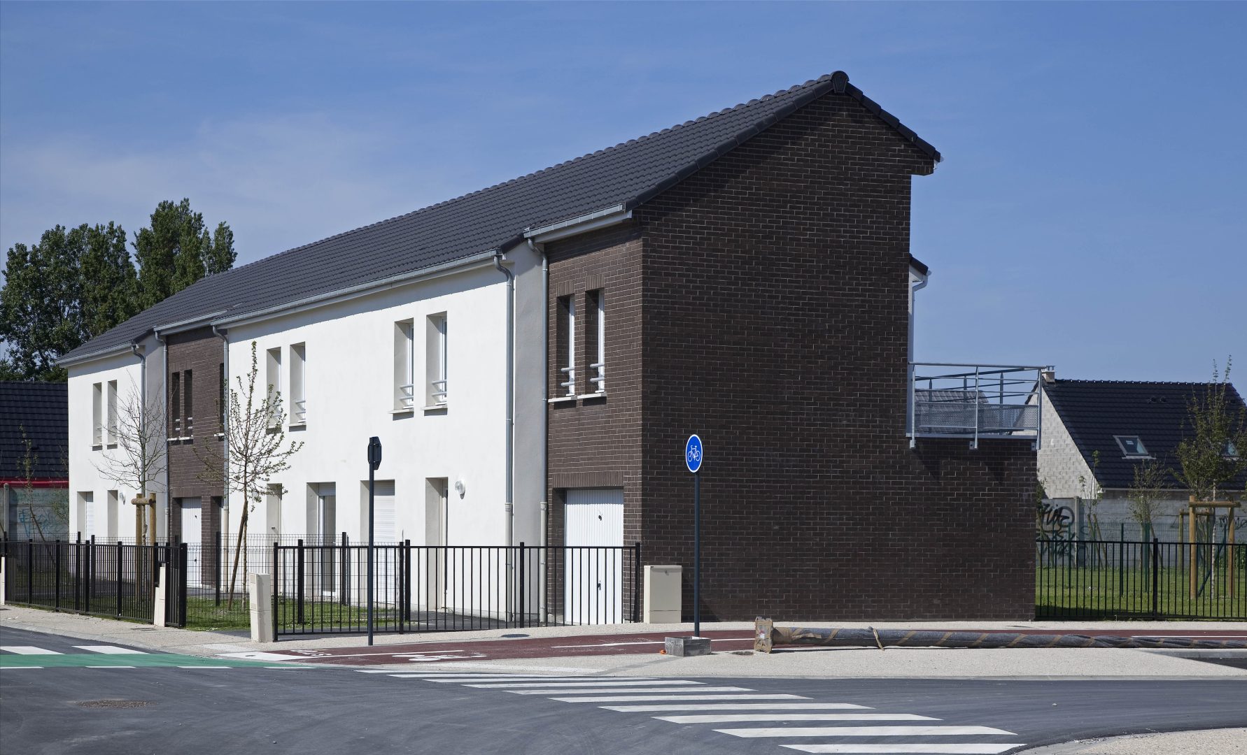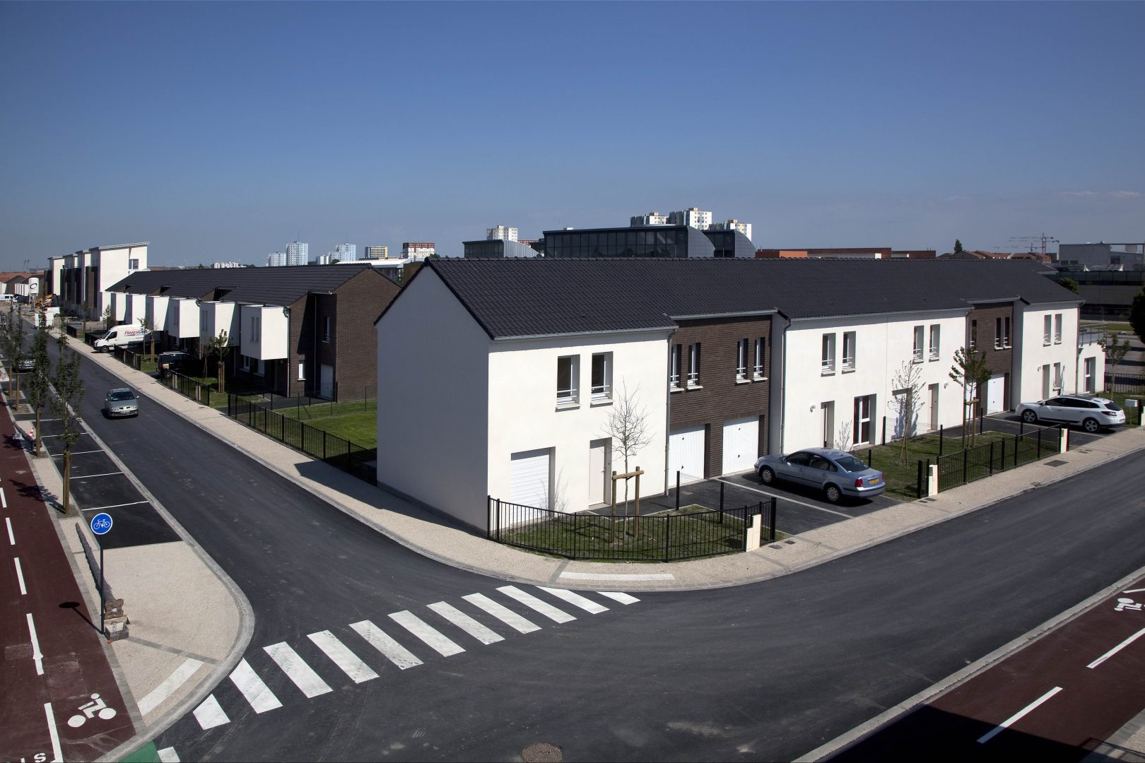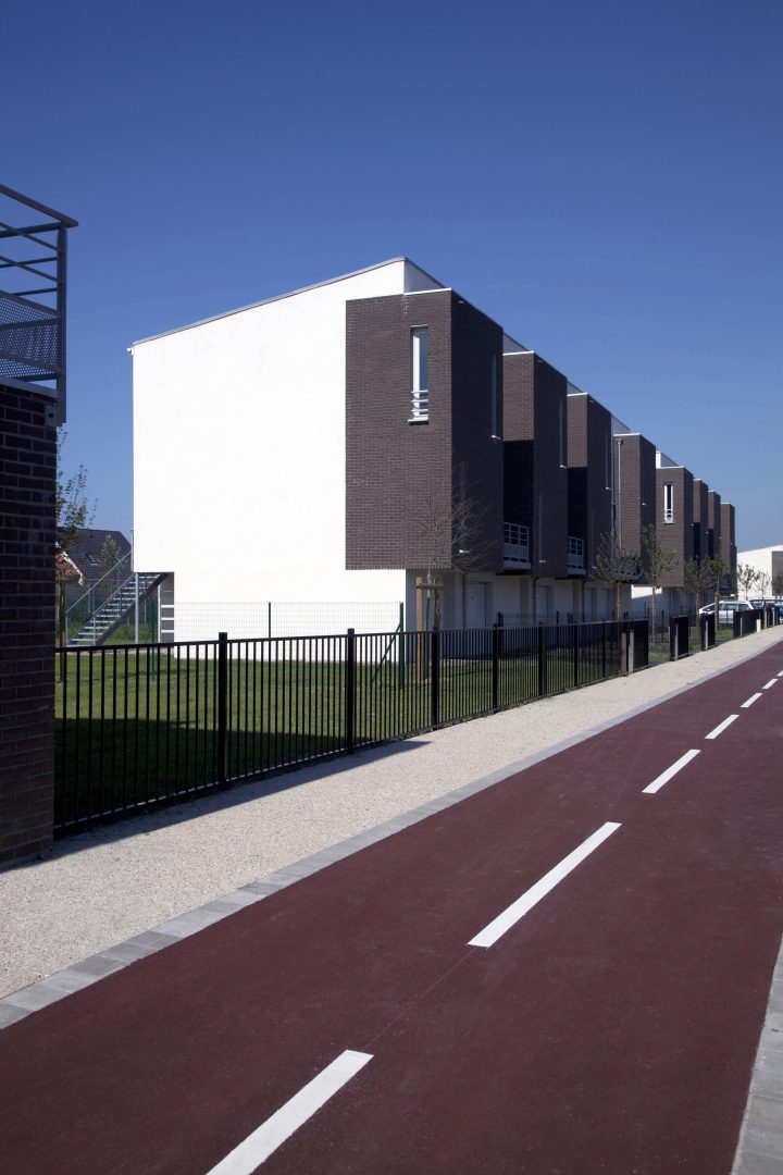 Les façades sont habillées de brique ou d’enduit. L’ensemble de ces matériaux sont pérennes et ne demandent pas d’entretien particulier. Les logements sont largement ouverts au Sud et à l’Ouest afin de favoriser la lumière naturelle à l’intérieur. La majorité des séjours ont une double orientation ou bénéficie de deux orientations de façon à bénéficier d’un éclairement optimal. Les logements collectifs bénéficient de balcon ou terrasse afin de prolonger l’espace intérieur, les maisons individuelles ont des jardins privatifs à l’avant et à l’arrière. Les coursives des logements collectifs sont entièrement désolidarisées des murs afin de limiter la propagation des bruits de choc vers les logements contigus. Les cheminements extérieurs des logements et les locaux communs sont équipés de lampe basse consommation avec détecteurs crépusculaires et dispositif de programmation. Les appareils sanitaires disposent d’une robinetterie de type mitigeur disposant d’une butée et d’un bouton eco. Les WC ont une double commande avec robinet flotteur de classe NF1. Les chaudières des logements sont soit des chaudières mixtes à ventouse avec microaccumulationde chez saunier Duval type ThemaPlus, soit des chaudières à condensation de type Thema plus condens de chez Saunier Duval. Le projet s’organise autour d’une axe principal autour duquel vont venir s’implanter les logements. Cet axe est longé par une voie cyclable et des zones piétonnières.Les maisons individuelles disposent chacune d’un jardinet privatif à l’avant clôturé et d’un jardin privatif à l’arrière.
