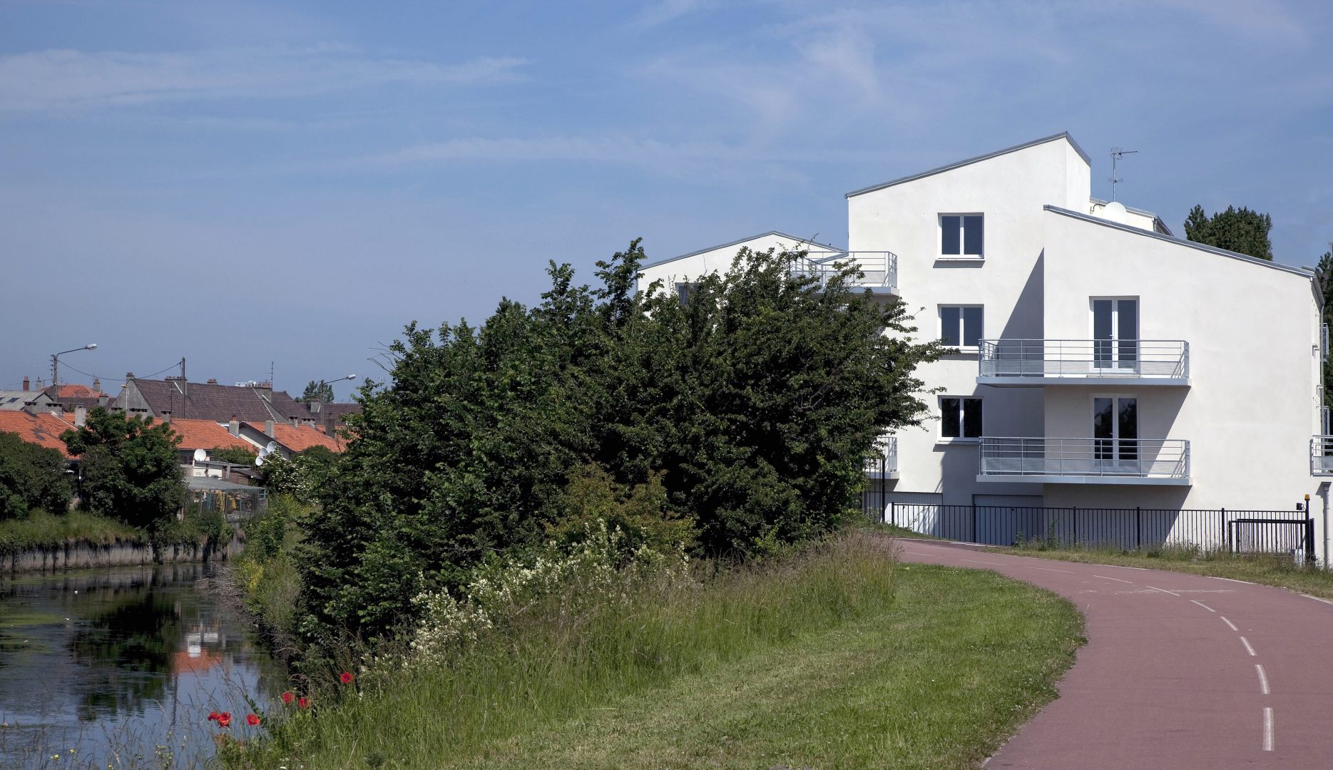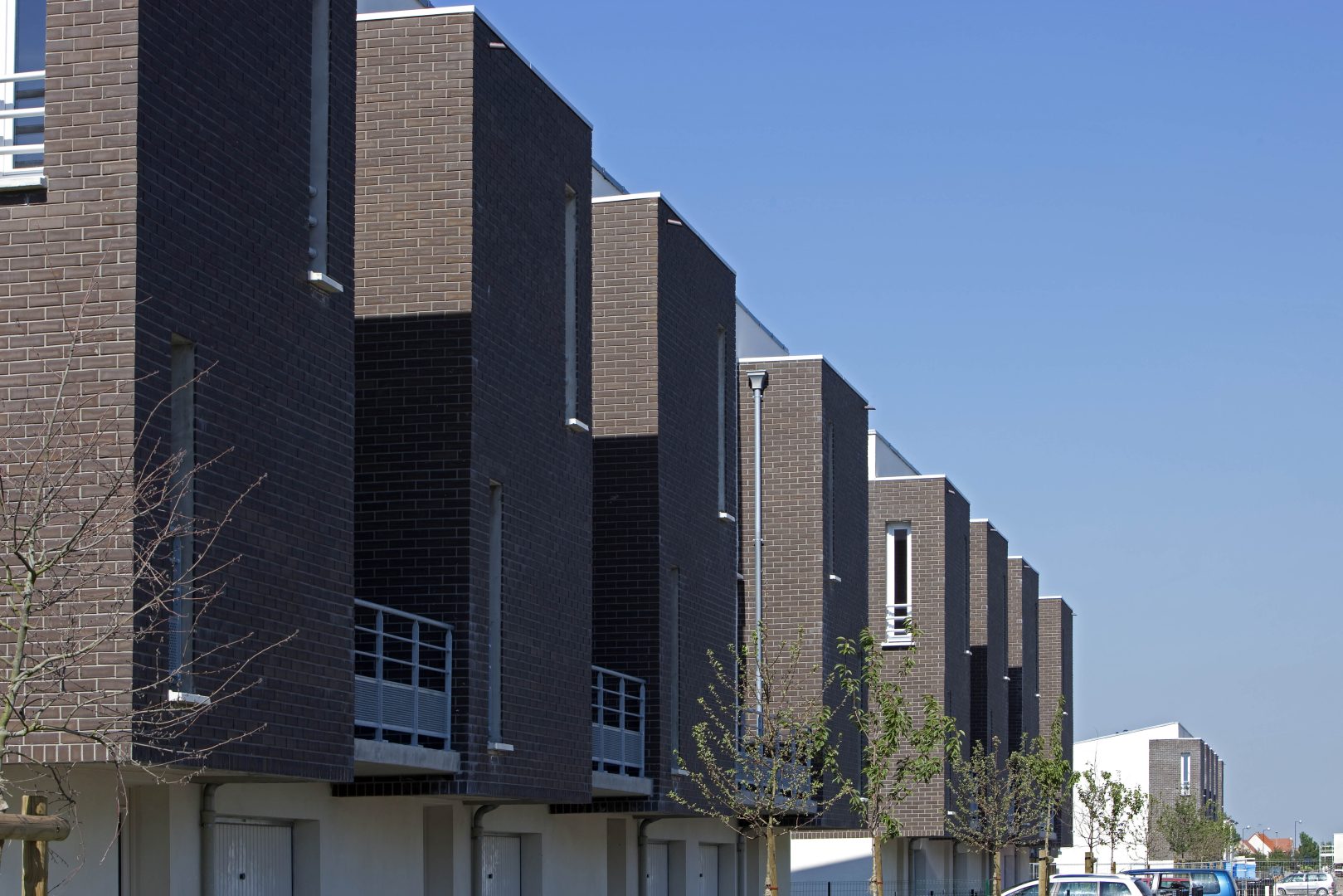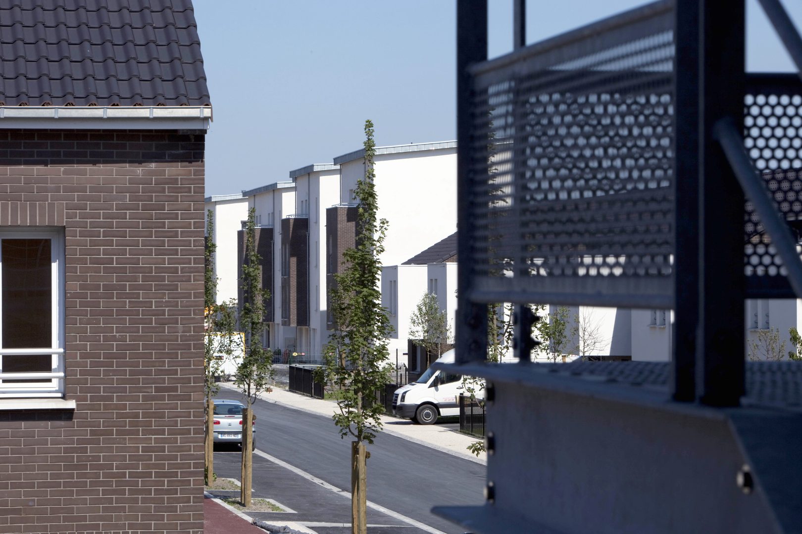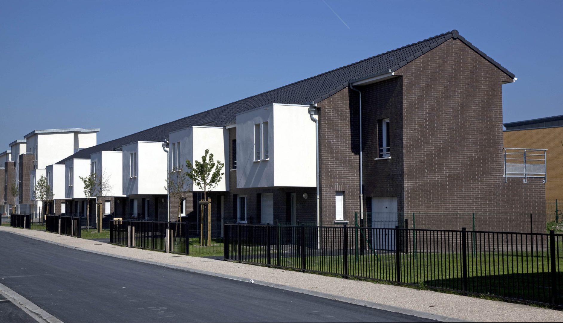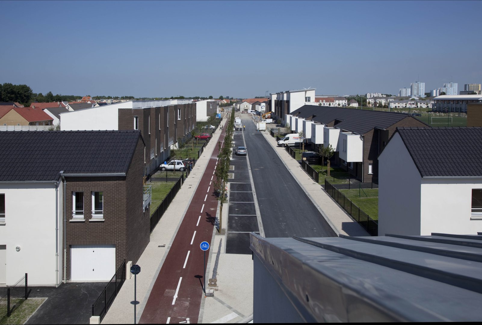 Les façades sont habillées de brique ou d’enduit. L’ensemble de ces matériaux sont pérennes et ne demandent pas d’entretien particulier. Les logements sont largement ouverts au Sud et à l’Ouest afin de favoriser la lumière naturelle à l’intérieur. La majorité des séjours ont une double orientation ou bénéficie de deux orientations de façon à bénéficier d’un éclairement optimal. Les logements collectifs bénéficient de balcon ou terrasse afin de prolonger l’espace intérieur, les maisons individuelles ont des jardins privatifs à l’avant et à l’arrière. Les coursives des logements collectifs sont entièrement désolidarisées des murs afin de limiter la propagation des bruits de choc vers les logements contigus. Les cheminements extérieurs des logements et les locaux communs sont équipés de lampe basse consommation avec détecteurs crépusculaires et dispositif de programmation. Les appareils sanitaires disposent d’une robinetterie de type mitigeur disposant d’une butée et d’un bouton eco. Les WC ont une double commande avec robinet flotteur de classe NF1. Les chaudières des logements sont soit des chaudières mixtes à ventouse avec microaccumulationde chez saunier Duval type ThemaPlus, soit des chaudières à condensation de type Thema plus condens de chez Saunier Duval. Le projet s’organise autour d’une axe principal autour duquel vont venir s’implanter les logements. Cet axe est longé par une voie cyclable et des zones piétonnières.Les maisons individuelles disposent chacune d’un jardinet privatif à l’avant clôturé et d’un jardin privatif à l’arrière.