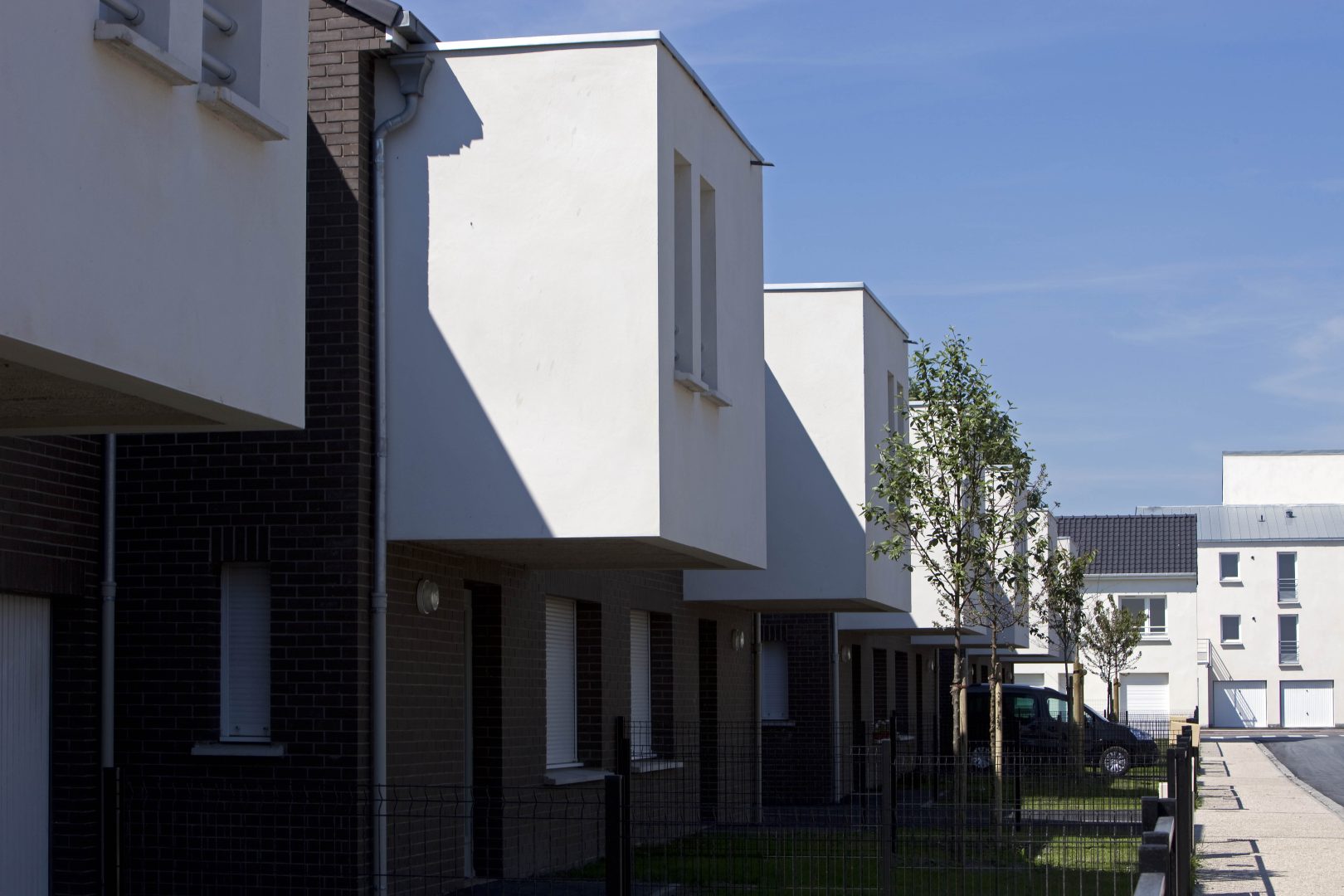 Cinq types d’habitation constituent ce projet. La maison de ville occupe la partie nord du site. Les pièces de vie sont situées au R+1 afin de profiter au maximum de l’ensoleillement tout en offrant des pièces de vie plus intime tout en ayant une double orientation. Les espaces techniques s’organisent au RDC. L’espace couvert du RDC par la terrasse du séjour offre un espace abrité. L’espace nuit est situé au dernier étage. La façade sur rue est marquée par un volume vertical couvert de briques dans lequel se déroule les circulations verticales. La maison en bande type SUD, une maison mitoyenne s’organise sur deux niveaux, bénéficiant d’un séjour traversant. L’étage est réservé aux espaces de nuit. Le front à rue est rythmé par la volumétrie du bâti qui présente à la fois espaces en creux pour le garage et volumes en porte-à-faux pour les chambres. La création d’accès privé permet le cheminement vers le stationnement des véhicules situé au RDC du bâtiment. Les différents logements sont desservis par des coursives communes extérieures.