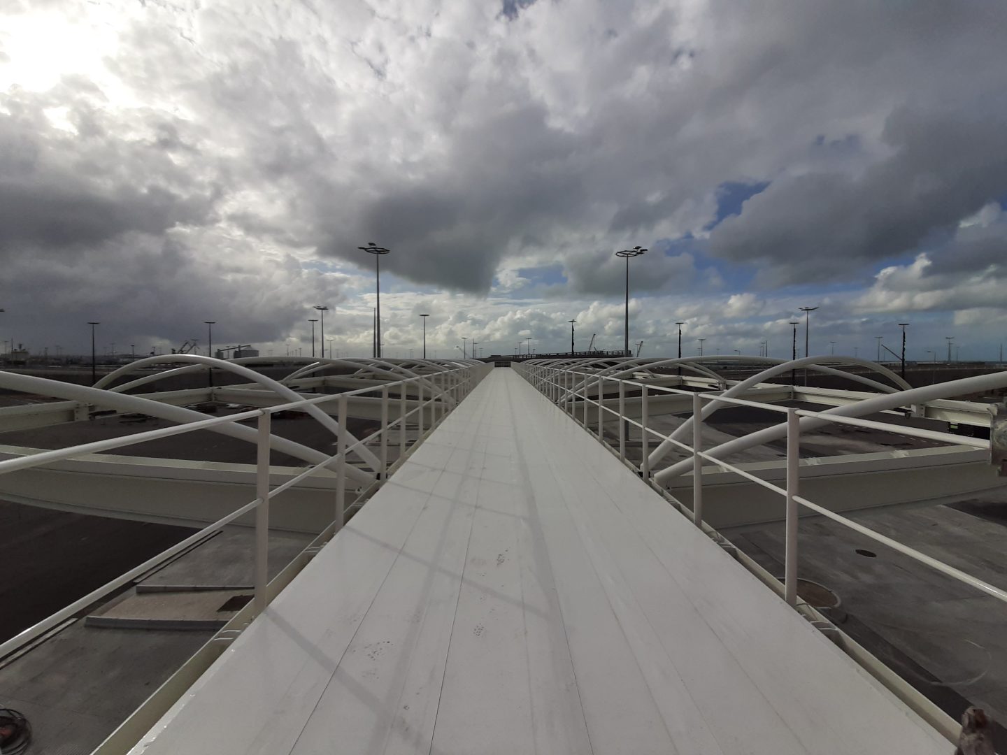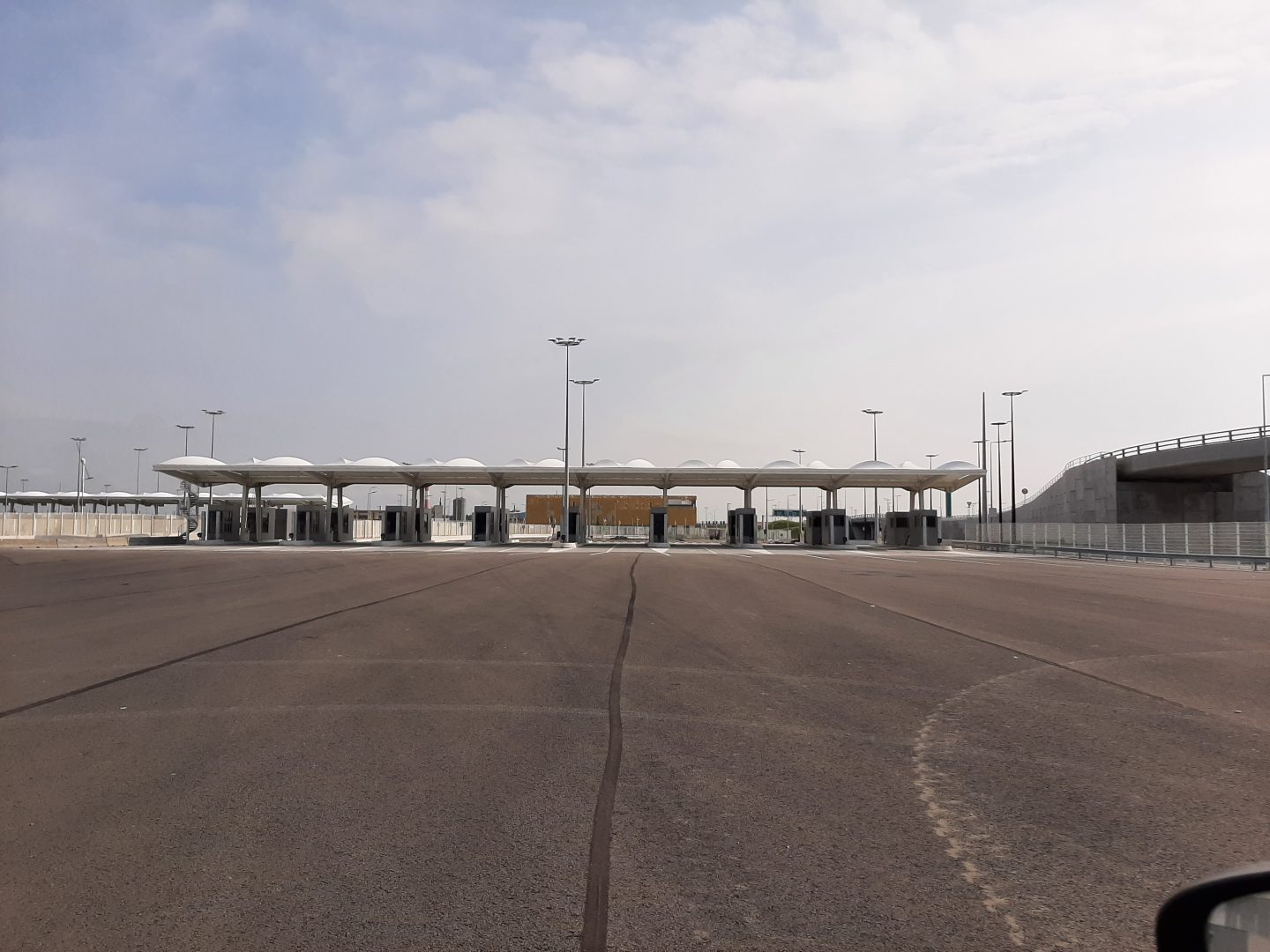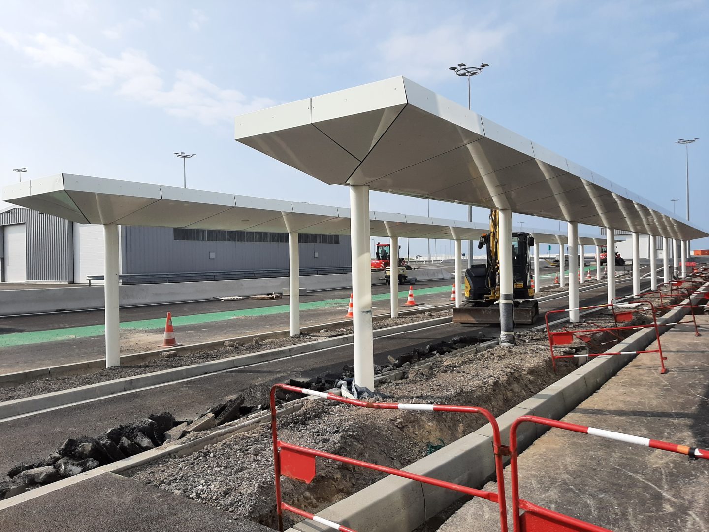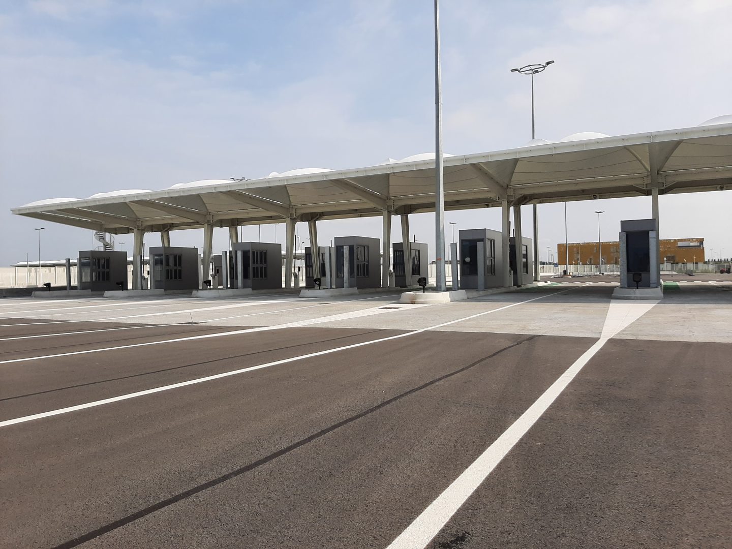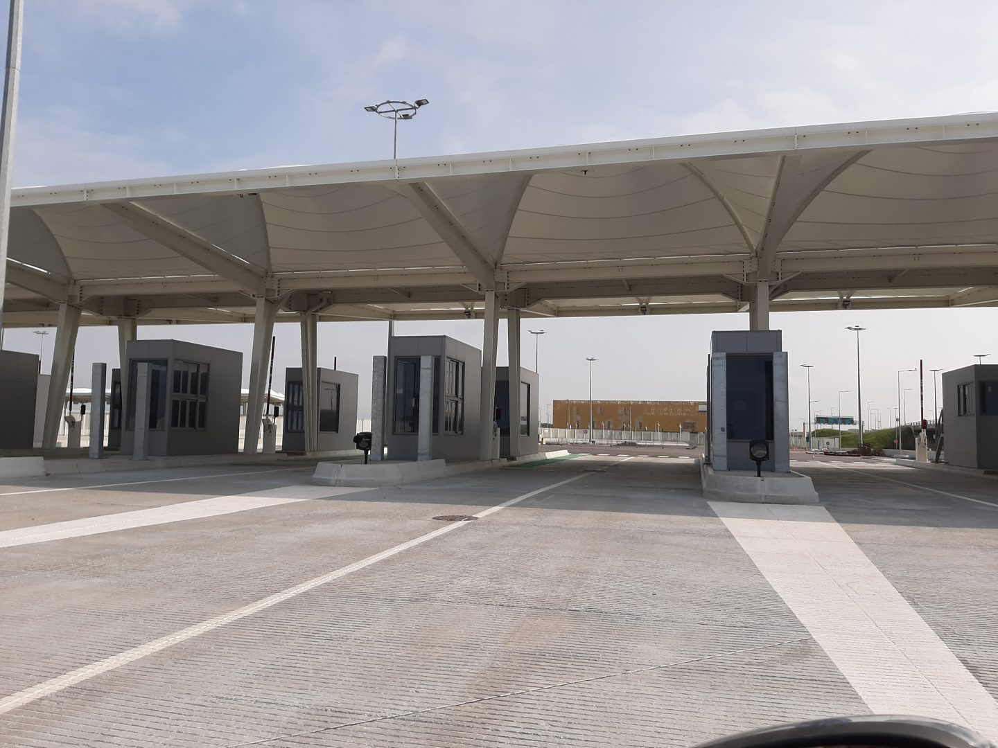Les auvents et guichets associés ponctuent le parcours des véhicules en transit. La ligne épurée très simples de leurs portiques blancs, couverts d’un textile en voile de bateau, signale aux utilisateurs les postes de contrôle tout en se mariant harmonieusement au site.