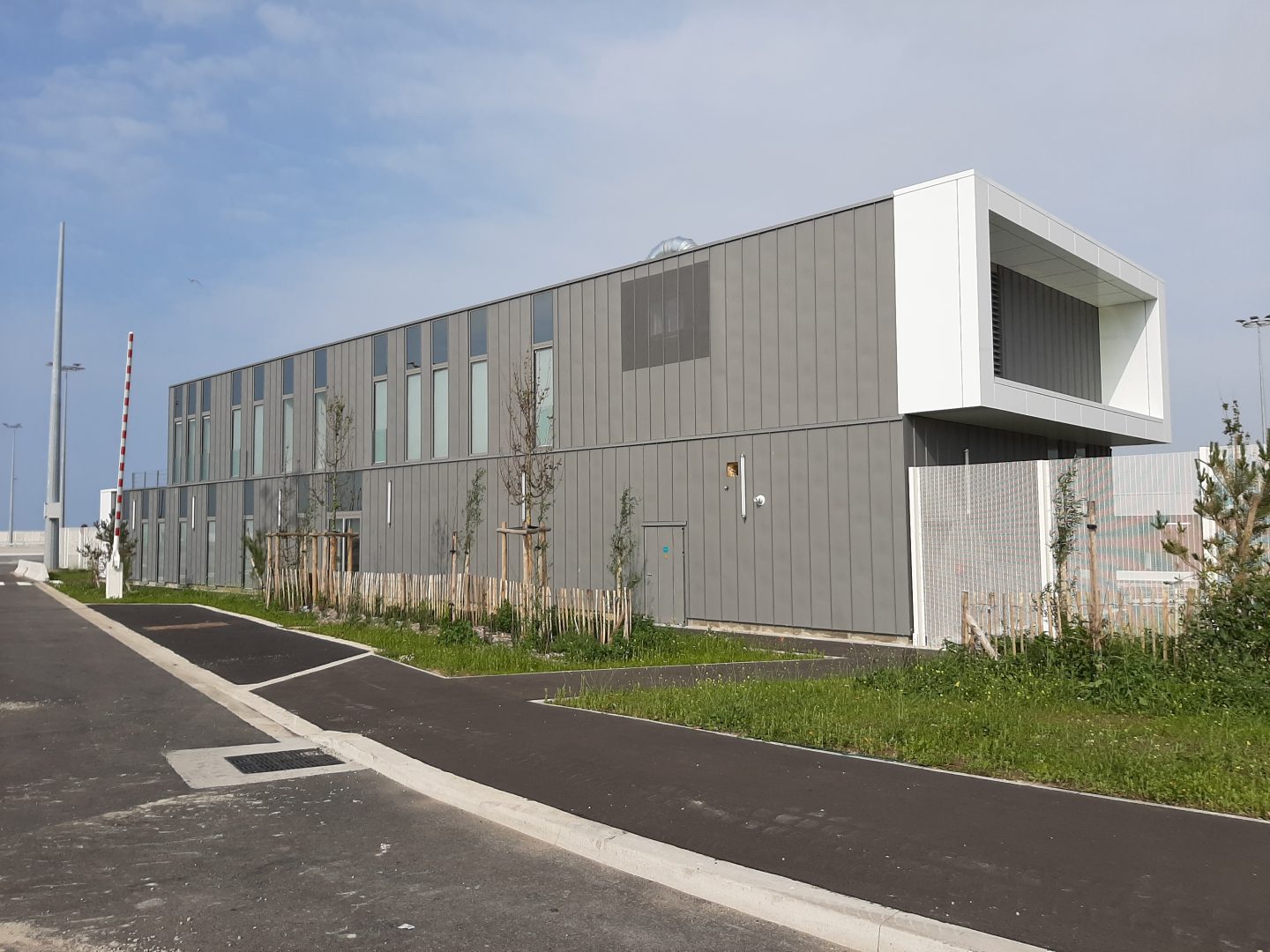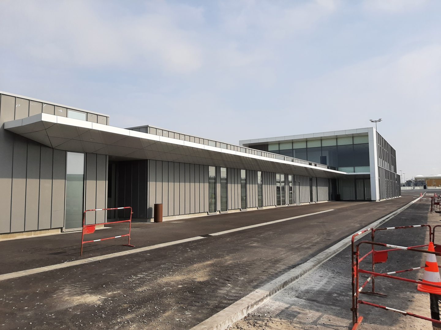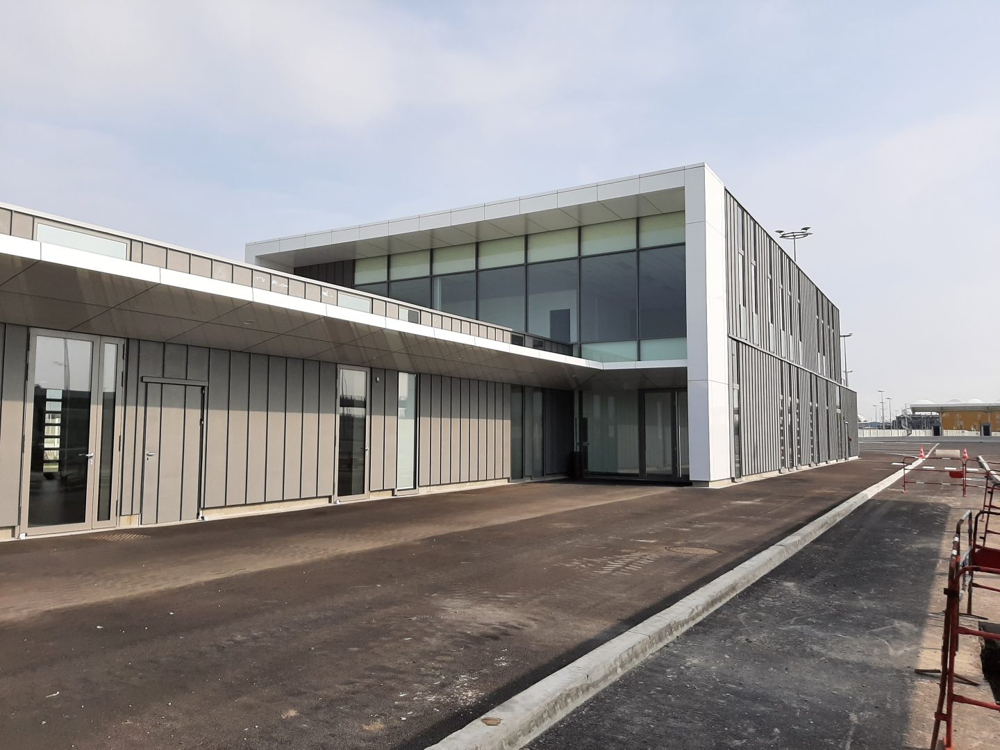 Ces deux bâtiment s’implantent parmi d’autres de bâtiments sociaux régliens, sur un îlot central autour duquel les flux de passagers transitent. Leurs façades en zinc à joint debout sont rythmées par des menuiseries toute hauteur et par le traitement de rive en bandeaux métalliques blancs irisés, qui mettent notamment en valeur les entrées du publics. Ils s’intègrent ainsi harmonieusement dans l’opération générale où une colorimétrie commune : gris moyen et blanc a été retenue pour l’ensemble des bâtiments du site sécurisé.