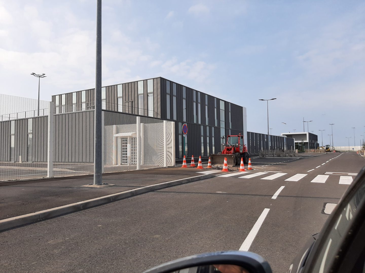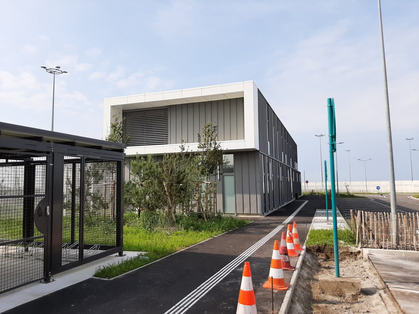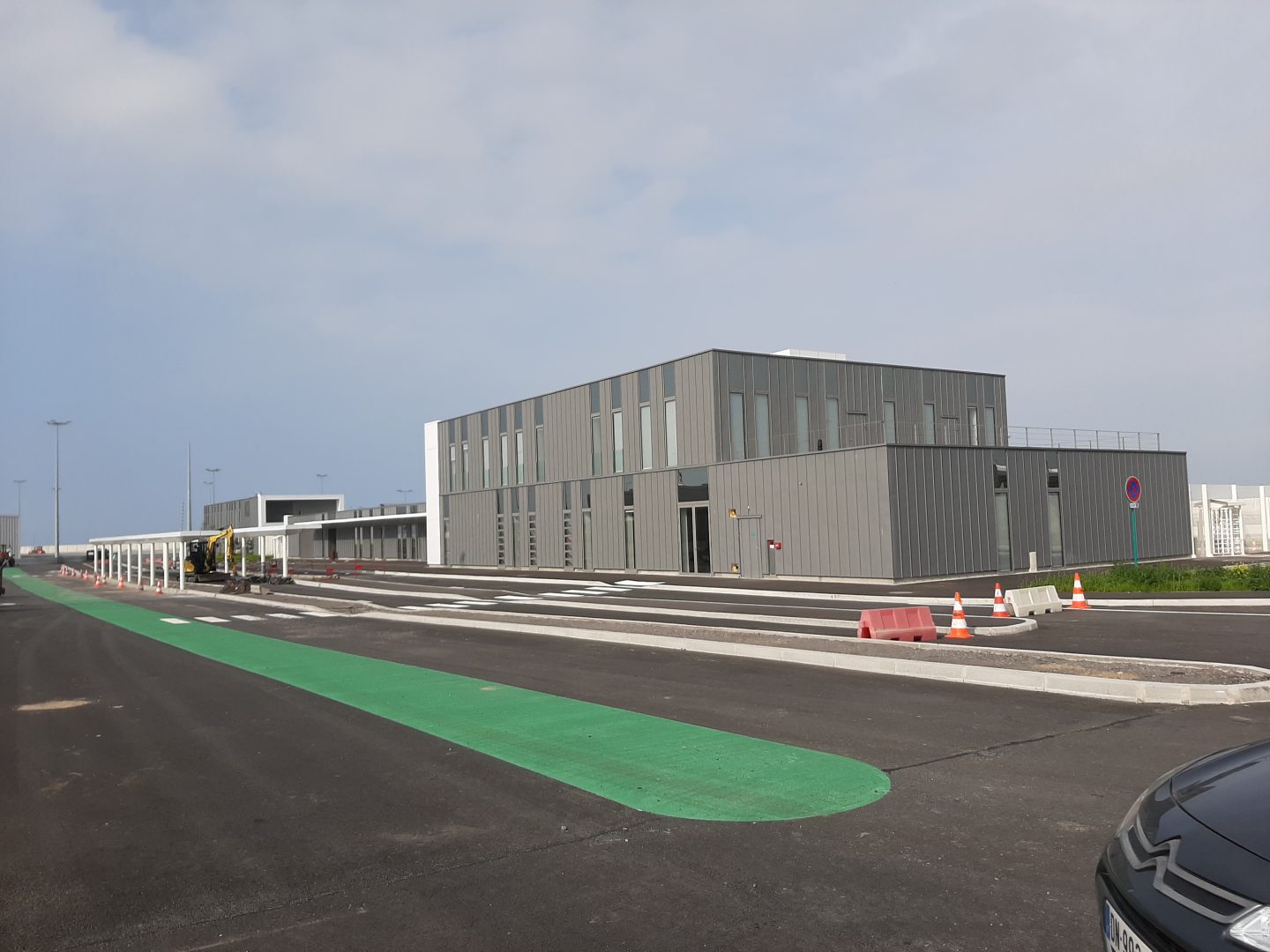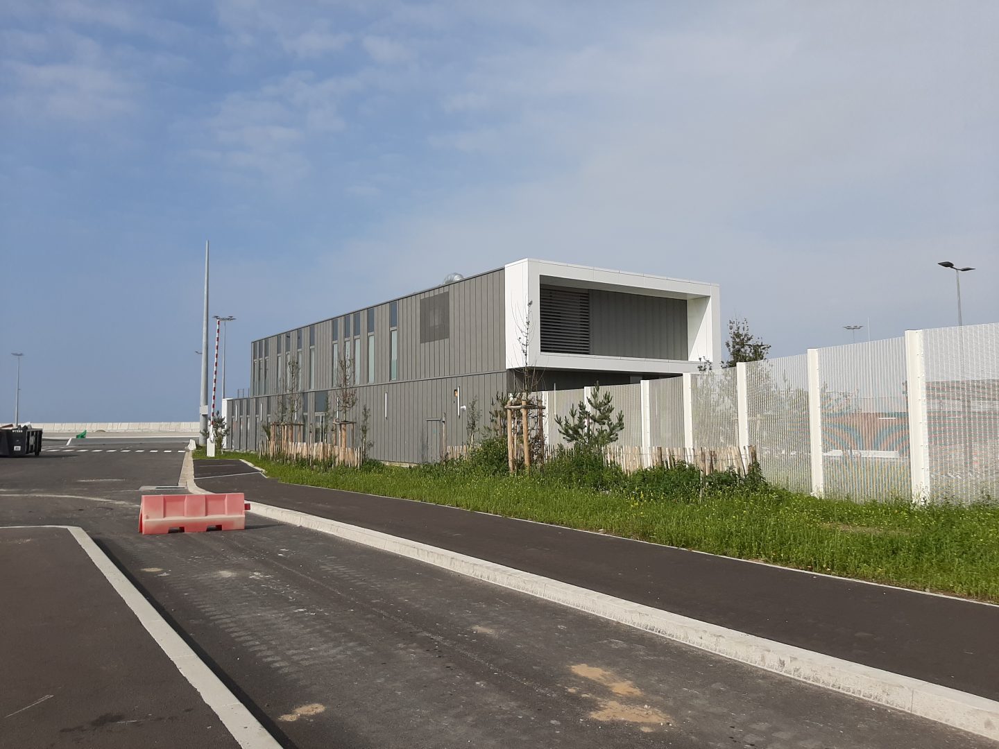 Ces deux bâtiment s’implantent parmi d’autres de bâtiments sociaux régliens, sur un îlot central autour duquel les flux de passagers transitent. Leurs façades en zinc à joint debout sont rythmées par des menuiseries toute hauteur et par le traitement de rive en bandeaux métalliques blancs irisés, qui mettent notamment en valeur les entrées du publics. Ils s’intègrent ainsi harmonieusement dans l’opération générale où une colorimétrie commune : gris moyen et blanc a été retenue pour l’ensemble des bâtiments du site sécurisé.