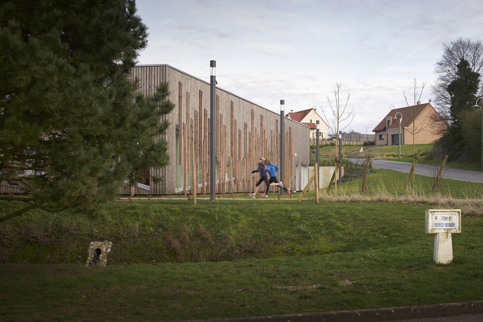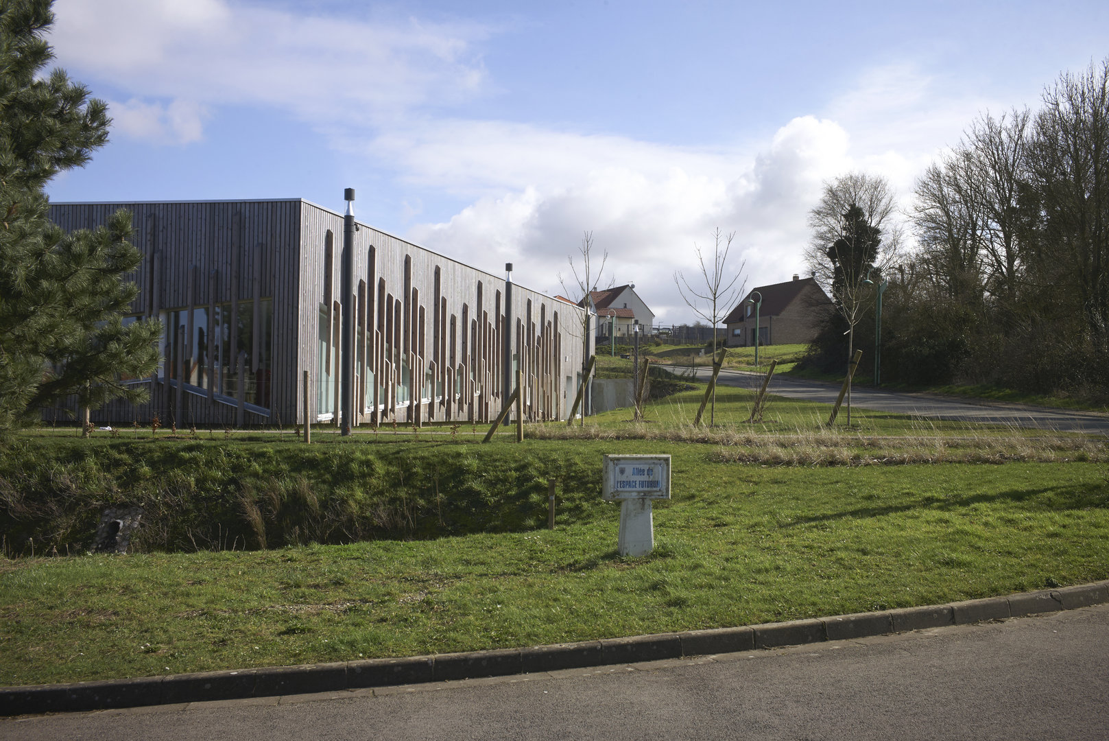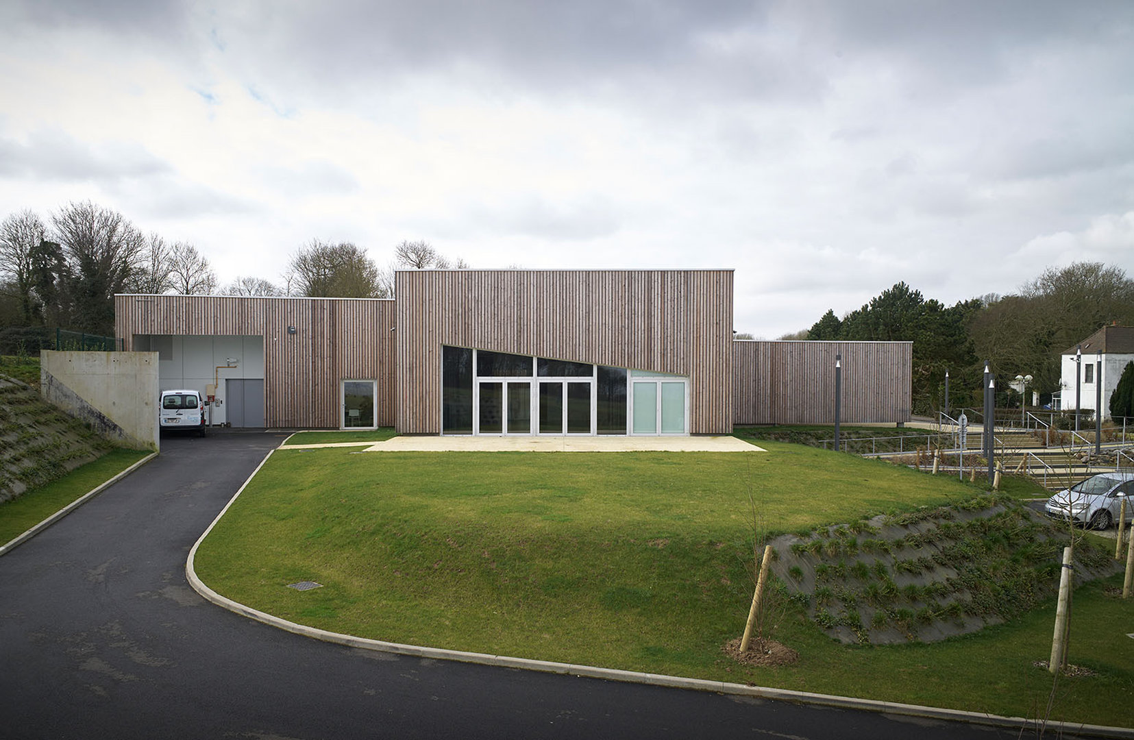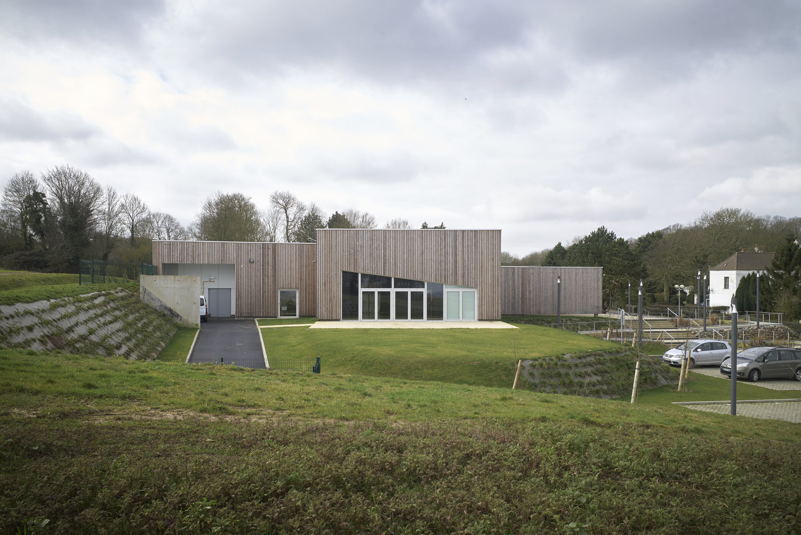 Le bâtiment se pose en surélévation par rapport à la voie du Futurum, tout en étant parfaitement intégré à la ligne de pente du terrain naturel sur lequel il vient buter. Le traitement des abords prend en compte la particularité du site et la déclivité du terrain. La partie Nord de la parcelle accueille la plupart des aménagement extérieurs, en créant une transition entre la circulation et le bâtiment. De la sorte, l’équipement est positionné sur un niveau qui le met en évidence et en valeur, pour qu’il prenne toute sa dimension culturelle et sociale.