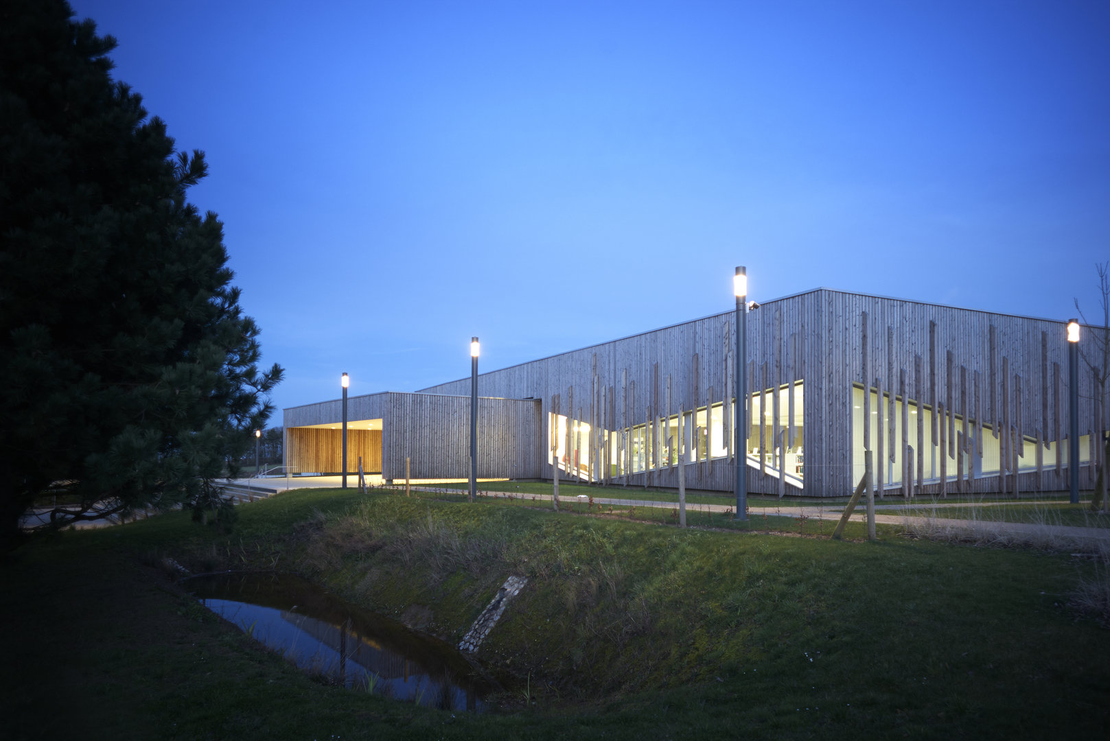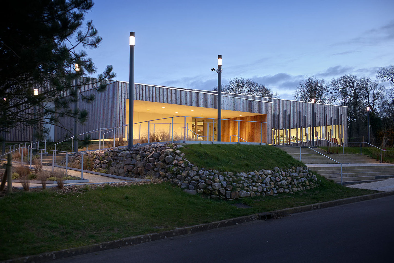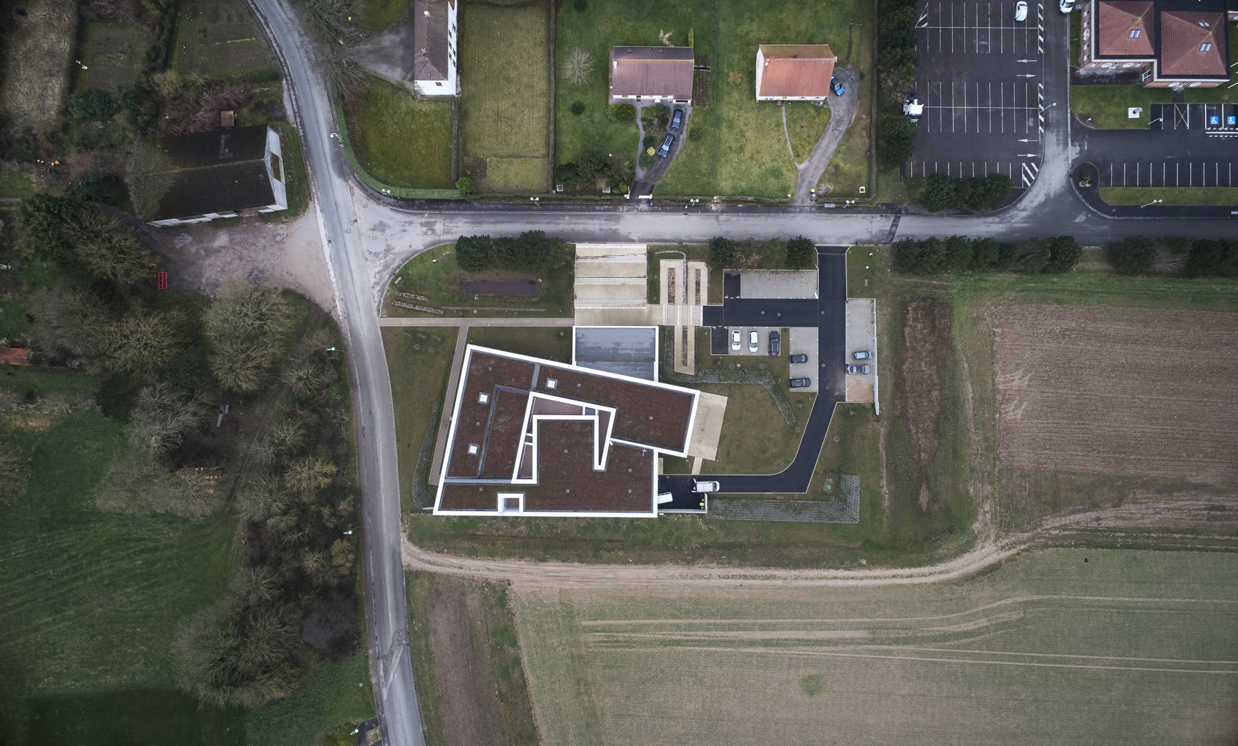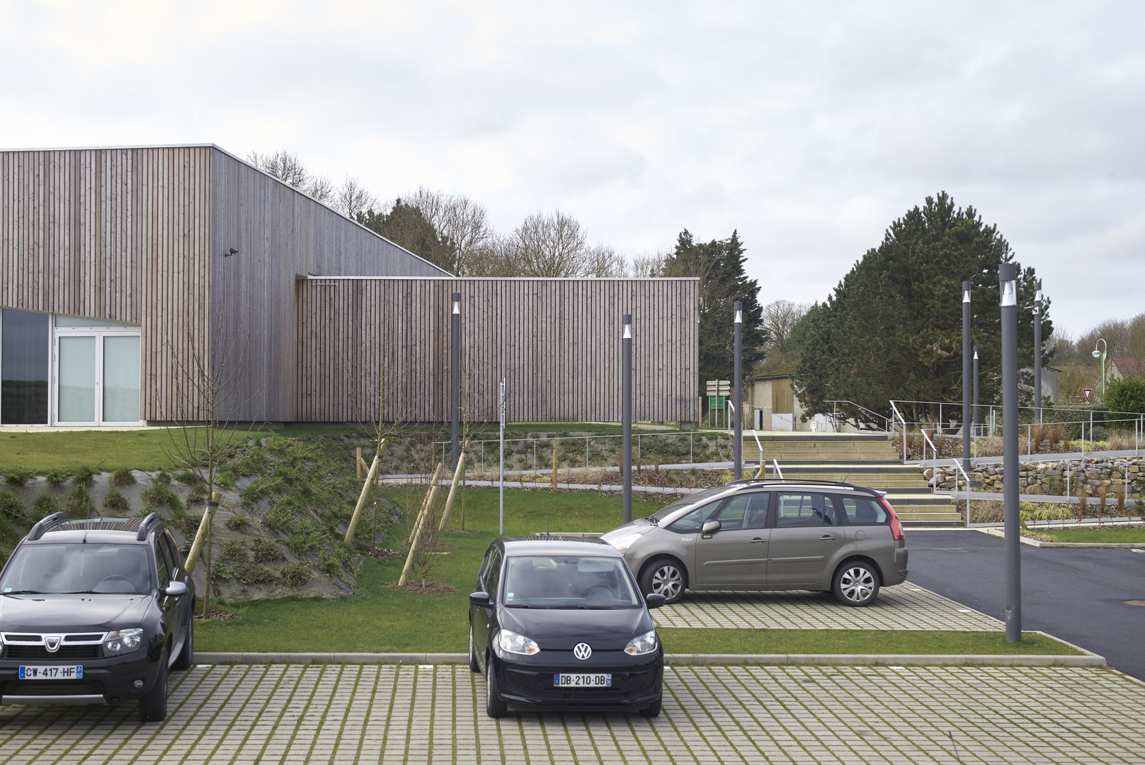 Le bâtiment se pose en surélévation par rapport à la voie du Futurum, tout en étant parfaitement intégré à la ligne de pente du terrain naturel sur lequel il vient buter. Le traitement des abords prend en compte la particularité du site et la déclivité du terrain. La partie Nord de la parcelle accueille la plupart des aménagement extérieurs, en créant une transition entre la circulation et le bâtiment. De la sorte, l’équipement est positionné sur un niveau qui le met en évidence et en valeur, pour qu’il prenne toute sa dimension culturelle et sociale.