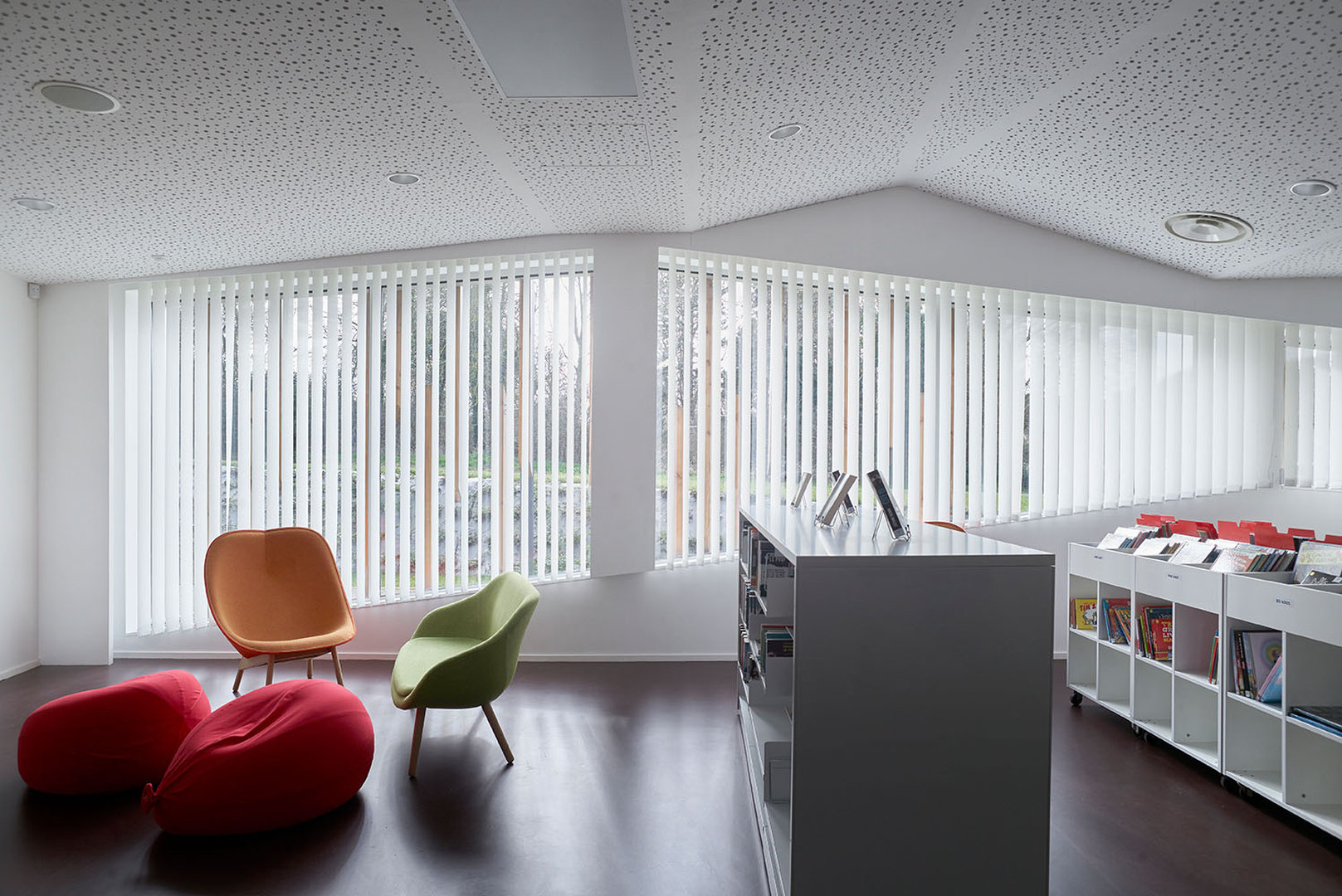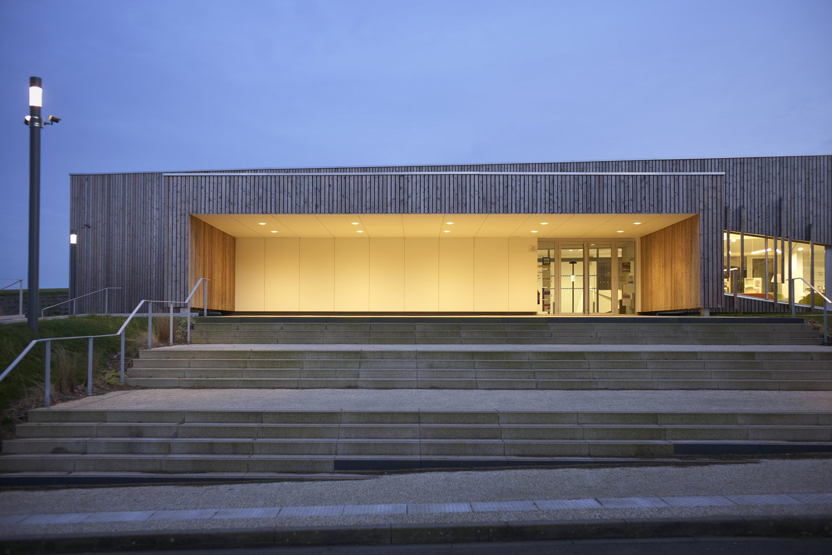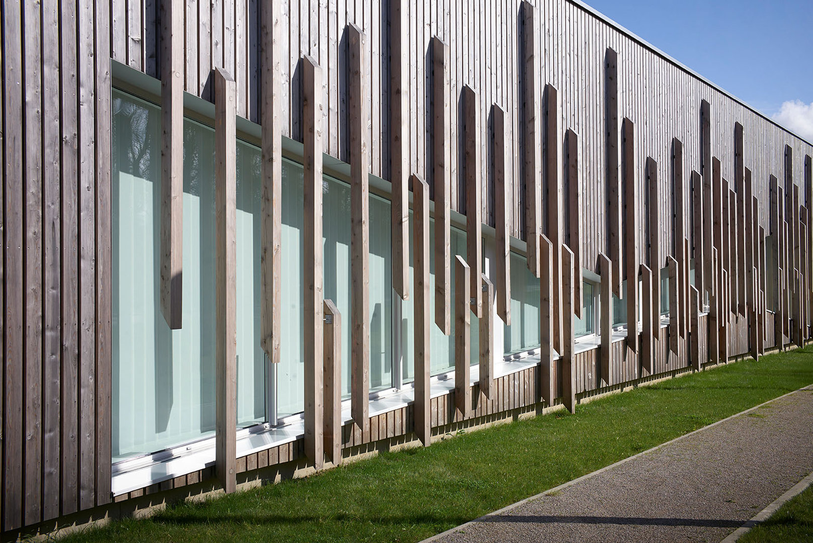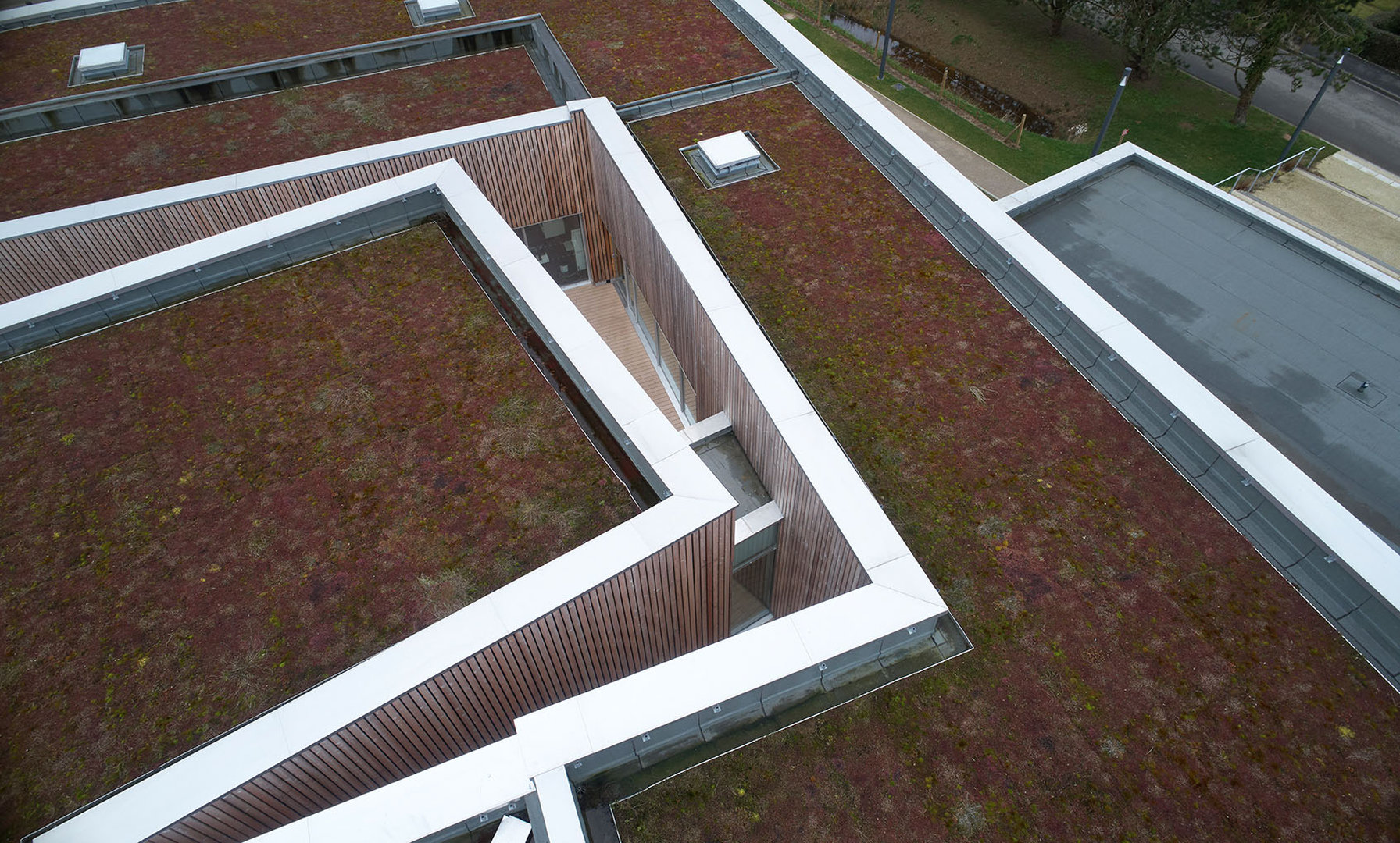 Le bâtiment se pose en surélévation par rapport à la voie du Futurum, tout en étant parfaitement intégré à la ligne de pente du terrain naturel sur lequel il vient buter. Le traitement des abords prend en compte la particularité du site et la déclivité du terrain. La partie Nord de la parcelle accueille la plupart des aménagement extérieurs, en créant une transition entre la circulation et le bâtiment. De la sorte, l’équipement est positionné sur un niveau qui le met en évidence et en valeur, pour qu’il prenne toute sa dimension culturelle et sociale.
