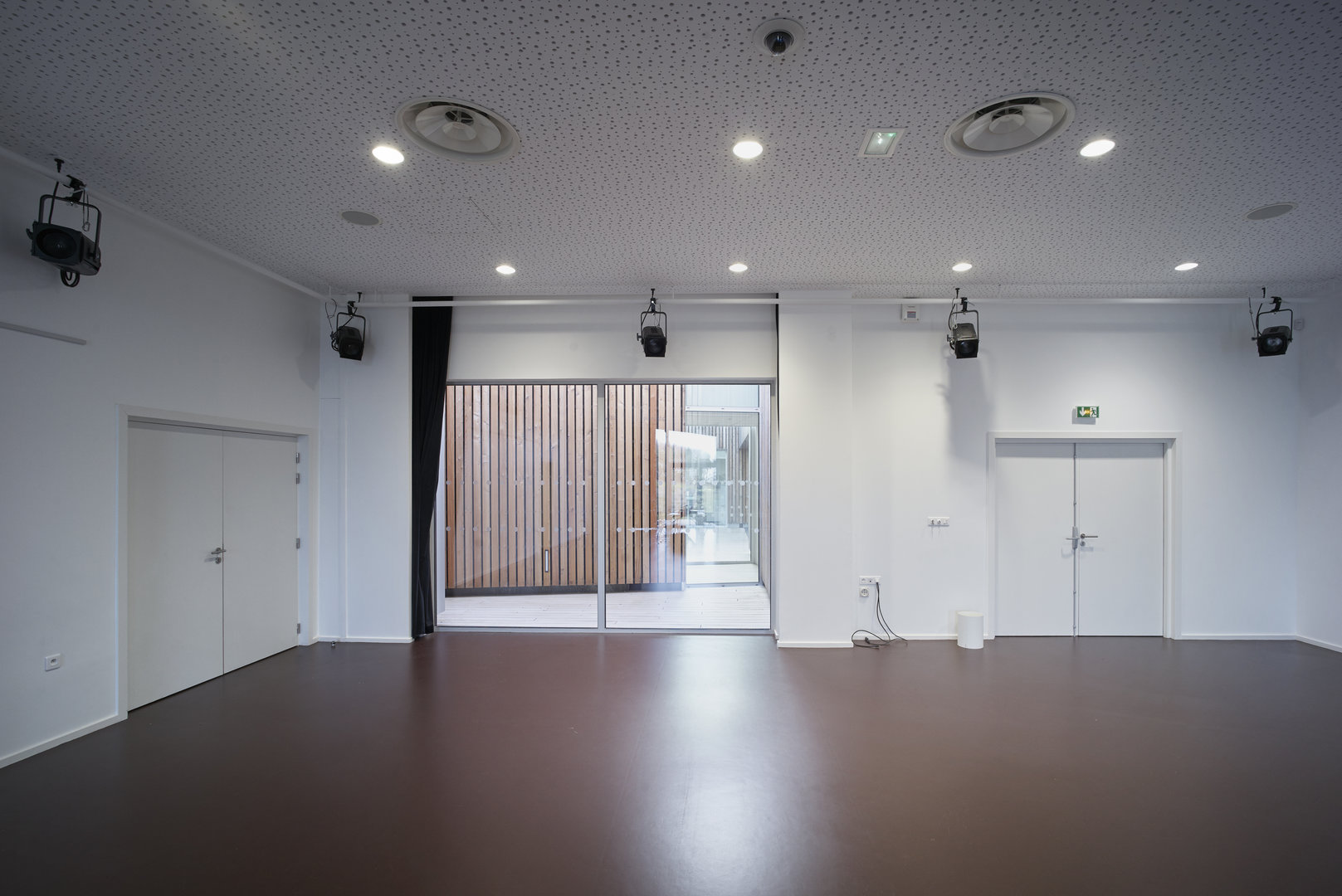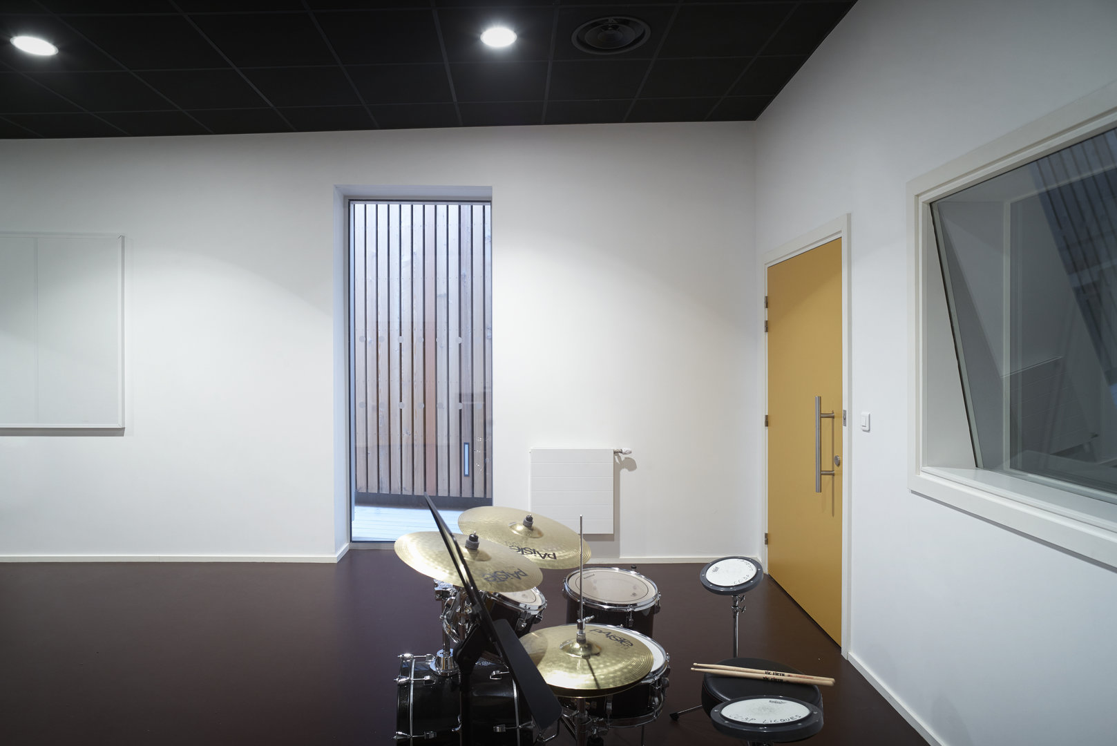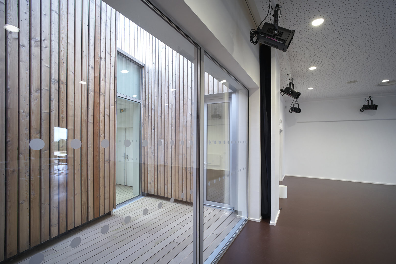 Une donnée fondamentale du programme était le pôle musique, car celle-ci implique de nombreuses contraintes dimensionnelles et acoustiques. C’est pourquoi nous avons conçu ce projet comme un ruban qui s’enroule sur lui-même, autour d’un patio, dans lequel viennent s’organiser toutes les fonctions. Ce patio accueille le pôle musique, cette disposition permet une communication très directe des différentes fonctions, tout en laissant le pôle « musique » parfaitement isolé acoustiquement de l’ensemble. Les transparences intérieures garantissent une fluidité visuelle dans l’ensemble de l’équipement en gardant la possibilité de séparer chaque fonction. Les espaces intermédiaires entre patio et locaux offrent des lieux de détente ou de respiration, mais aussi de véritables extensions pour les beaux jours. Chaque extrémité de ce volume « ruban » accueille pour l’une l’entrée principale, largement ouverte sur l’espace public, pour l’autre, une terrasse, prolongement de l’espace d’exposition en cas de manifestation. Cette volumétrie permet d’exploiter différentes hauteurs et ainsi de s’adapter à chaque fonction et à ses exigences techniques en terme de passage de réseaux ou autres contraintes structurelles.
