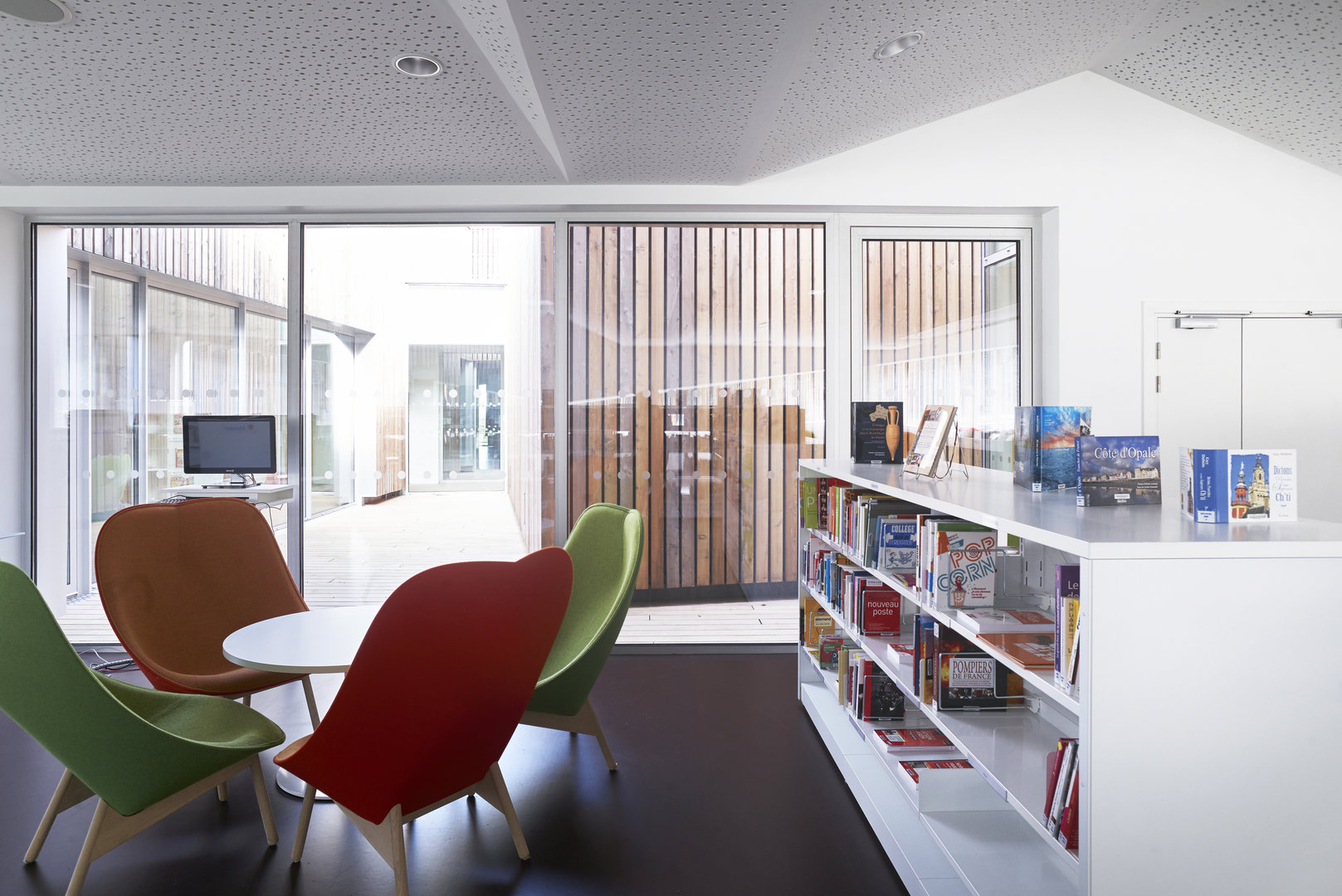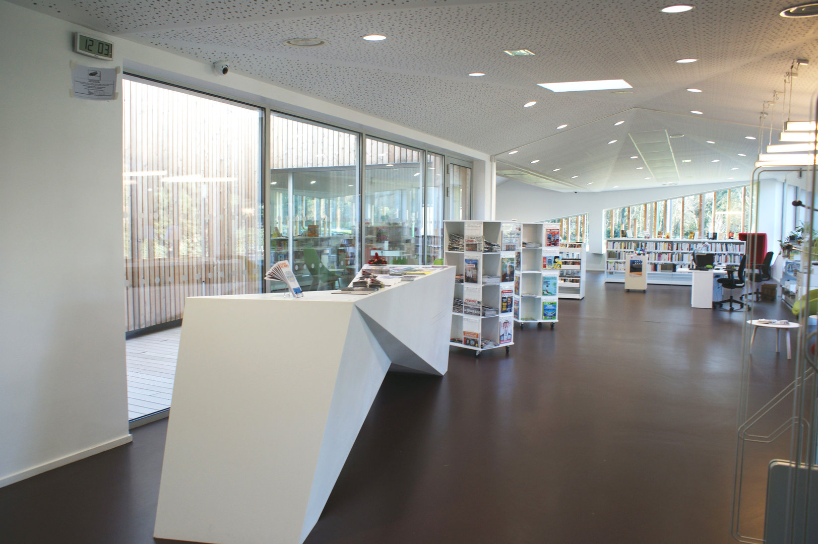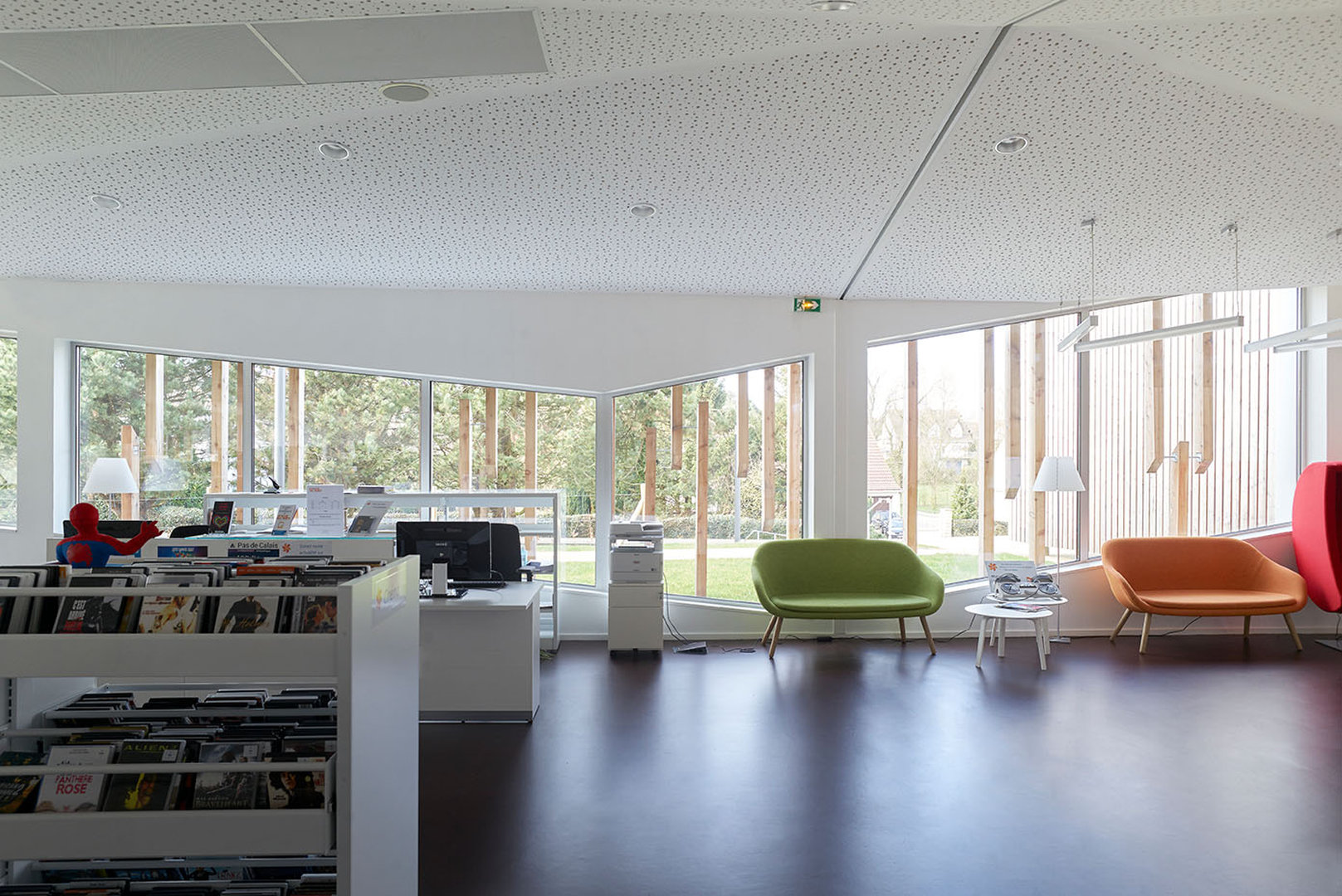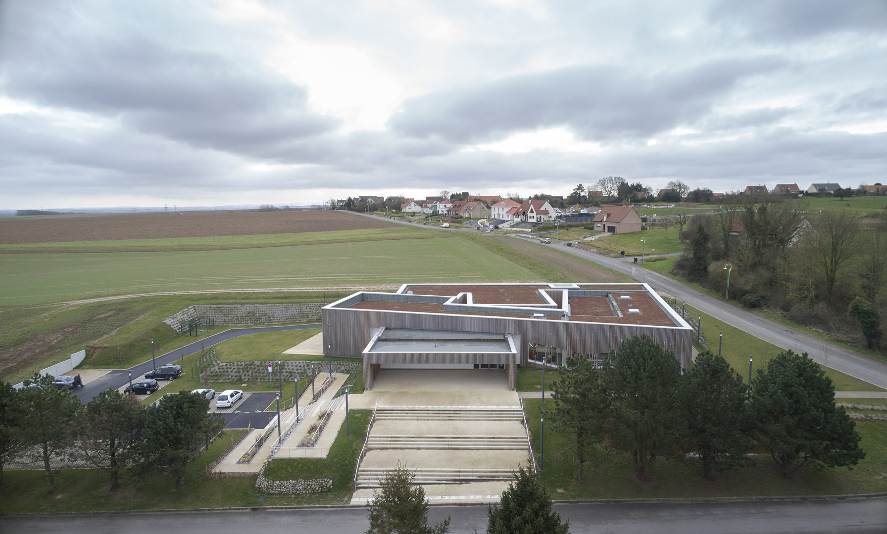 Parfaitement intégré dans le site par un jeu de terrassements et une toiture végétalisée qui en réalise la 3ème façade vue depuis le haut de la route de Fréthun et traité comme un repère, cet équipement culturel se doit d’être structurant dans l’aménagement de la commune. Les baies vitrées traitées comme des failles sur les façades prolongent l’expression de cette notion de jaillissement de la culture dans ce cadre très verdoyant. L’entrée principale est traitée comme une grande fenêtre ouverte sur la ville, symbole du service public qui est proposé.