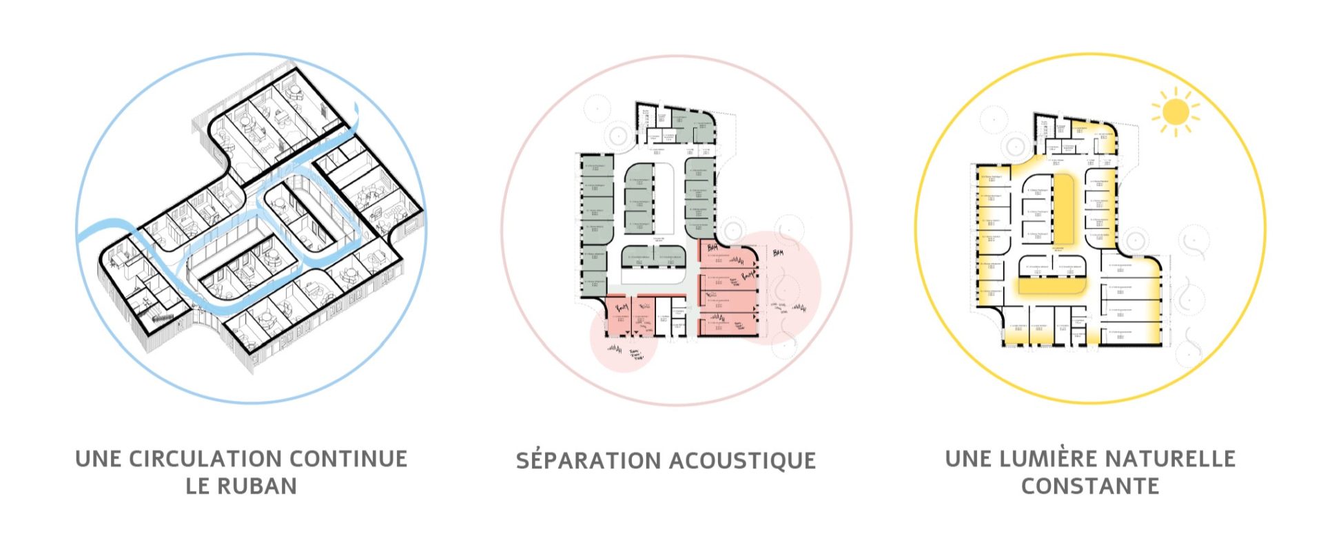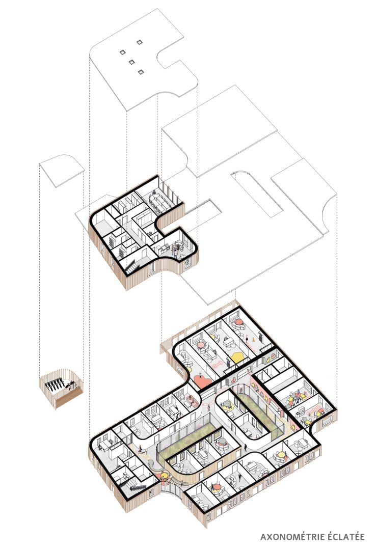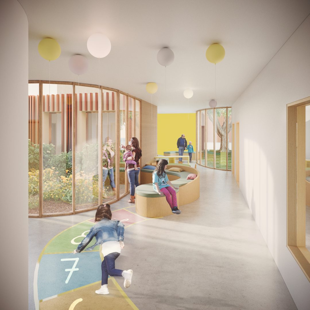 C’est au moyen d’un bardage métallique ajouré, mimant la couleur de la brique, que nous proposons aux patients, aux accompagnateurs et au personnel encadrant, un établissement dynamique, composé de façades dansant au rythme du soleil et vibrant avec la végétation qui l’entoure. Le mariage des matériaux choisis et des ambiances végétales est moteur de développement chez l’enfant et permettent de l’accueillir au sein d’une atmosphère chaleureuse et réconfortante s’ouvrant sur l’extérieur. De cette manière, l’architecture travaille d’elle-même sur l’inclusion des enfants et des adolescents et se positionne comme un lieu généreux emblématique du développement personnel.