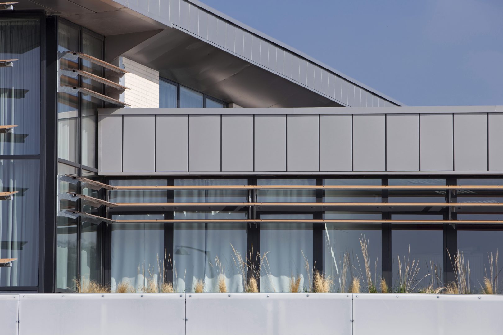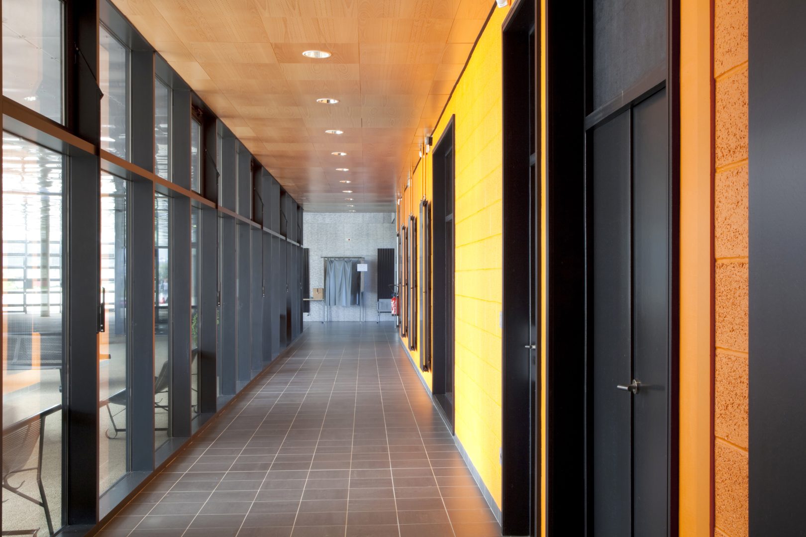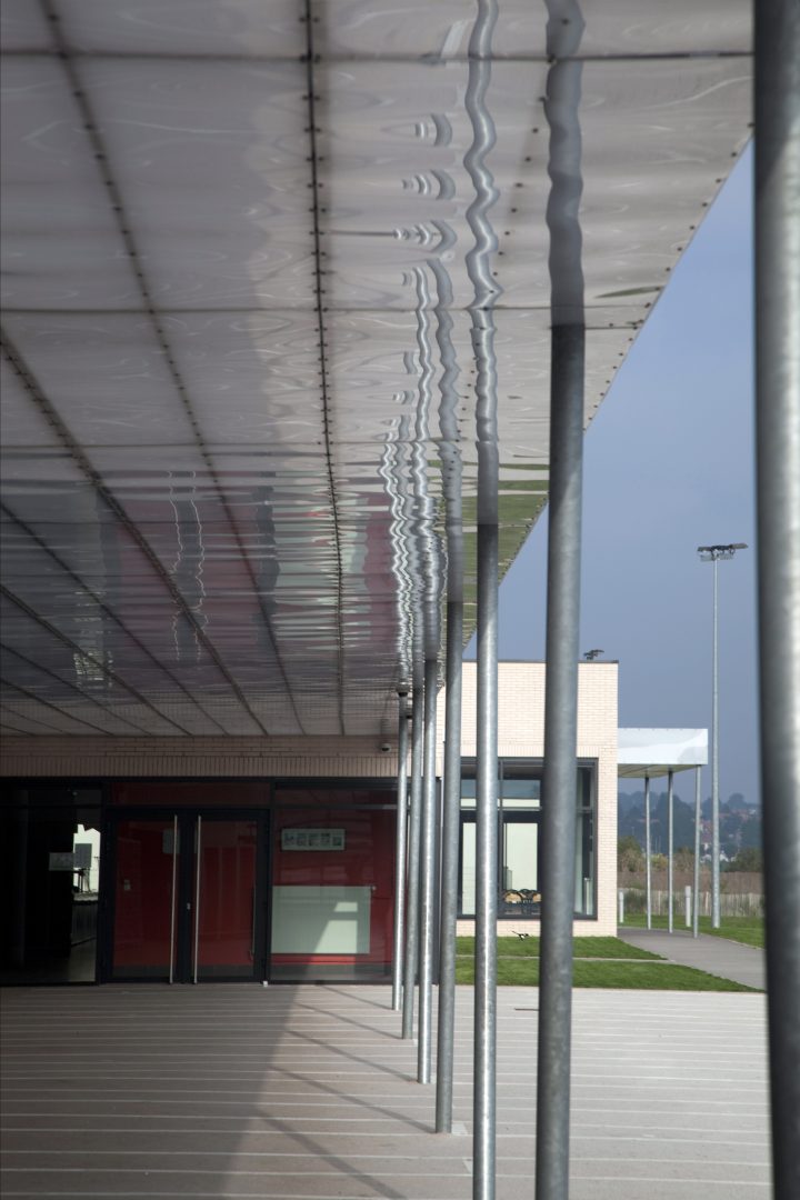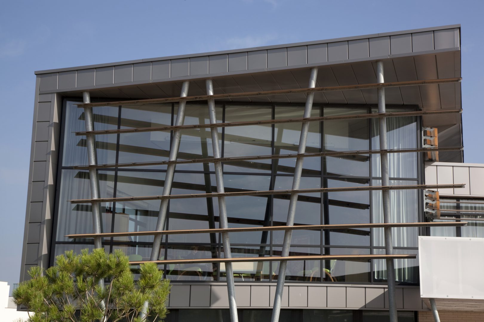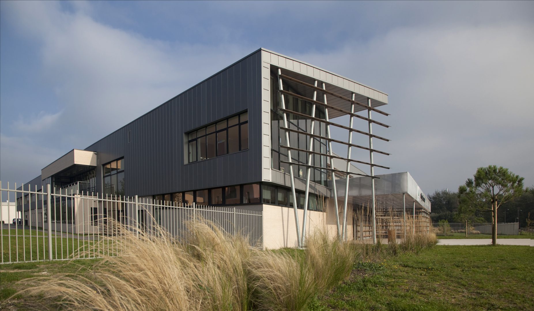 La palette des matériaux utilisée associe d’une part les revêtements type : bac aluminium anodisé qualité marine, brique ton sable, verre, enduit et d’autre part des éléments acier et bois en modénature qui établissent un mariage harmonieux entre les façades et leur environnement proche donnant ainsi l’image d’un équipement contemporain où sobriété et élégance s’allient à pérennité.