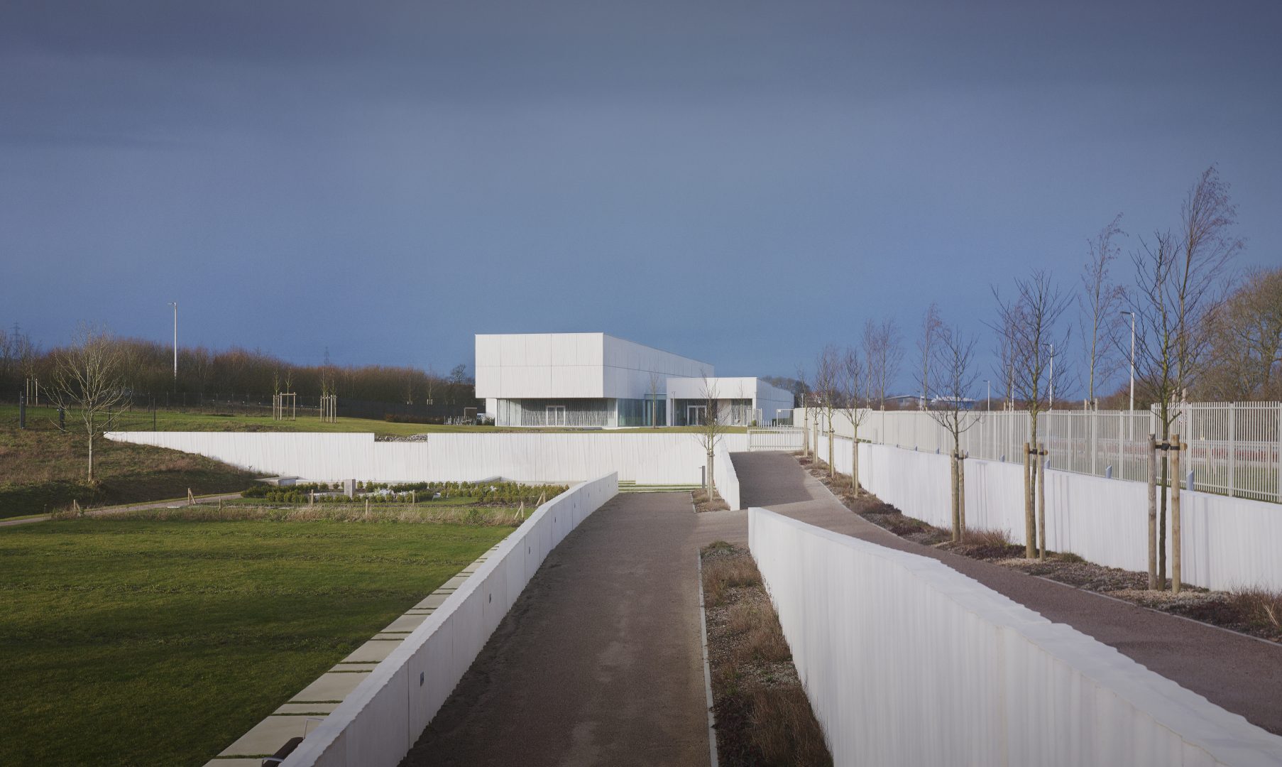 La parcelle qui accueille le projet est située à Saint-Martin-Les-Boulogne, le long de la route nationale 42 et de la desserte du centre commercial Auchan. Le site d’installation du centre funéraire est marqué par les infrastructures routières les zones commerciales et d’activité, mais aussi par un lambeau de paysage bocager et les traces d’un passé rural encore proche. La topographie y est également assez présente. Dans ce paysage distendu, tiraillé entre la banale modernité des entrées de ville dédiées au passage des flux et au commerce et la nostalgie des références campagnardes, l’implantation d’un équipement singulier associé à un événement irrémédiable et douloureux implique une prise de position forte dans le site, qui impose au contexte l’exception, le calme, le temps suspendu et le silence associés aux grandes ruptures. Nous avons conçu ce projet comme un monde à part entière dans lequel on rentre de façon solennelle face à un parterre très sobre et pur dans sa géométrie qui exprime de suite la nature du lieu : recueillement et solennité seront les deux idées principales déclinées pour la conception de cet équipement. Pour cela nous avons utilisé la morphologie particulière du terrain, la topographie et la longueur, pour implanter et répartir les fonctions dans un ensemble cohérent qui s’inscrit de façon claire dans le site. L’accompagnement végétal en éloigne les limites ; il filtre et repousse la présence des bâtiments d’activité et en premier lieu des nuisances sonores possibles de la part du chenil.