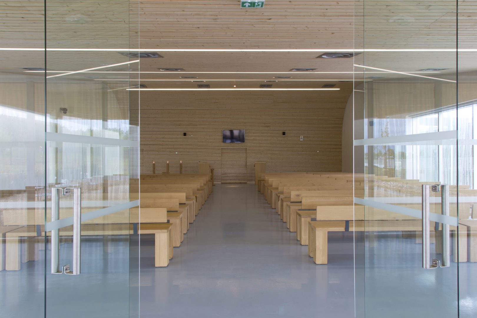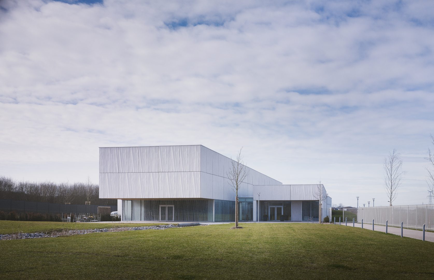 Le projet est conçu comme une entité totalement introvertie, niché entre deux grandes parois très fermées qui permettent l’isolement visuel mais aussi acoustique vis-à-vis de l’environnement. Une volumétrie sobre et rigoureuse, affichant la solennité des lieux accueille le public. L’utilisation unique de 2 matières : le béton matricé blanc et le verre pour tout le projet renforce cette notion. L’élégance et la sobriété du béton matricé blanc viennent accompagner la pureté et la rigueur des lignes dans un cadre paysagé construit autour d’une ligne d’eau. Cette ligne reprend la notion de rivage, et trace sur la parcelle une ligne entre deux rives imaginaires symbolisant le passage entre le monde des vivants et le monde des morts. Elle prend naissance dans le bâtiment, par une succession de patios et aboutit dans un bassin au cœur du projet paysagé permettant le recueillement et la méditation.