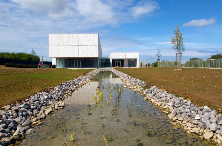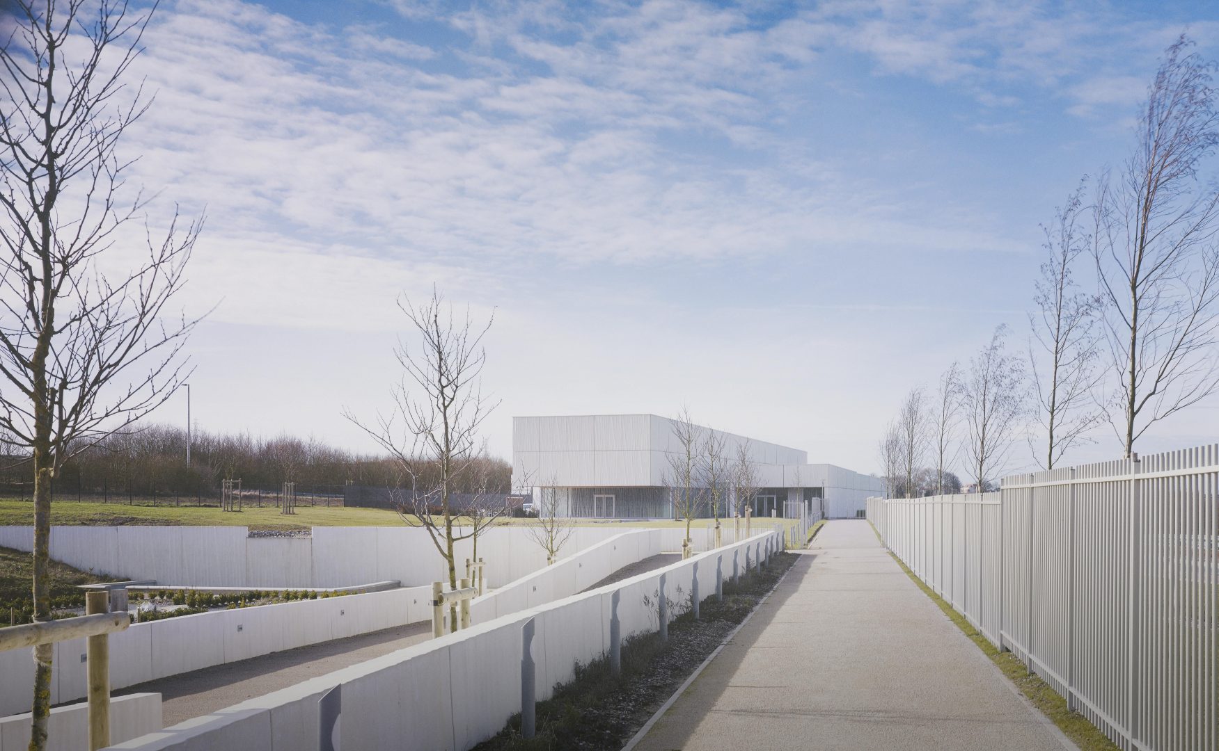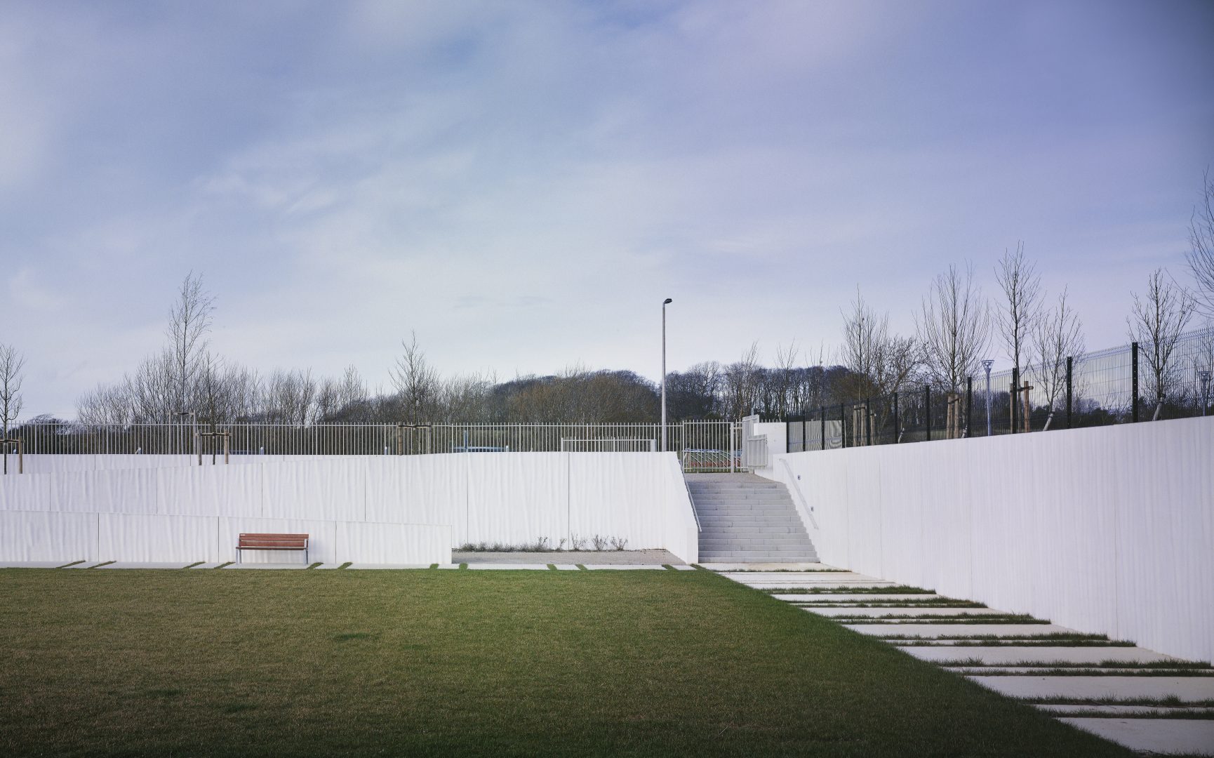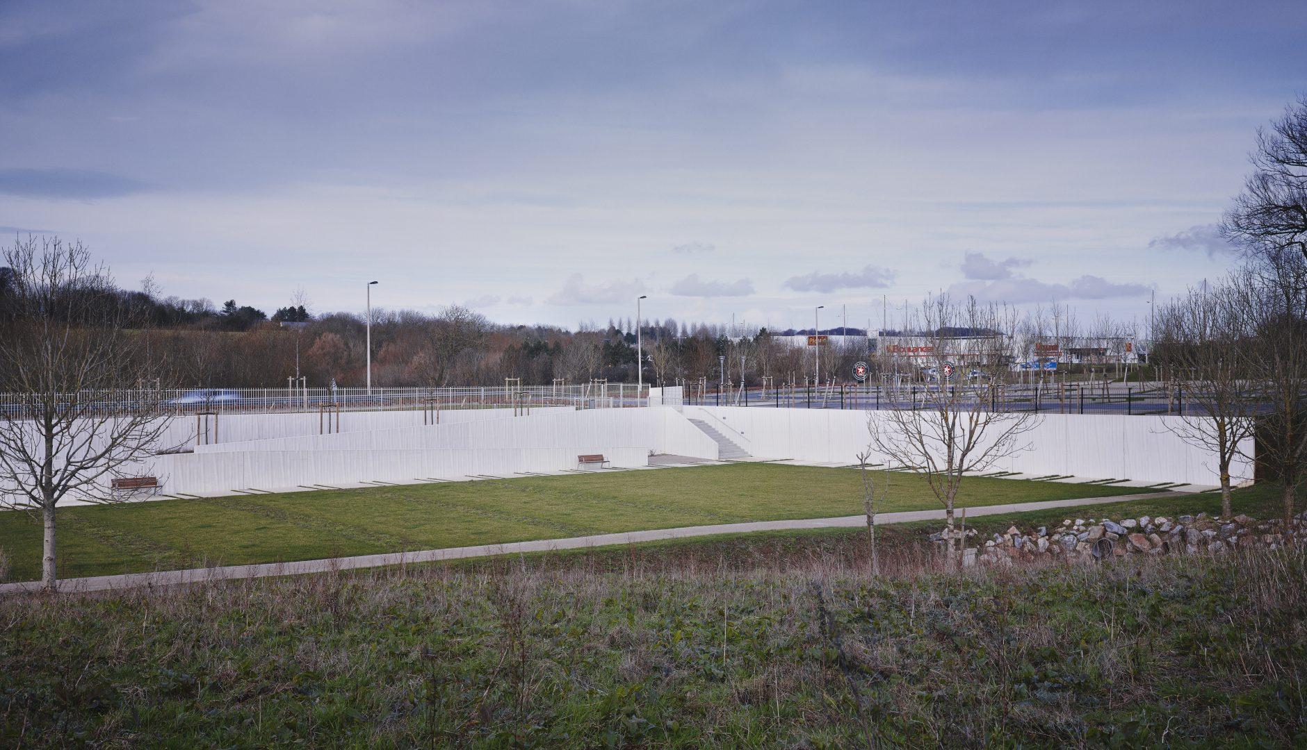 Nous avons reconfiguré l’accroche de la parcelle sur le rond-point en constituant un tertre planté qui annonce et protège l’équipement.