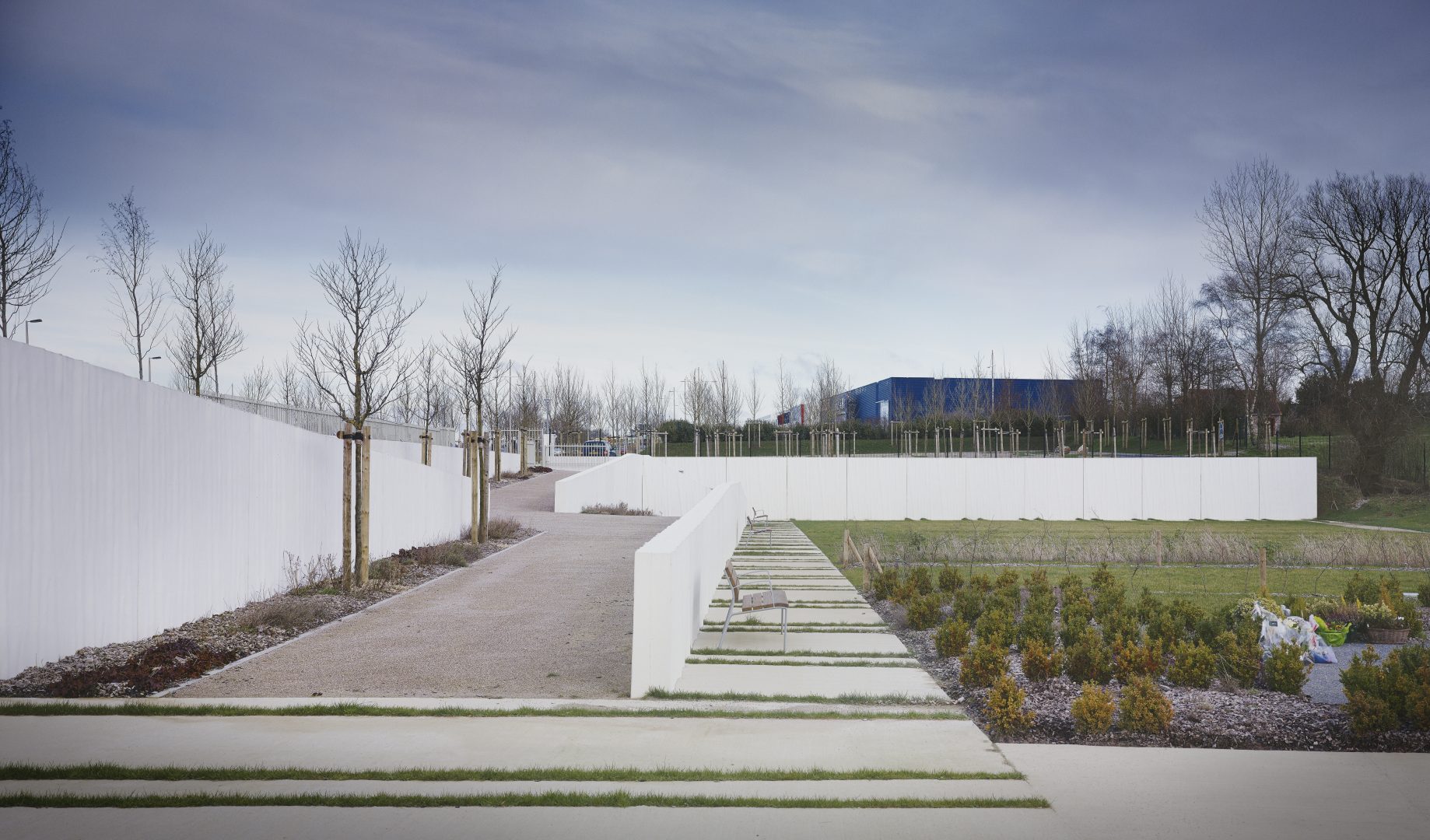 Le jardin du souvenir est lové dans le creux que propose le site. Sur trois de ses côtés, la pente est en partie tenue par des murs de soutènement qui accueillent une rampe d’accès au nord, un colombarium à l’est et un mur d’eau à l’ouest. La pente de la partie sud est légèrement remodelée pour permettre l’installation d’un cheminement praticable par tous. Elle est généreusement plantée, afin de constituer un horizon qualifié.