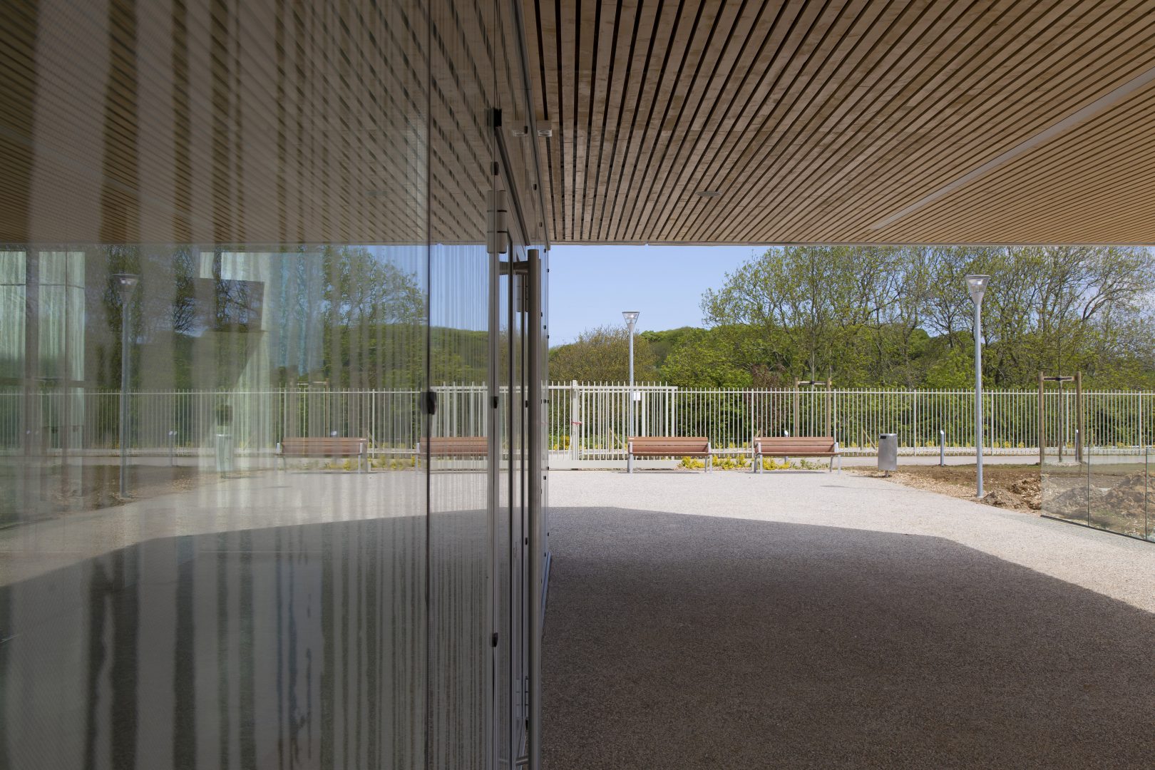 Le bâtiment, en partie enserré dans ce relief grâce à l’utilisation des déblais, surplombe la route et s’ouvre sur le paysage bocager préservé et sur le jardin du souvenir. L’eau qui symbolise l’idée du passage traverse le bâtiment et rejoint les bassins du jardin en contrebas par un petit canal.