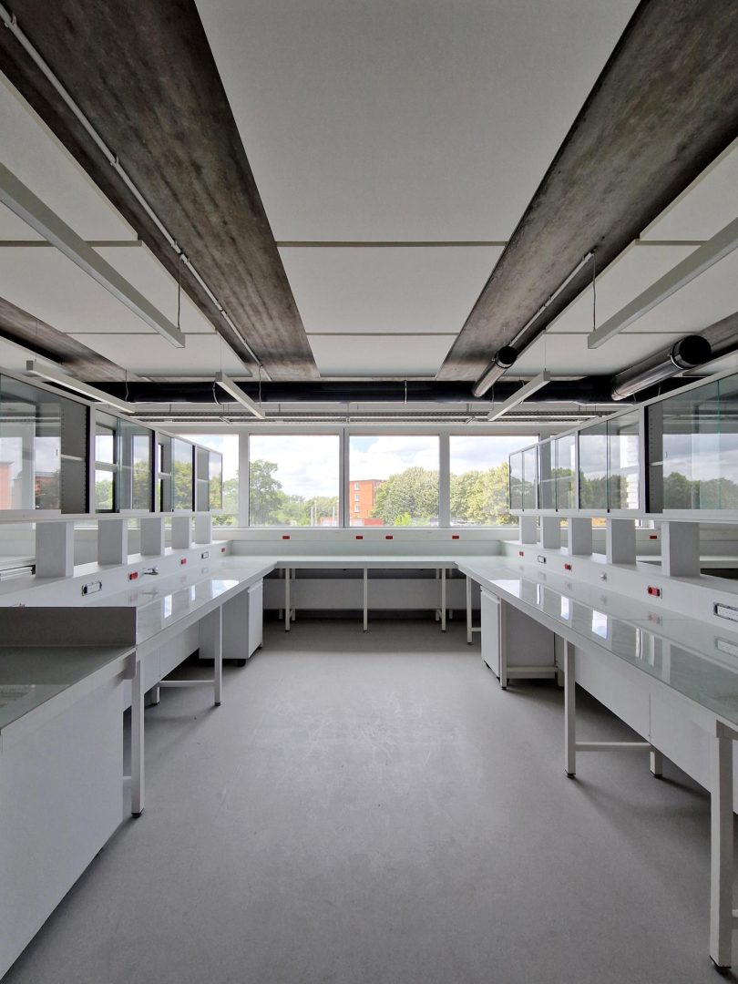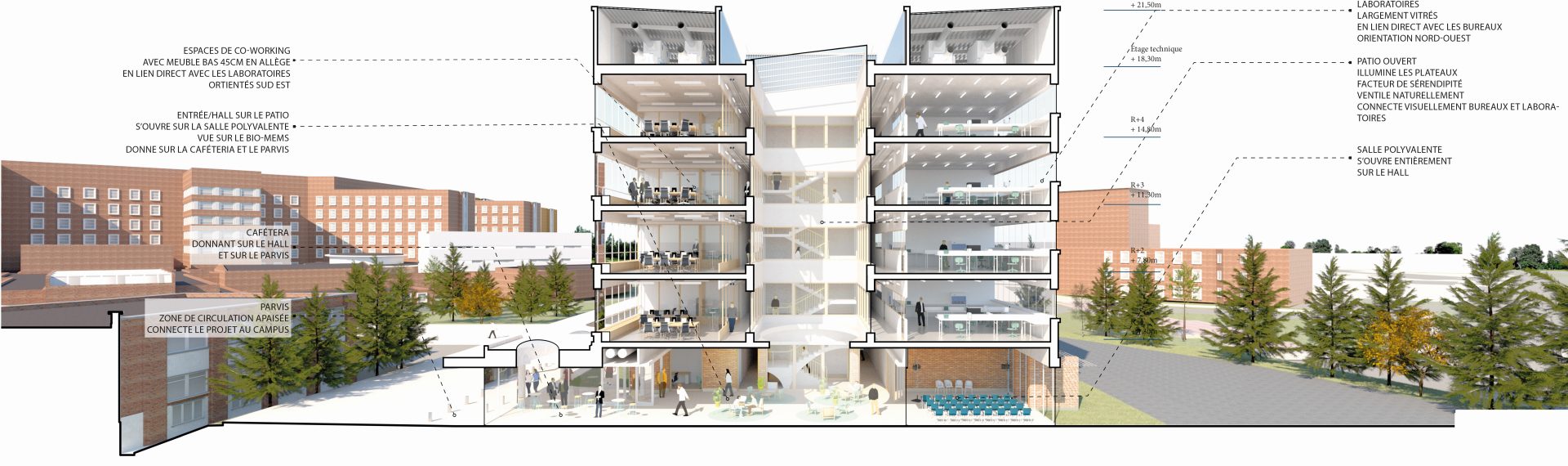 - Les plateaux aux niveaux R+1, R+2 et R+3 agencent les unités de bureaux et les unités de laboratoires. L’intention de cette organisation est de favoriser une proximité forte, un lien direct entre laboratoires et bureaux tout en leur apportant la confidentialité et les espaces d’interactions nécessaires à la sérendipité. Les laboratoires et les bureaux sont largement vitrés sur la végétation environnante ainsi que sur les couloirs intérieurs afin d’y apporter un confort optimal tant en termes de fonctionnement que d’usage au quotidien. La trame structurelle et la trame de façade permettent une évolutivité dans le cloisonnement / décloisonnement de ces espaces.