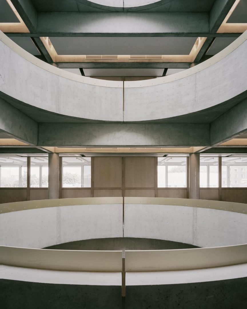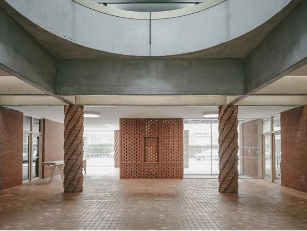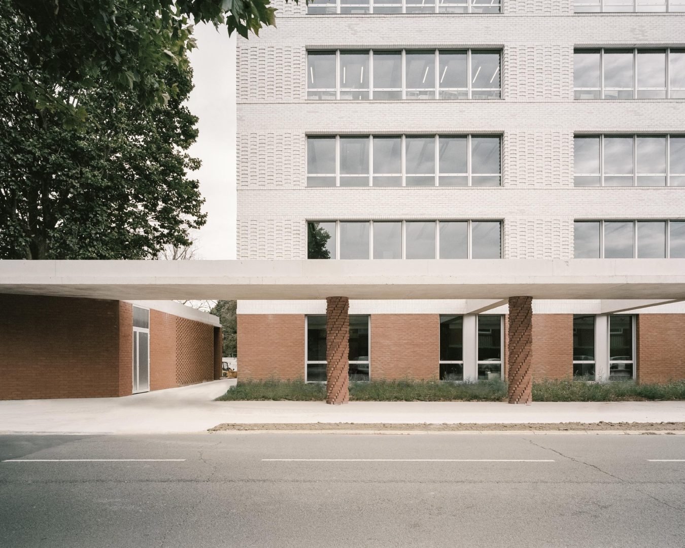 Les éléments du socle sont unifiés par un auvent en béton protégeant les visiteurs des intempéries et les accompagnant jusqu’à l’entrée, où ils sont guidés par une ligne de poteaux en briques vrillées travaillant une sensation d’intérieur extérieur. Cet auvent finit de séparer la géométrie du bâti, signalant sa partie publique en rdc, de sa partie tertiaire aux étages.