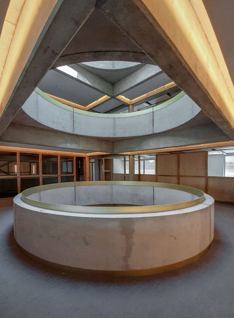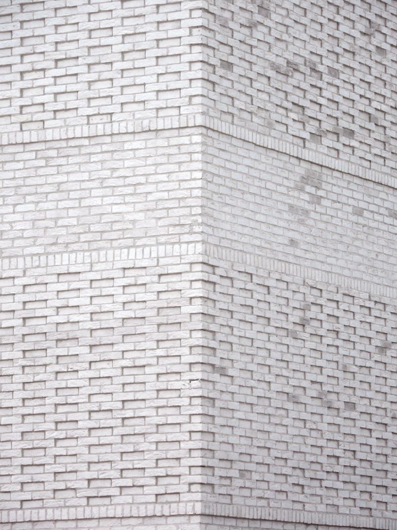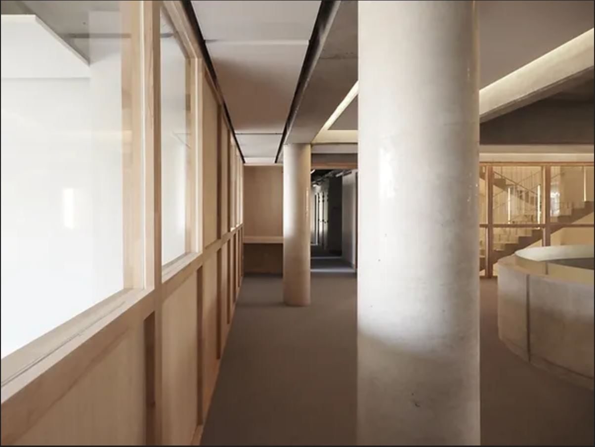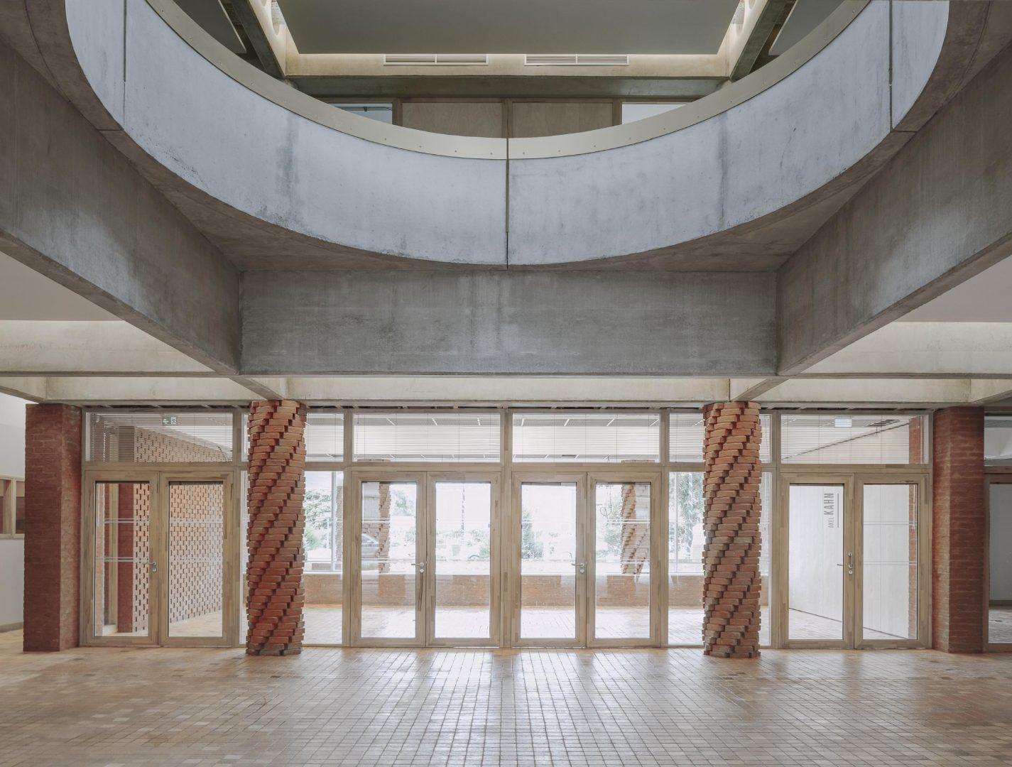 Les éléments du socle sont unifiés par un auvent en béton protégeant les visiteurs des intempéries et les accompagnant jusqu’à l’entrée, où ils sont guidés par une ligne de poteaux en briques vrillées travaillant une sensation d’intérieur extérieur. Cet auvent finit de séparer la géométrie du bâti, signalant sa partie publique en rdc, de sa partie tertiaire aux étages.