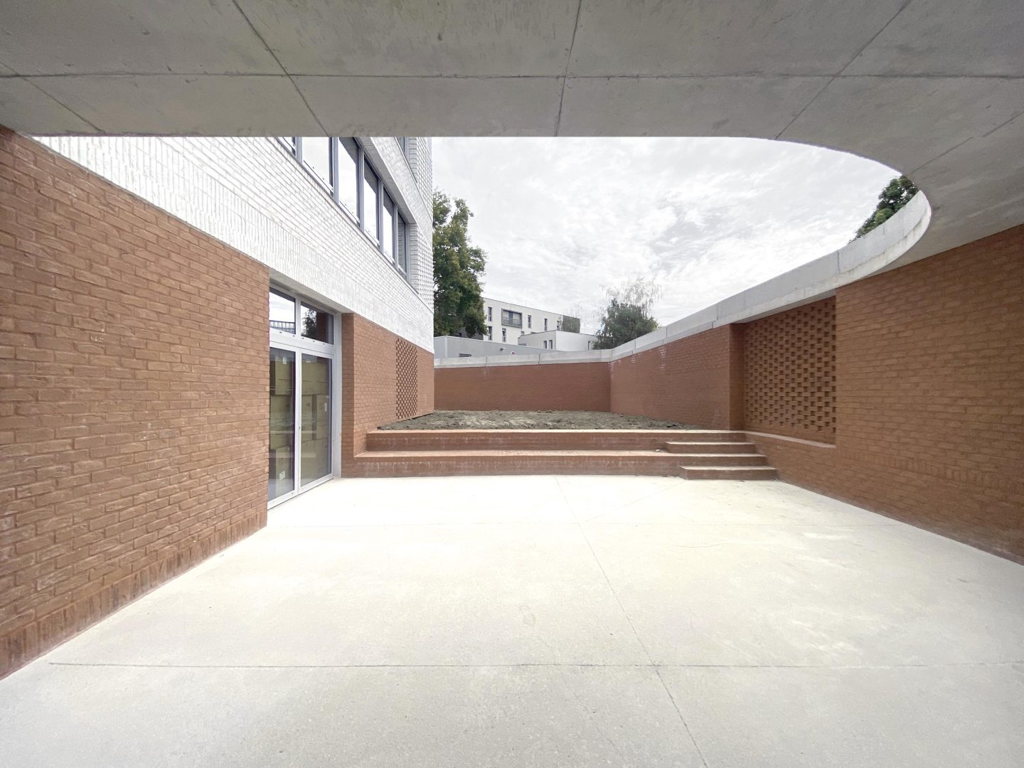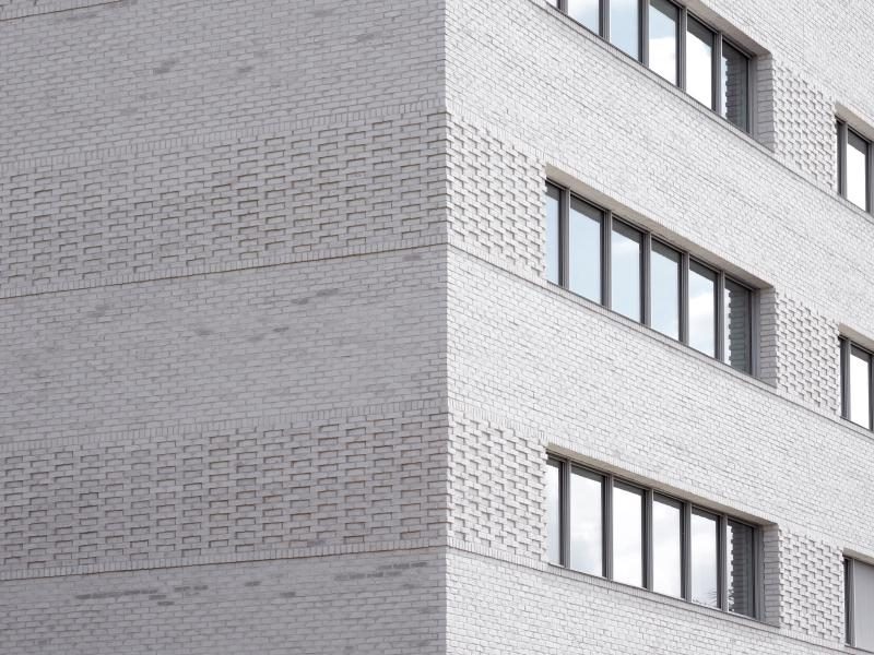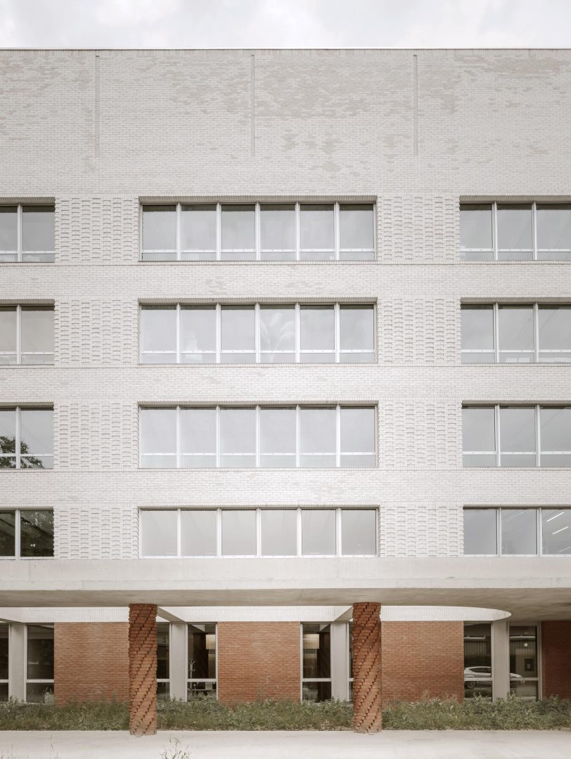 La brique identité de notre région, habille subtilement le bâtiment. Elle a été choisie moulée main afin de présenter des aspérités et des variations, l’assemblage en joints beurrés de même ton accentuant le jeu et la mouvance de la matière et rendant ainsi toute sa contemporanéité à la brique. Aux étages, les briques des trumeaux sont disposées deux par deux créant une ombre, à l’échelle des bandeaux vitrés. Sur les parvis et dans le hall, les poteaux sont définis par la succession de légers décalages en rotation de leurs briques afin de former une vrille.