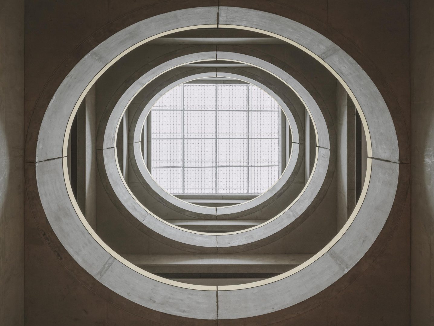 Lorsque l’on rentre dans le hall se glissant jusqu’au point central, on découvre l’atrium, et son garde-corps en béton elliptique. De finition brut on découvre un quadrillage de poutres béton tramées où repose 4 quarts d’ellipses en bétons pré-coulés sur le chantier déposés par grutage. La forme de la trémie elliptique offre une circulation fluide entre les laboratoires et les bureaux, et forme à tous les niveaux le cœur de vie de l’institut où l’on se rencontre.