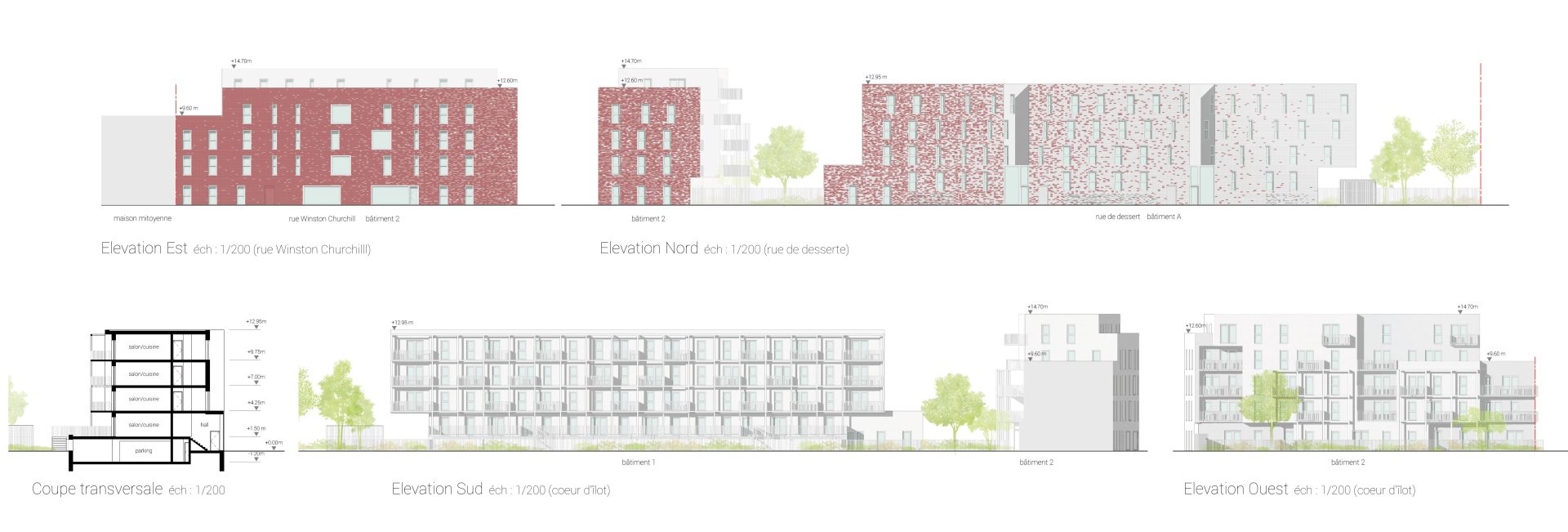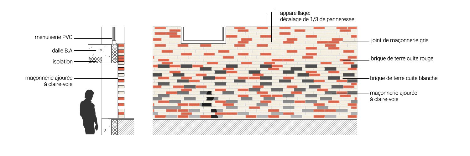 Le site ex-Ercat (Établissement Ravitailleur du commissariat de l’armée de terre) de la commune de Lomme abritait jusque 2002 le 43ème régiment d’infanterie, année au cours de laquelle l’armée de Terre a quitté ces installations. L’îlot 07, la parcelle support ou le projet, est implantée marque la transition entre la ville et le cœur d’îlot et joue le rôle de bâtiment signal marquant l’entrée du site ex-Ercat. C’est pourquoi nous avons souhaité mettre en valeur cette entrée du domaine public vers le cœur d’îlot par la mise en œuvre d’un parement de brique de terre-cuite allant d’une teinte rouge brique vers une teinte blanche.
