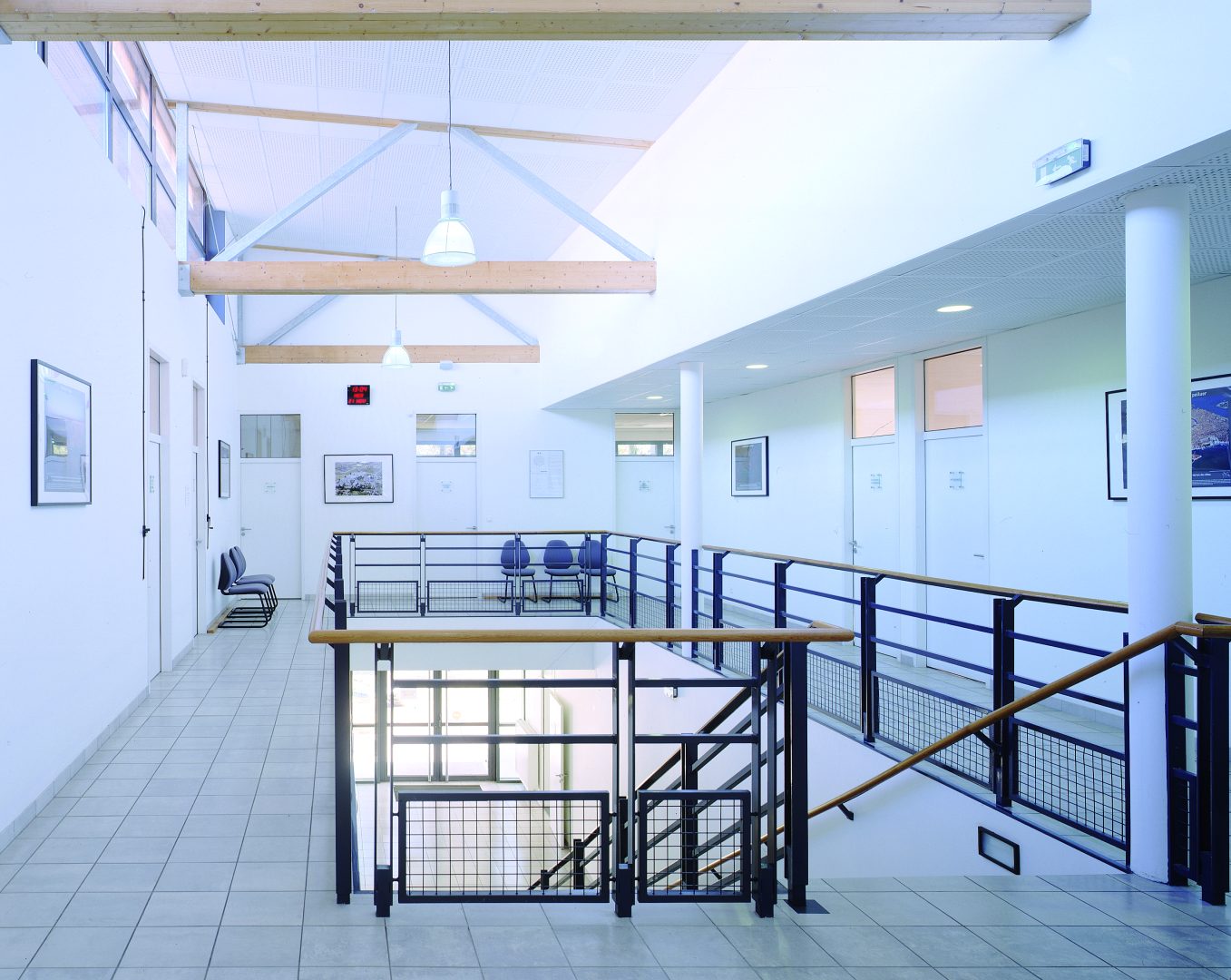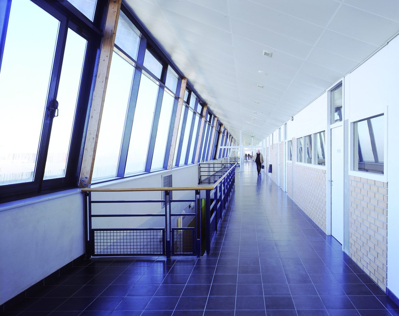 Au Nord, la façade rectiligne poursuit l’alignement du bâtiment voisin d’enseignement en laissant par une rupture du volume un cône visuel sur le paysage lointain.