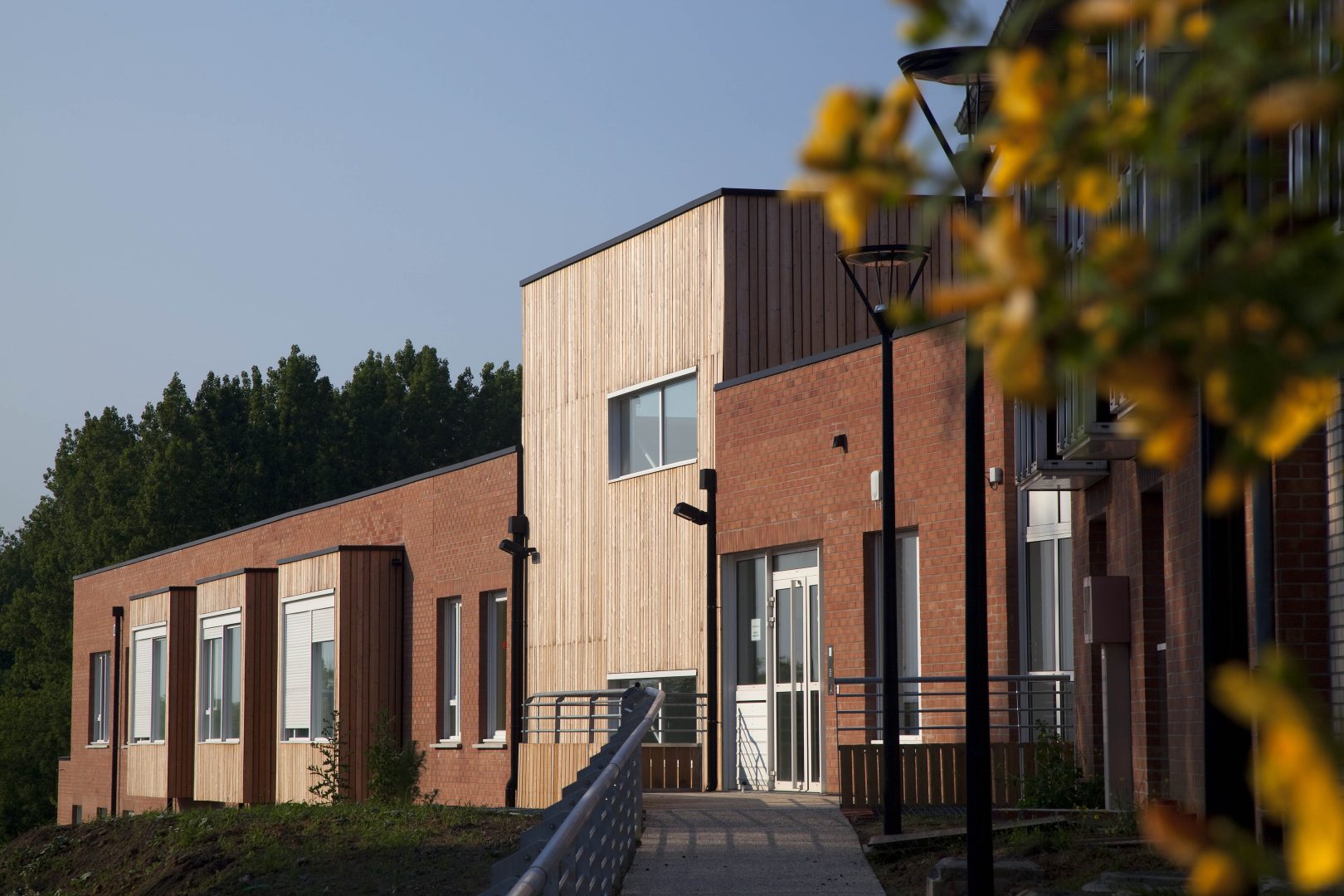 Les limites : organisation des lieux en dissociant clairement les intérieurs des extérieurs, les lieux de vie des chambres, les lieux du personnel des lieux des résidents. – voir, échanger, se repérer et être en sécurité dans les différents espaces de vie -La convivialité : organisation de l’EHPAD autour des lieux de vie intérieurs et des espaces extérieurs, les voiries, les vues et le jardin – une maison de retraite confortable ouverte sur son environnement urbain : garder le contact avec la vie et le rythme des jours.Le traitement des espaces extérieurs renforce le parti architectural et tisse des relations entre l’équipement et son environnement. Le bâtiment s’installe le long de la voie future. Le choix d’implantation dégage par ailleurs un espace intérieur, en continuité avec les espaces libres existants autour desquels se réunissent les divers équipements constituant ainsi un cœur d’îlot vert. Les aires de stationnement, plantées de façon régulière, à la manière de vergers font partie intégrante de ce dispositif. Elles sont organisées en une cour haute qui reprend la surface minérale existante, et en une cour basse dont les surfaces affectées au stationnement sont constituées de sol perméable fait d’un pavage béton aux larges joints engazonnés.L’extension de la maison de retraite est compacte, réalisée en continuité de l’existant comme le demande le programme. La partie dédiée aux Alzheimer se situe au niveau 0 avec la cuisine. Accessible depuis l’extérieur, le lieu de vie de l’unité Alzheimer se trouve prêt de l’entrée, cet espace est tourné vers l’extérieur en relation directe avec le jardin clos. De là l’unité de vie est entièrement accessible et parfaitement contrôlable par le personnel soignant. La partie dédiée aux personnes handicapées vieillissantes est au niveau 1 avec la nouvelle salle à manger dans la partie de bâtiment en jonction entre l’existant et l’extension. Nous avons traité les façades en continuité de la partie existante avec un parement brique identique. Des parties en bardage bois animent l’ensemble de la façade et permettent la transition avec les futurs aménagements de la zone et le pôle petite enfance. Les formes type « bow windows » complètent l’intégration de notre extension avec l’existant. Le principe de cette conception est d’offrir une qualité d’accueil et de vie à l’ensemble des résidents et du personnel soignant : des espaces de qualité, adaptés aux personnes âgées bien éclairés et différenciés où chacun peut se repérer facilement. Le fonctionnement de chaque unité de vie est autonome tout en étant en relation les unes par rapport aux autres via les circulations. Le parcours du personnel est aisé, les circulations verticales implantées de façon centrale optimisent les déplacements.