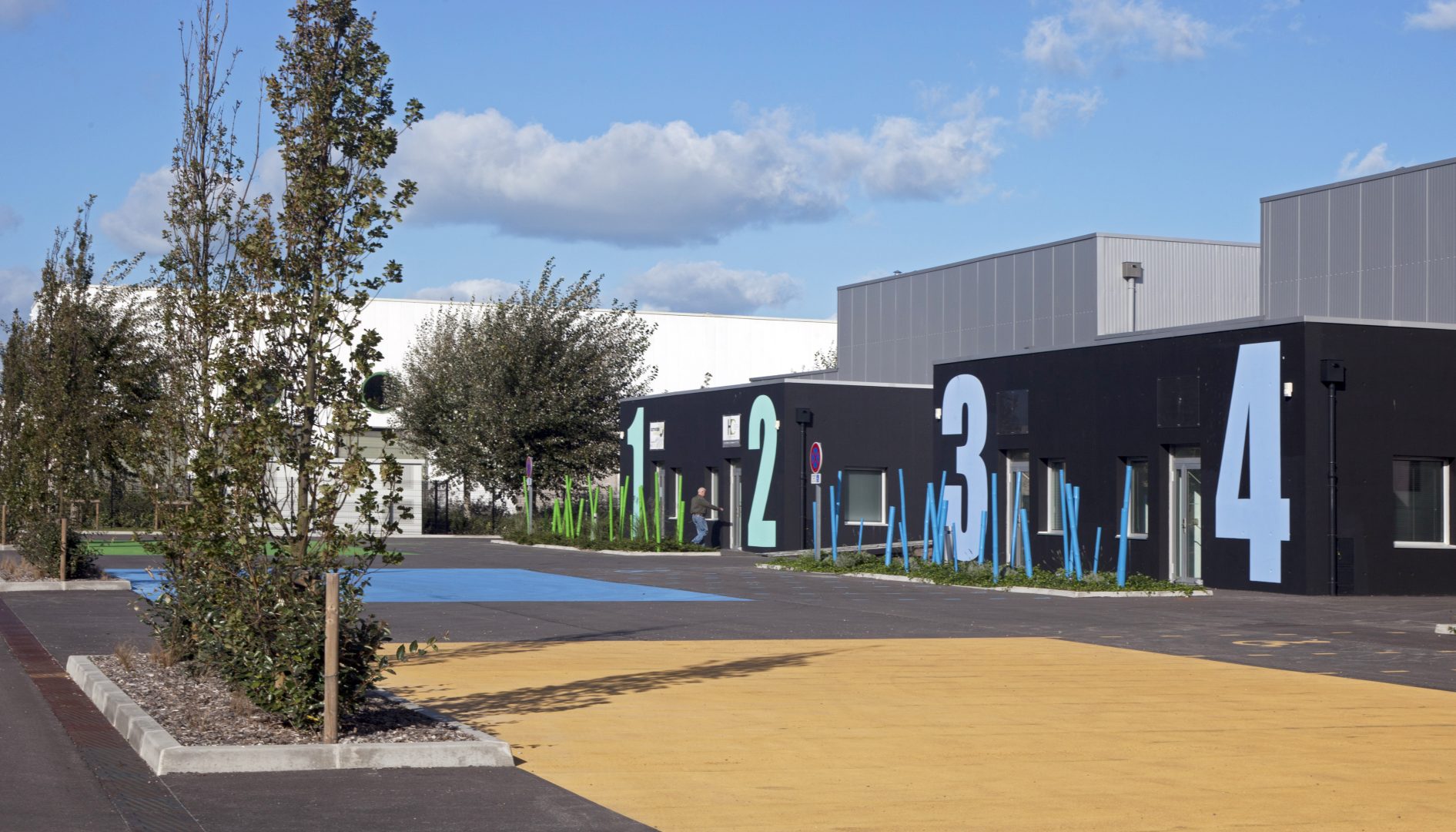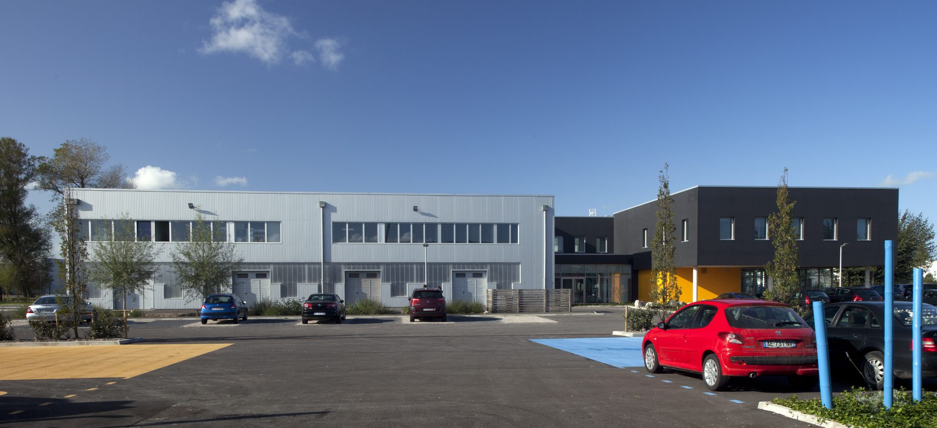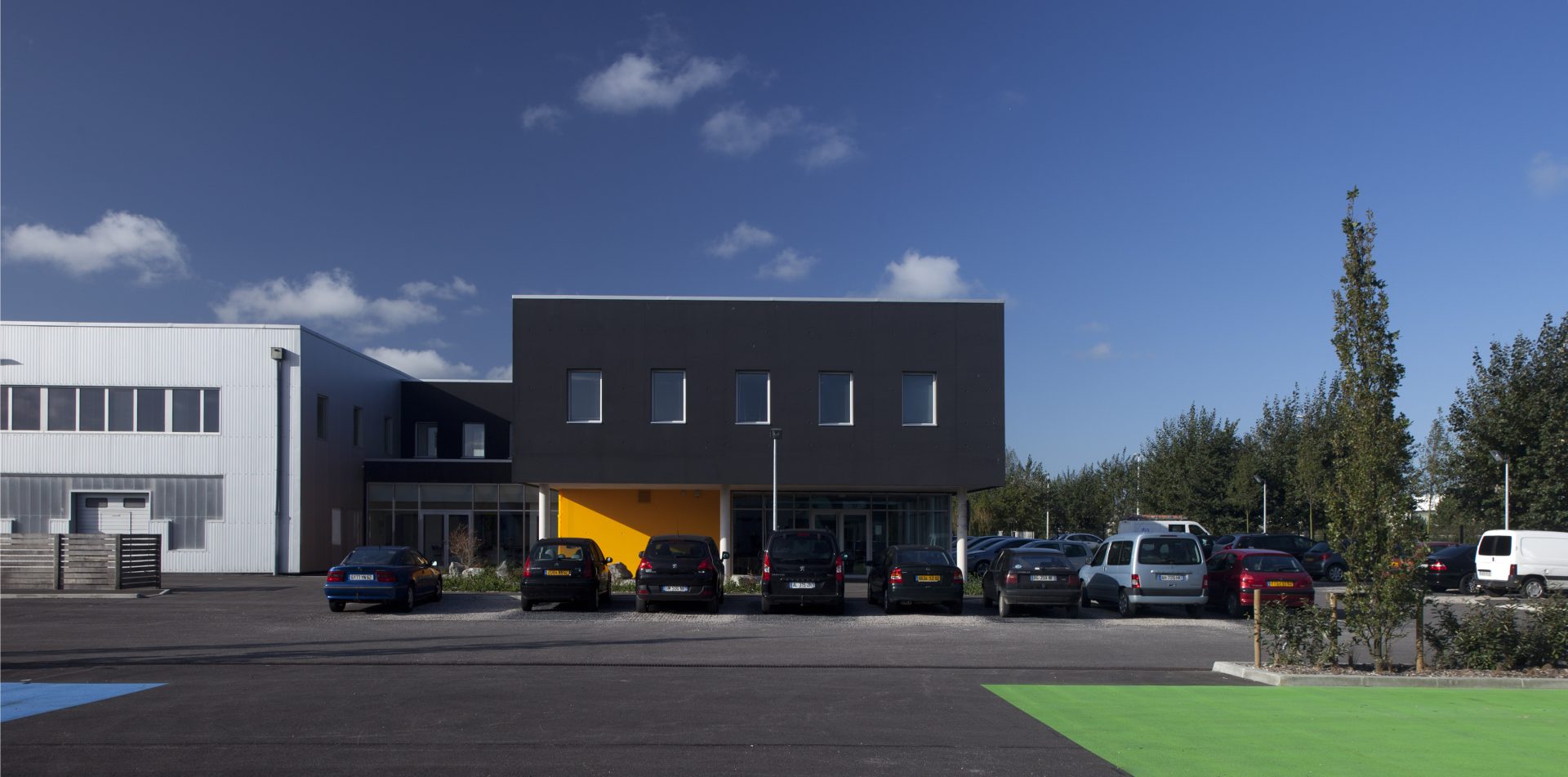 Le choix des matériaux est dicté par l’utilisation, la résistance à l’usure et aux chocs et la durabilité : un parement de bétons lasuré pour les parties bureaux et les soubassements, un bardage acier pour les parties ateliers. Une signalétique colorée vient compléter et agrémenter les façades, elle permettra aussi le repérage aisé des différentes entités par les visiteurs.