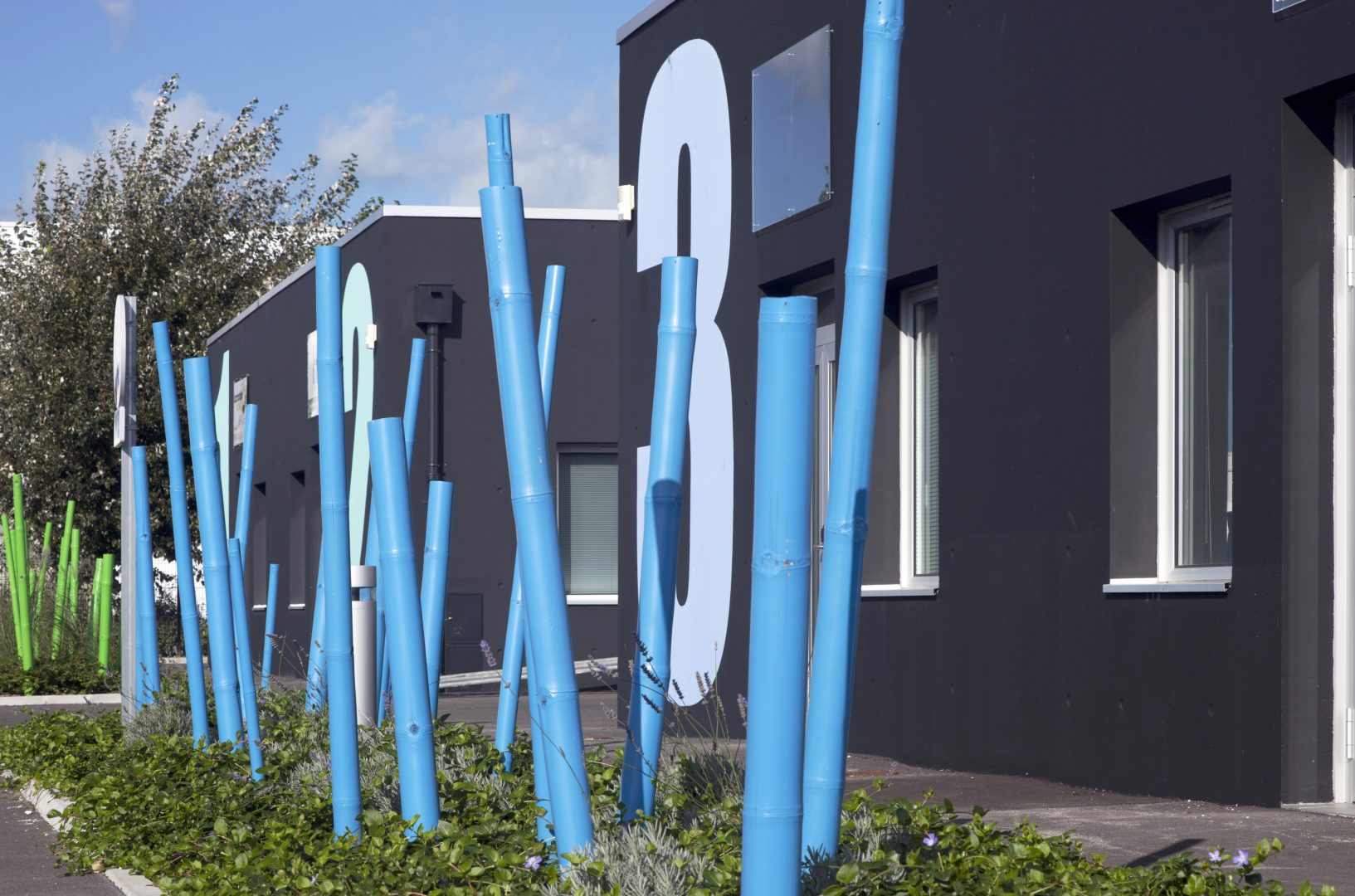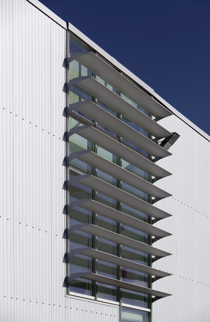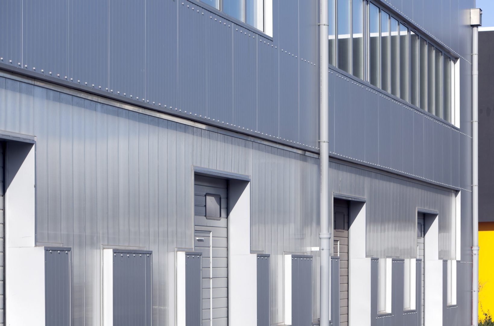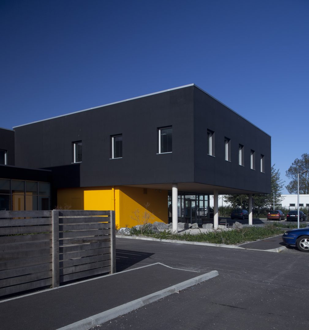 Le choix des matériaux est dicté par l’utilisation, la résistance à l’usure et aux chocs et la durabilité : un parement de bétons lasuré pour les parties bureaux et les soubassements, un bardage acier pour les parties ateliers. Une signalétique colorée vient compléter et agrémenter les façades, elle permettra aussi le repérage aisé des différentes entités par les visiteurs.