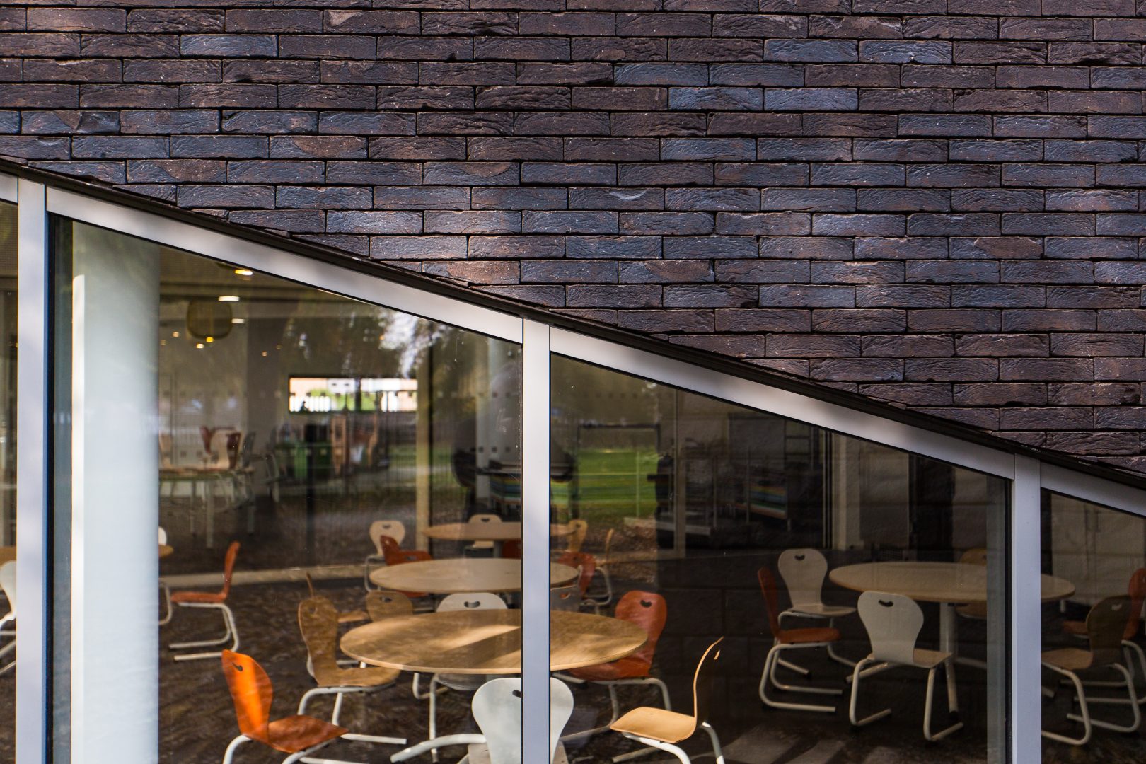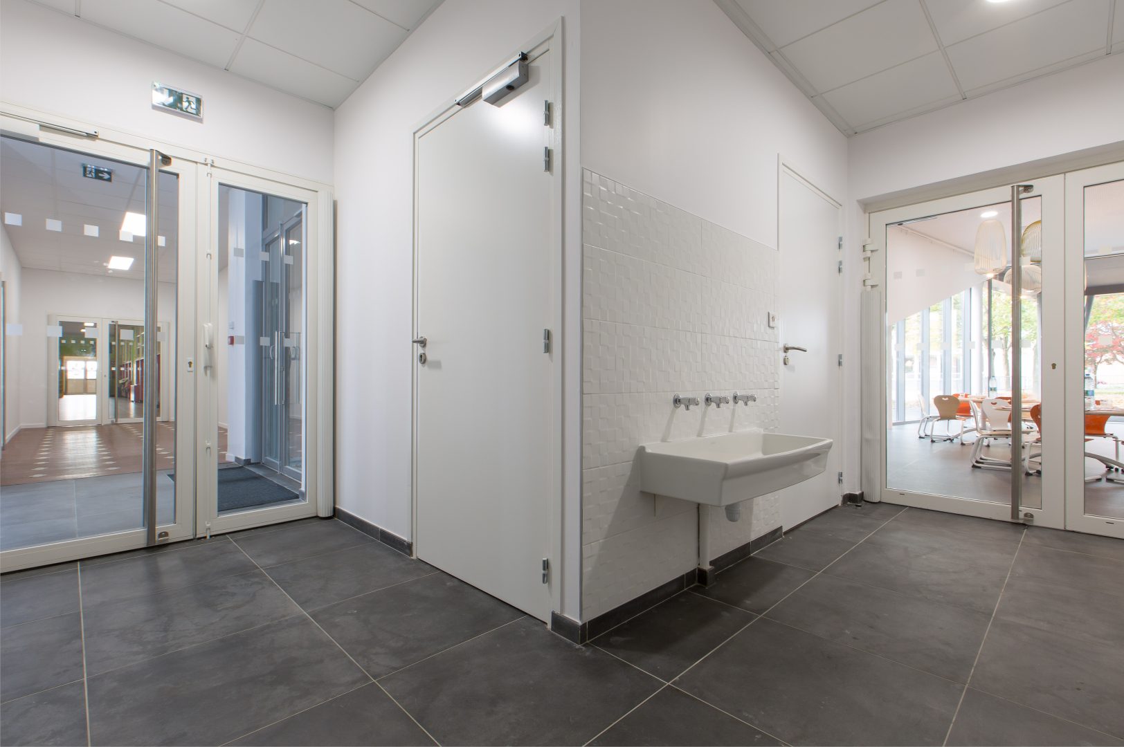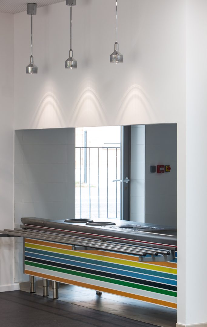 L’implantation de l’extension permet de renouveler la perception urbaine de l’équipement depuis l’espace urbain et donne l’image d’un établissement contemporain, dynamique et accueillant à l’image de la ville. Ce principe de volumétrie et de transparence permet également de réduire les ombres portées des constructions entre l’existant et l’extension. Il offre un ensoleillement généreux et diversifié à chaque espace d’accueil : les ouvertures des salles à manger sont tri-directionnelles, le sud, l’ouest et le nord, donnant une richesse de luminosité et de paysage. L’espace périscolaire s’ouvre généreusement vers le sud et l’est et offre une visibilité au nord vers le nouveau quartier. Cette diversité de lumières permettra d’utiliser les espaces différemment selon la journée ou les activités, le Nord propice au calme et à la lecture. La lumière du Sud ou de l’Ouest plus dynamisante, pour des activités plus soutenues ou demandant de l’attention. L’Est apportera au matin, le réveil biologique, l’éveil de l’esprit au grès des rayons du soleil. Les ouvertures généreuses sur la Ville et sur la parcelle bien ouverte du Groupe scolaire, permettent une belle luminosité dans les espaces de vies, mais travaillent aussi à la signalétique de l’équipement faisant rentrer la ville dans les espaces, et partageant la joie et la vie des enfants avec le quartier.