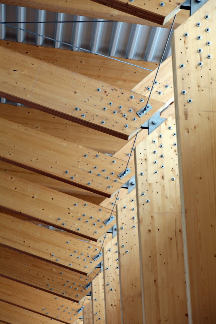 La structure porteuse, en forme de L filant, est constituée de demi-portiques en bois lamellé-collé, parallèles, reliés entre eux par des profilés longitudinaux tubulaires métalliques, et rigidifiés par des croix de contreventement généralisées.