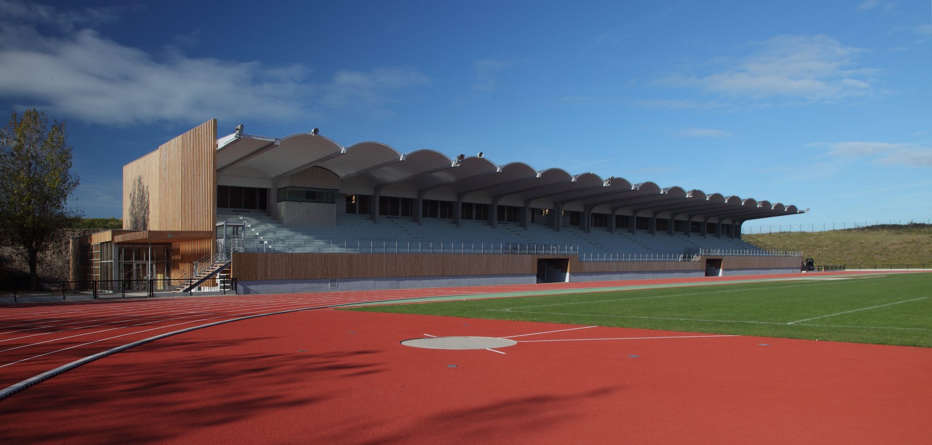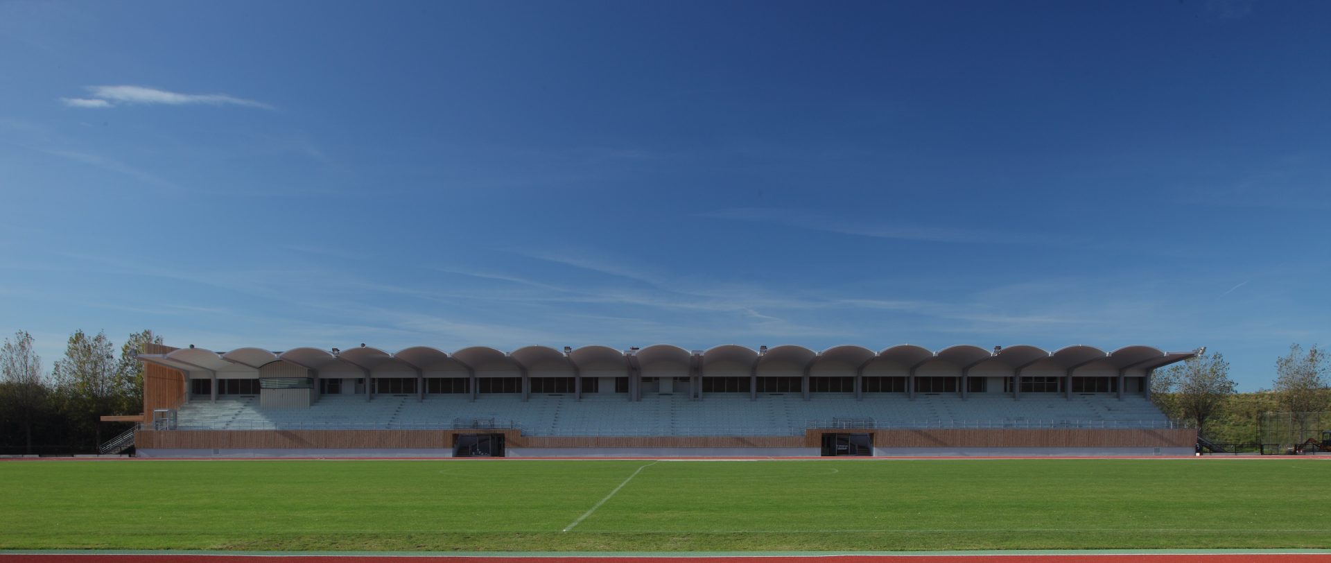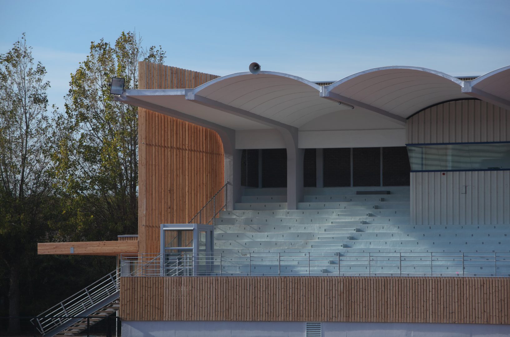 Au sud, l’habillage en bois de la boite de saut à la perche se prolonge au droit de la tribune par un élargissement des lames, assurant une transparence et une protection des vents sud ouest.Le projet consiste en une structure de couverture de la piste d’athlétisme, composée d’une toiture d’environ 900m² supportée par une charpente en bois lamellé collé et en éléments d’acier. La stabilité globale de l’ouvrage est faite par des appuis au sol et des appuis sur la structure de la tribune existante.