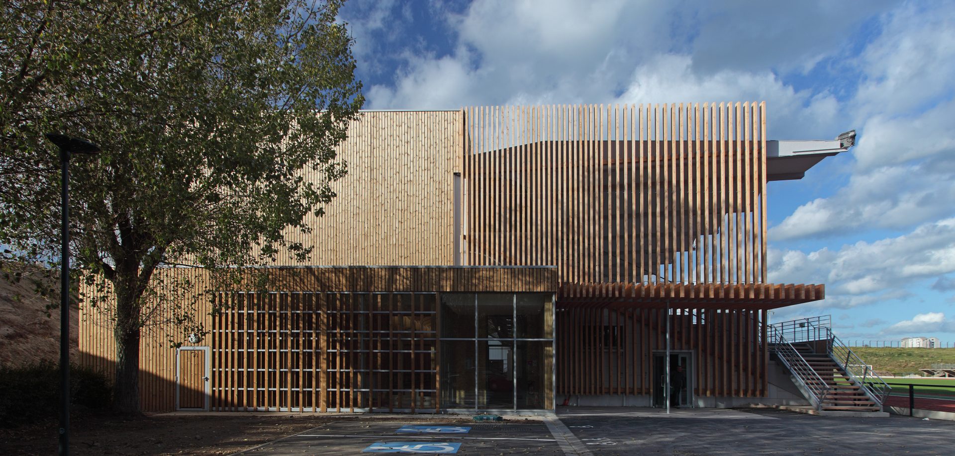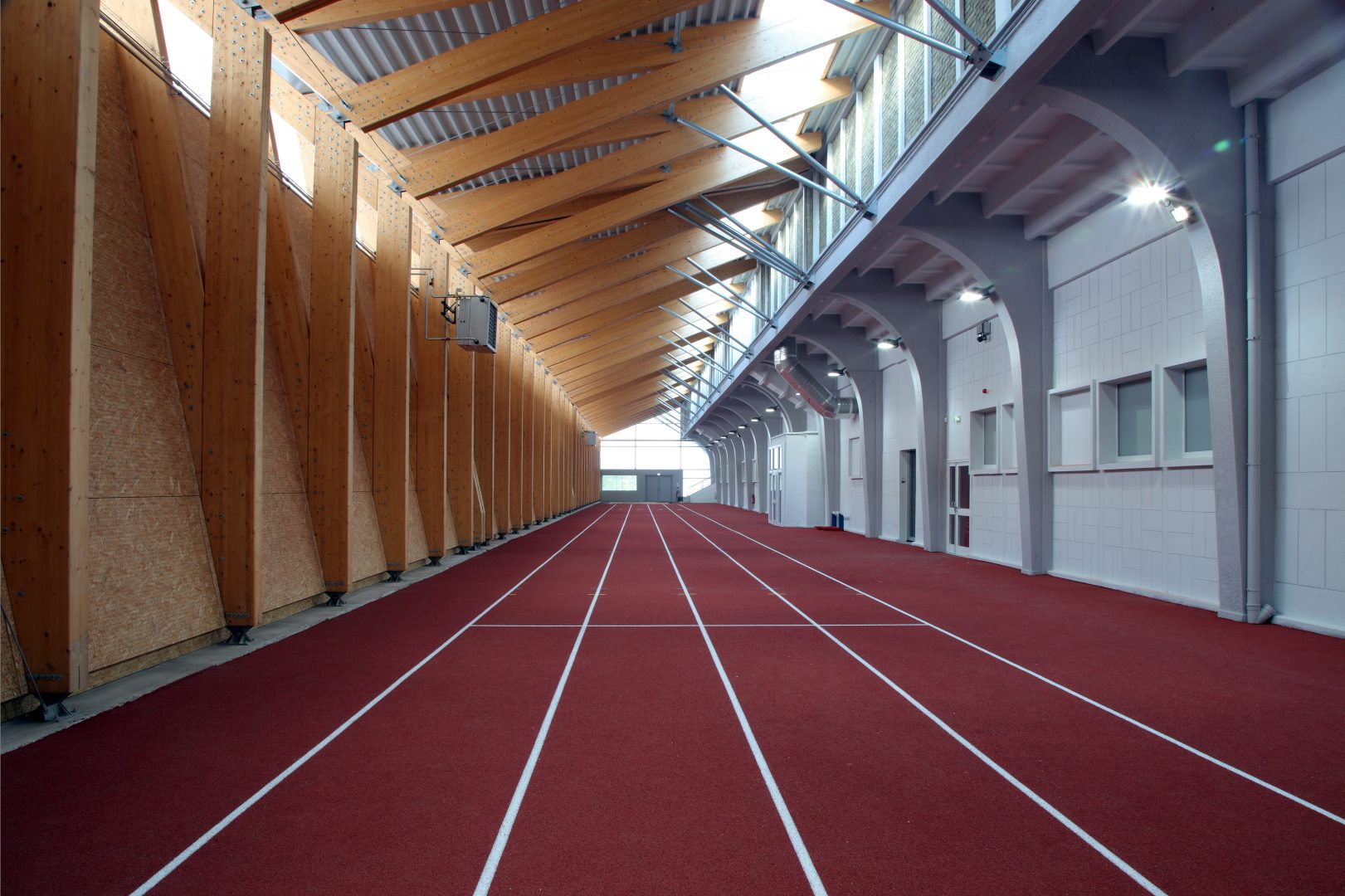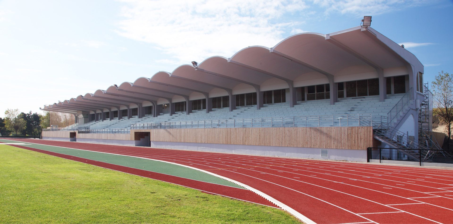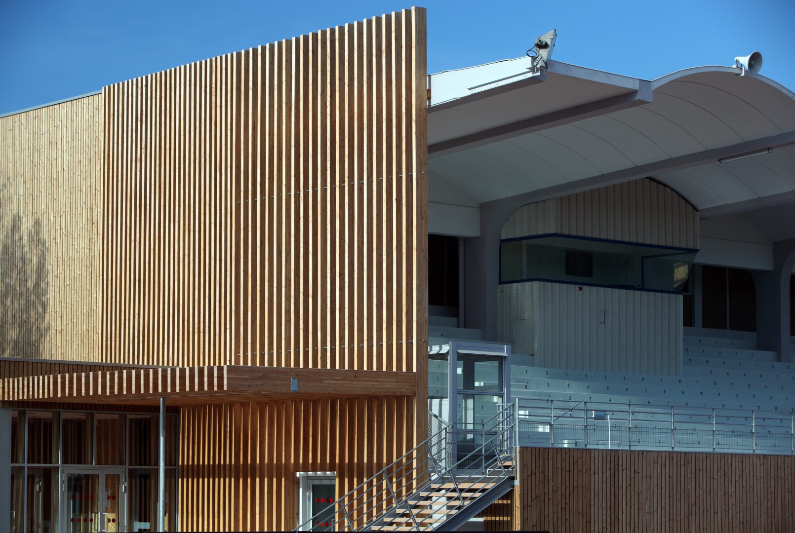 Au sud, l’habillage en bois de la boite de saut à la perche se prolonge au droit de la tribune par un élargissement des lames, assurant une transparence et une protection des vents sud ouest.Le projet consiste en une structure de couverture de la piste d’athlétisme, composée d’une toiture d’environ 900m² supportée par une charpente en bois lamellé collé et en éléments d’acier. La stabilité globale de l’ouvrage est faite par des appuis au sol et des appuis sur la structure de la tribune existante.