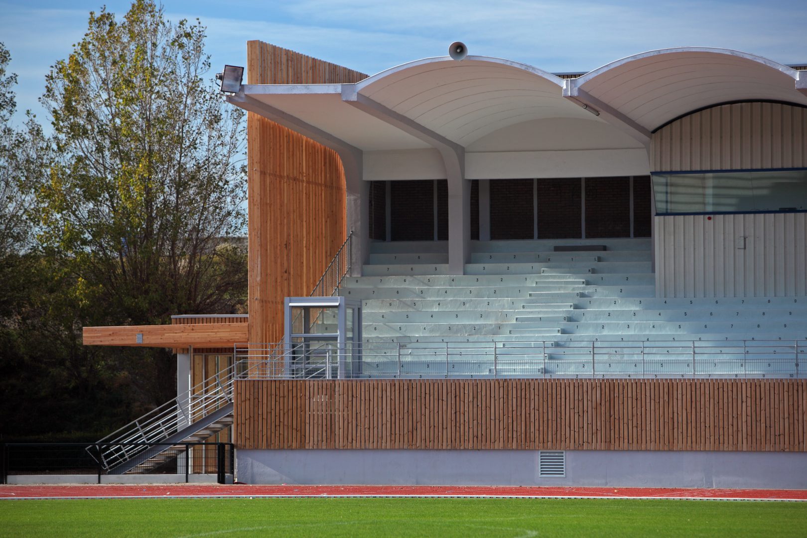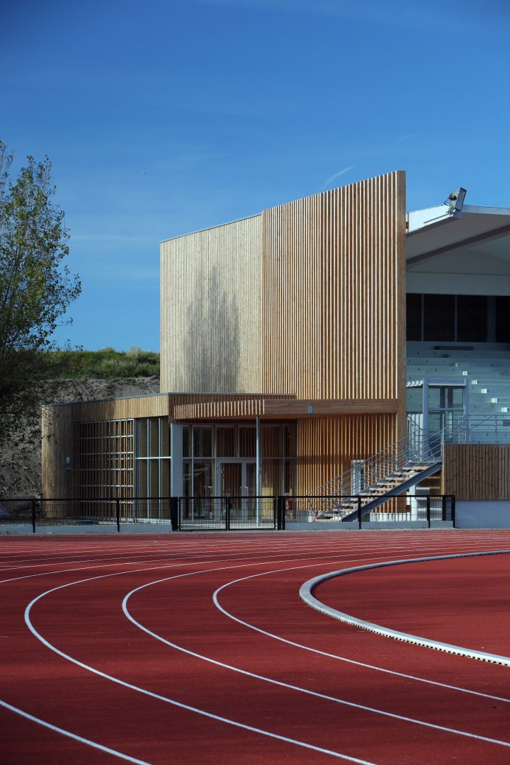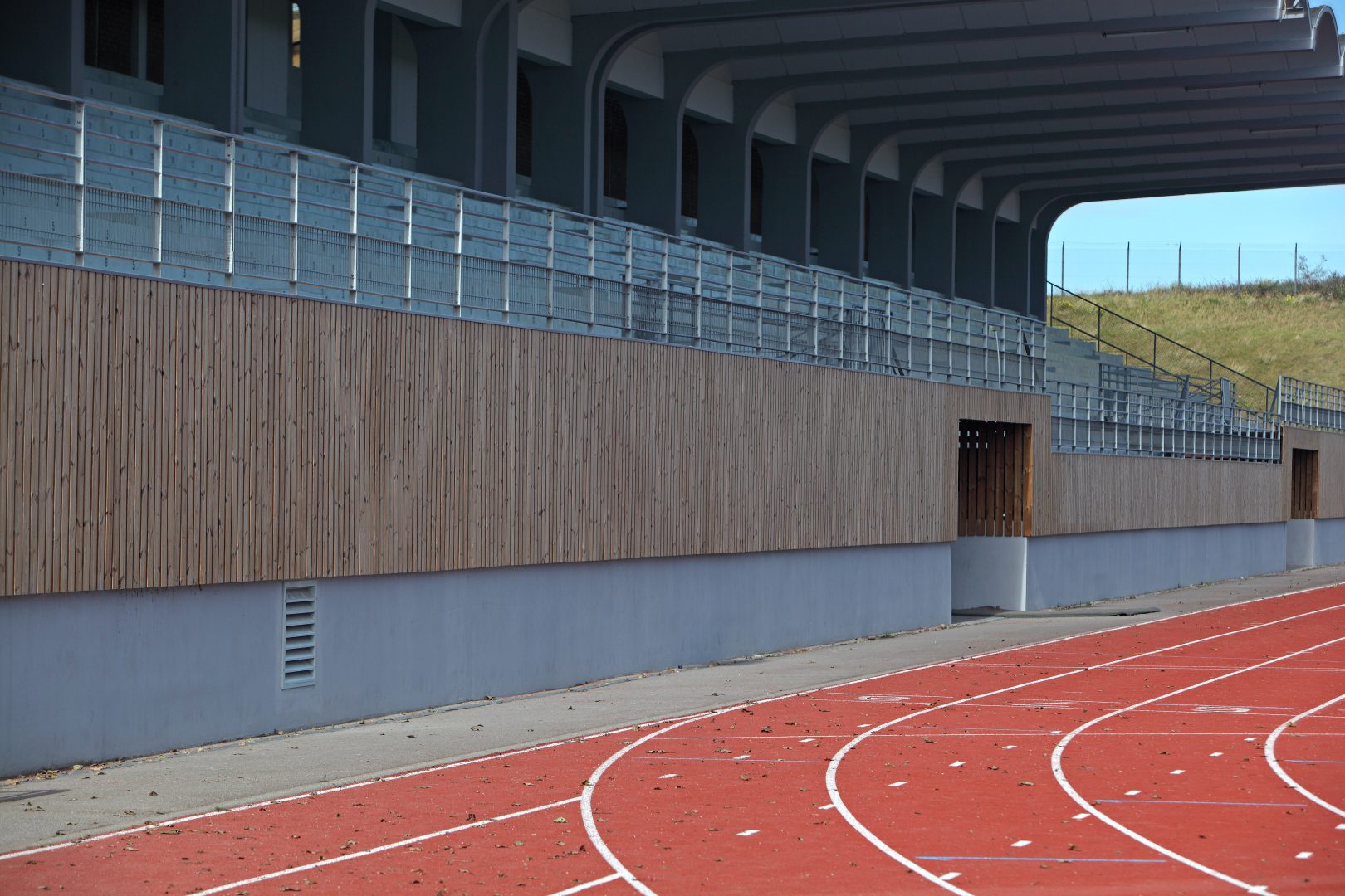 La réhabilitation comprend la modification des accès à la tribune en façade Ouest par la suppression des escaliers existants (sauf un qui sera gardé à titre de témoin du passé) pour permettre l’adossement de la salle d’athlétisme à la tribune. Le nouvel accès se fait par une passerelle accessible depuis le pignon Sud en supprimant les premiers gradins, la proximité de la piste ne permettant pas d’empiéter sur l’aire extérieure. L’accès à la salle d’athlétisme se fait par le porche d’entrée couvert par une structure bois ajourée.L’extension comprend une salle d’athlétisme avec piste de course, de saut en longueur et de saut à la perche, avec hall d’entrée et espace détente. Elle s’adosse à l’existant afin de mutualiser l’espace sous tribune regroupant les vestiaires, sanitaires/douches et stockages, utilisés par les usagers des espaces sportifs extérieurs. Ces nouveaux aménagements permettent de répondre à la réglementation relative à l’accessibilité des personnes à mobilité réduite.