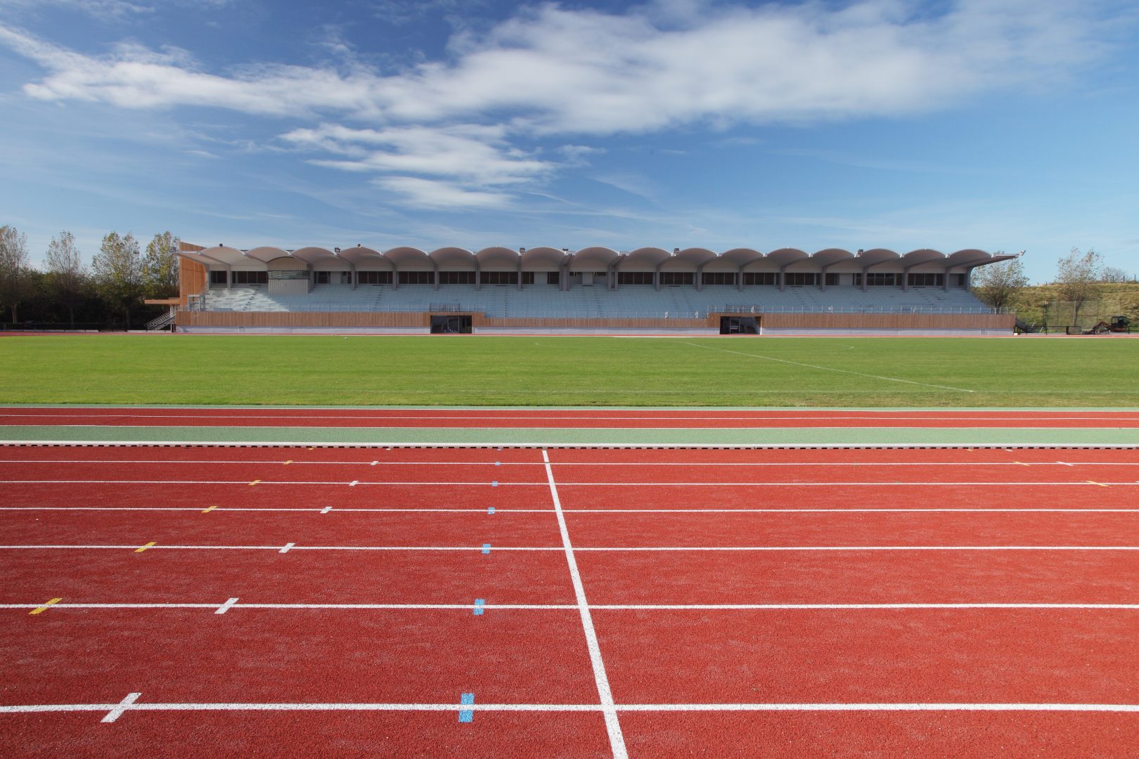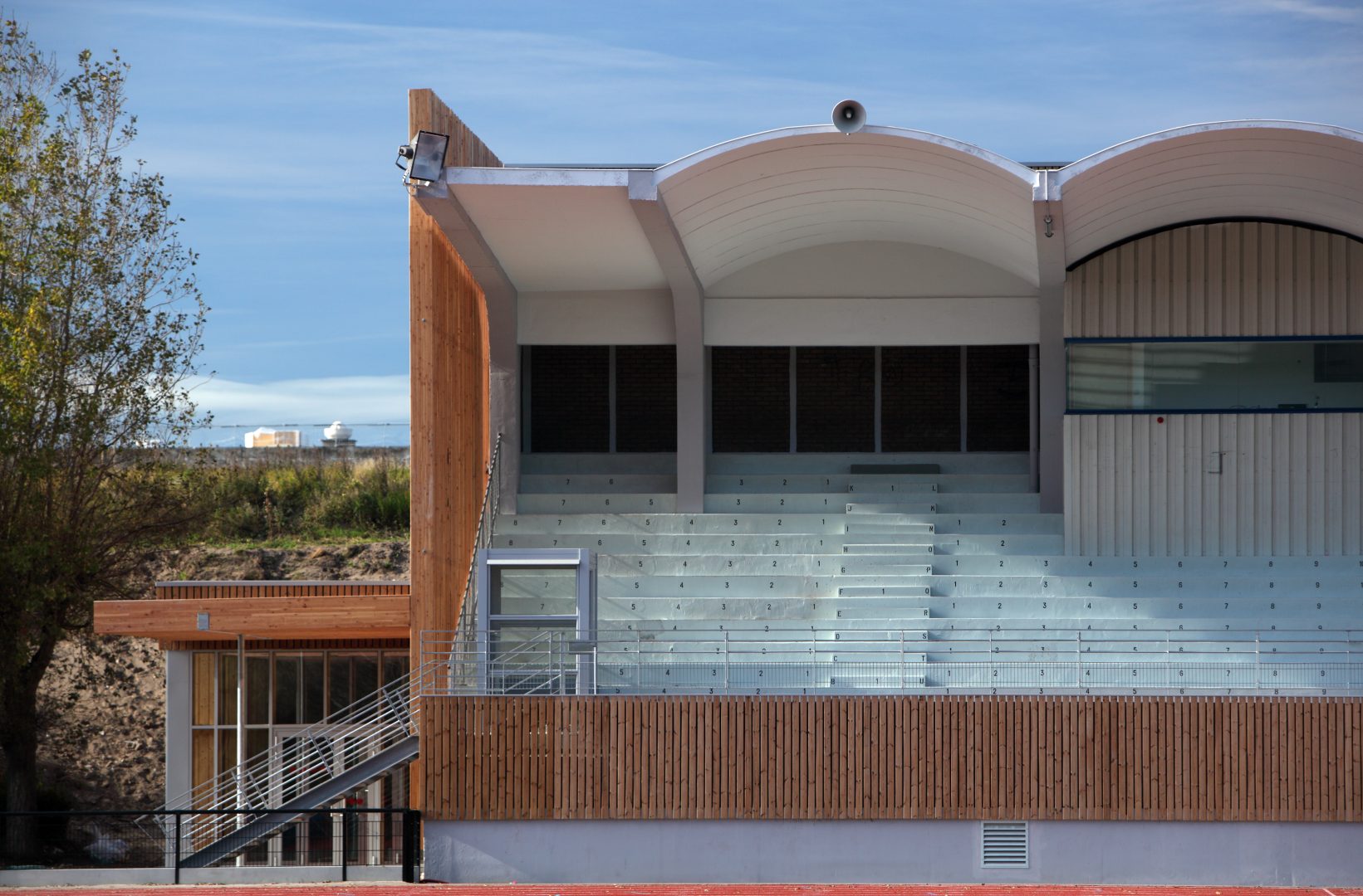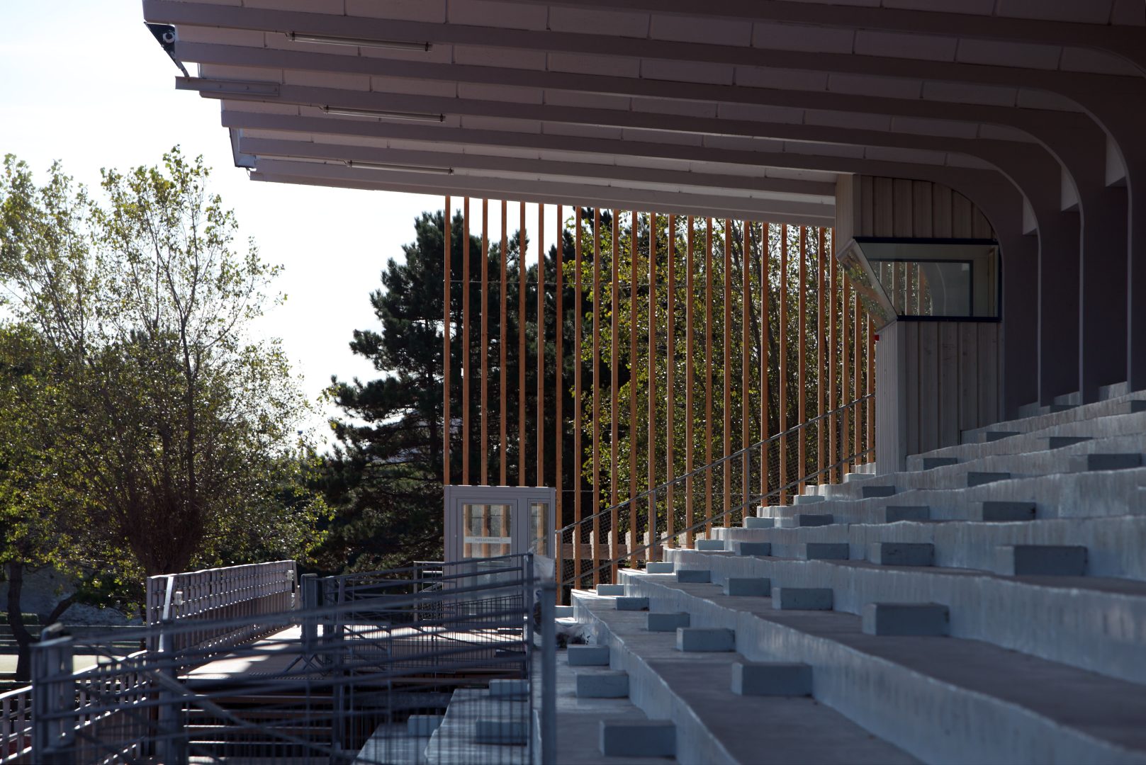 La réhabilitation comprend la modification des accès à la tribune en façade Ouest par la suppression des escaliers existants (sauf un qui sera gardé à titre de témoin du passé) pour permettre l’adossement de la salle d’athlétisme à la tribune. Le nouvel accès se fait par une passerelle accessible depuis le pignon Sud en supprimant les premiers gradins, la proximité de la piste ne permettant pas d’empiéter sur l’aire extérieure. L’accès à la salle d’athlétisme se fait par le porche d’entrée couvert par une structure bois ajourée.L’extension comprend une salle d’athlétisme avec piste de course, de saut en longueur et de saut à la perche, avec hall d’entrée et espace détente. Elle s’adosse à l’existant afin de mutualiser l’espace sous tribune regroupant les vestiaires, sanitaires/douches et stockages, utilisés par les usagers des espaces sportifs extérieurs. Ces nouveaux aménagements permettent de répondre à la réglementation relative à l’accessibilité des personnes à mobilité réduite.