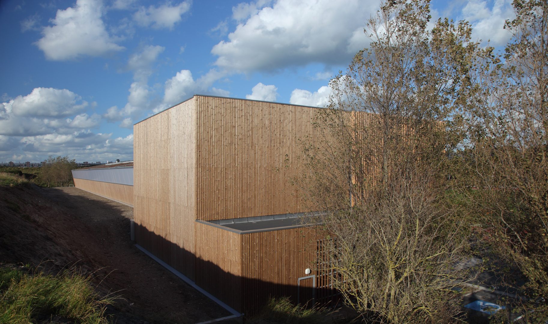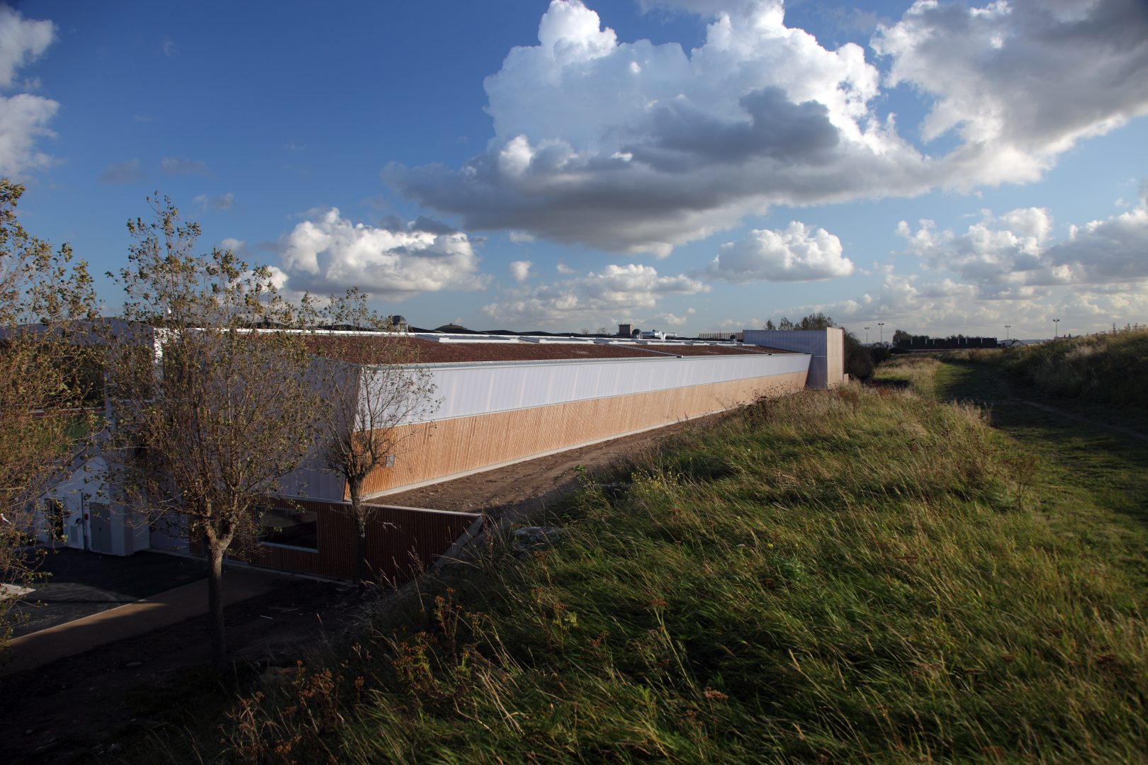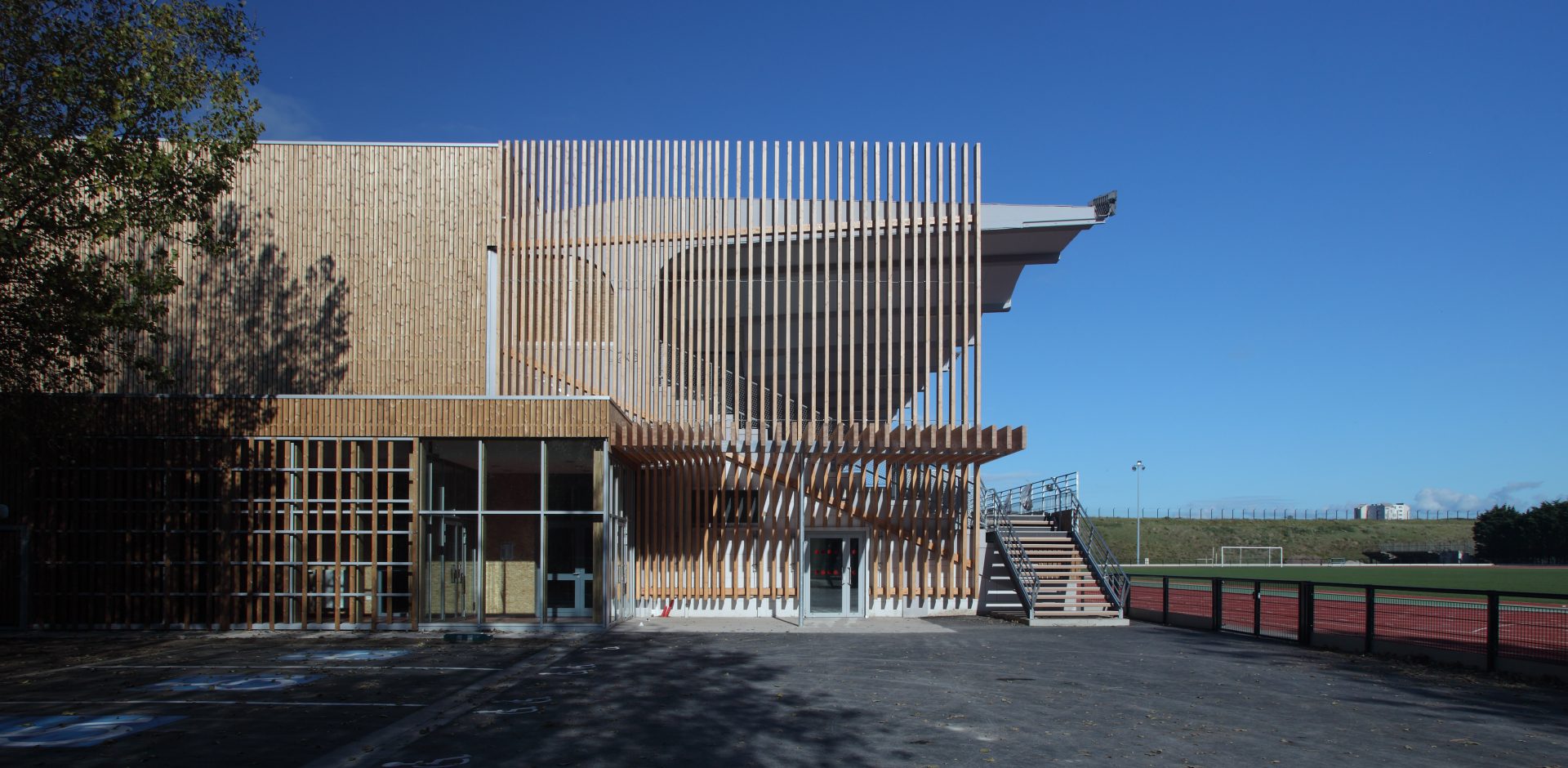 Le projet situé dans l’enceinte de la citadelle de Calais, consiste en la réhabilitation d’une tribune existante ainsi que de la construction d’une salle d’athlétisme. Notre projet présente de nombreux intérêts liés à l’environnement : l’intégration de son volume, en continuité avec les talus existants comme avec la tribune est discrète ; une toiture végétalisée permet de renforcer cette intégration subtile tout en améliorant l’isolation du bâtiment, et de limiter les rejets d’eaux pluviales sur ce site classé. La structure principale utilisent le matériaux bois comme bardage. Léger et écologique, il est le matériaux principal de ce projet. Son emploi a notamment permis la construction de portiques en bois lamellé collé qui viennent s’adosser intelligemment sur la diagonale de la tribune existante, et qui limitent ainsi l’importance des nouvelles fondations. Enfin, pour limiter l’énergie nécessaire au fonctionnement de l’équipement, de large baies sont créées en toiture ainsi que sur les façades Nord et Est ; elles permettent un éclairage naturel du projet et participent aussi au confort des usagers. L’espace alloué à l’extension est bordé par un talus herbeux créant une ceinture périphérique suivant la limite parcellaire. Pour limiter l’étroitesse de l’espace entre l’extension et le talus, celui-ci a été comblé partiellement, insérant ainsi au mieux le projet dans son contexte immédiat, la couverture végétalisée de la salle assurant à son tour une continuité du végétal.