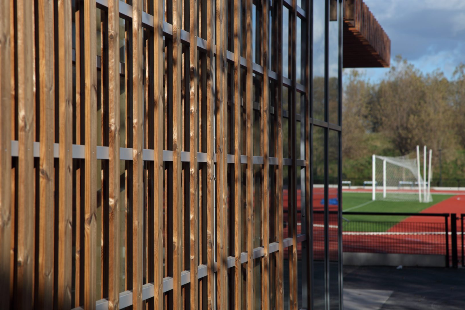 L’enveloppe du bâtiment est composée d’une ossature bois isolée revêtue d’un bardage bois naturel en pose verticale ajourée pour les parties opaques et d’un bardage polycarbonate opalin pour les parties claires. La lumière naturelle est un élément fondamental pour une pratique sportive optimale, c’est pourquoi le polycarbonate que l’on retrouve en bandeau sur la façade Ouest et en pignon tout hauteur sur la façade Nord est complété par une verrière zénithale filante.
